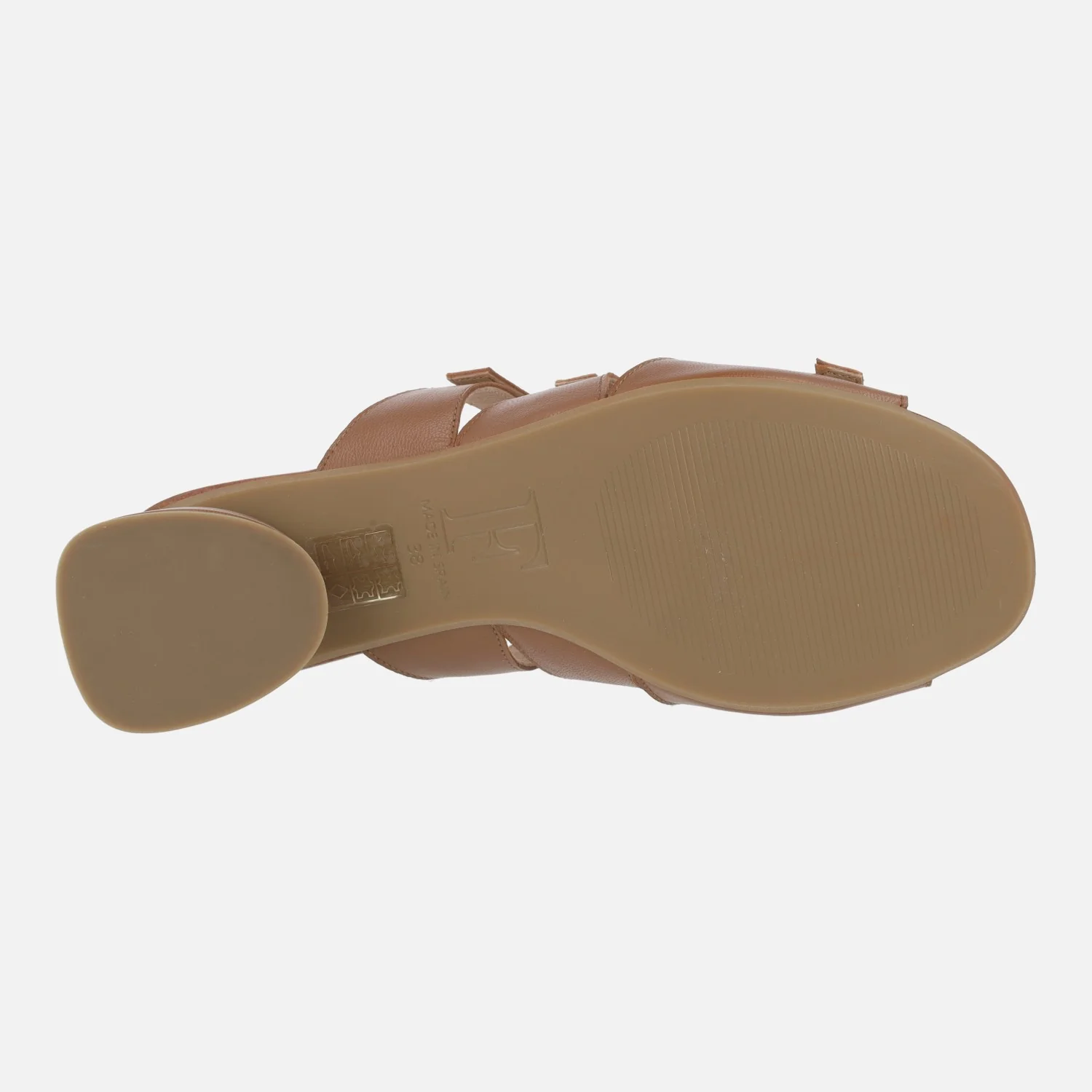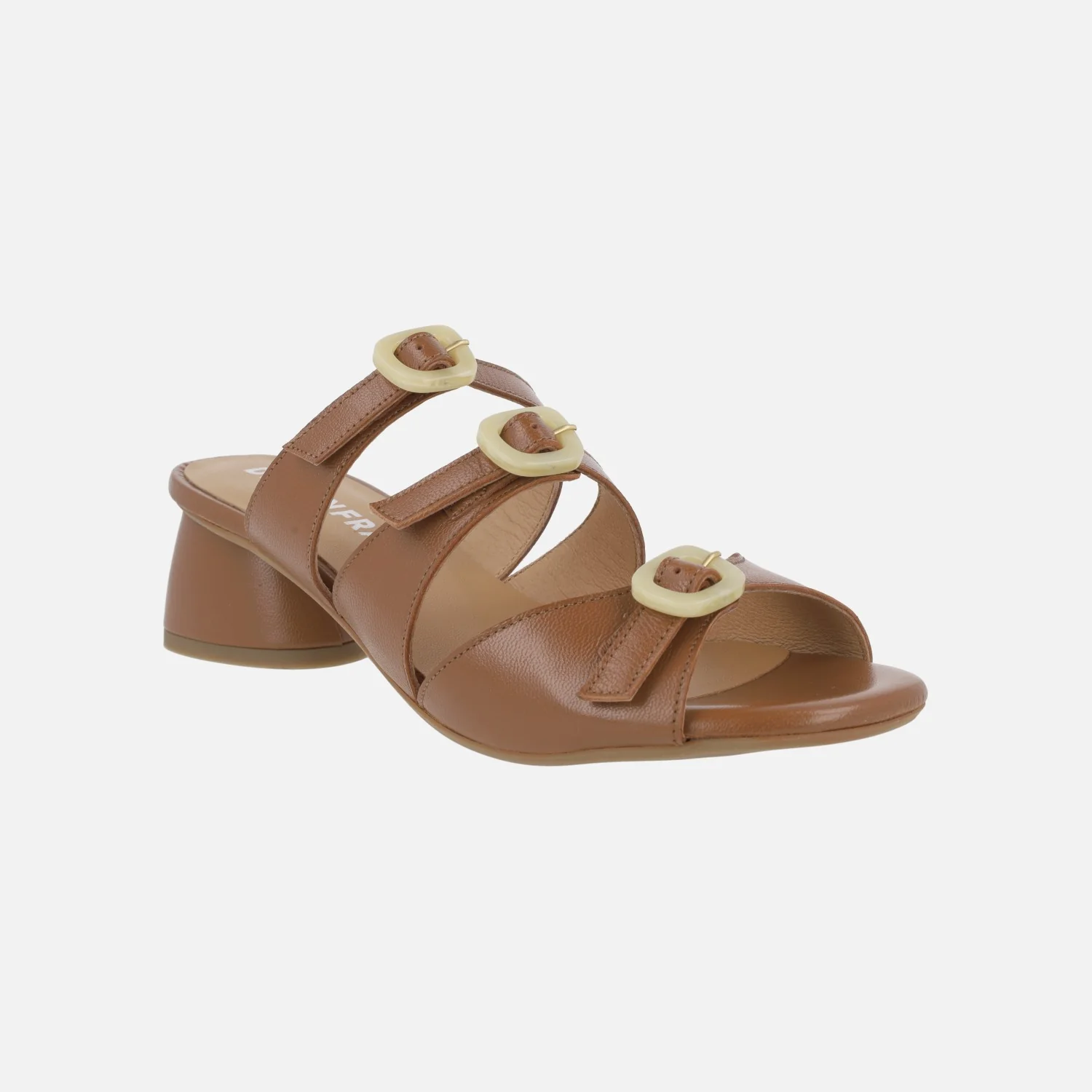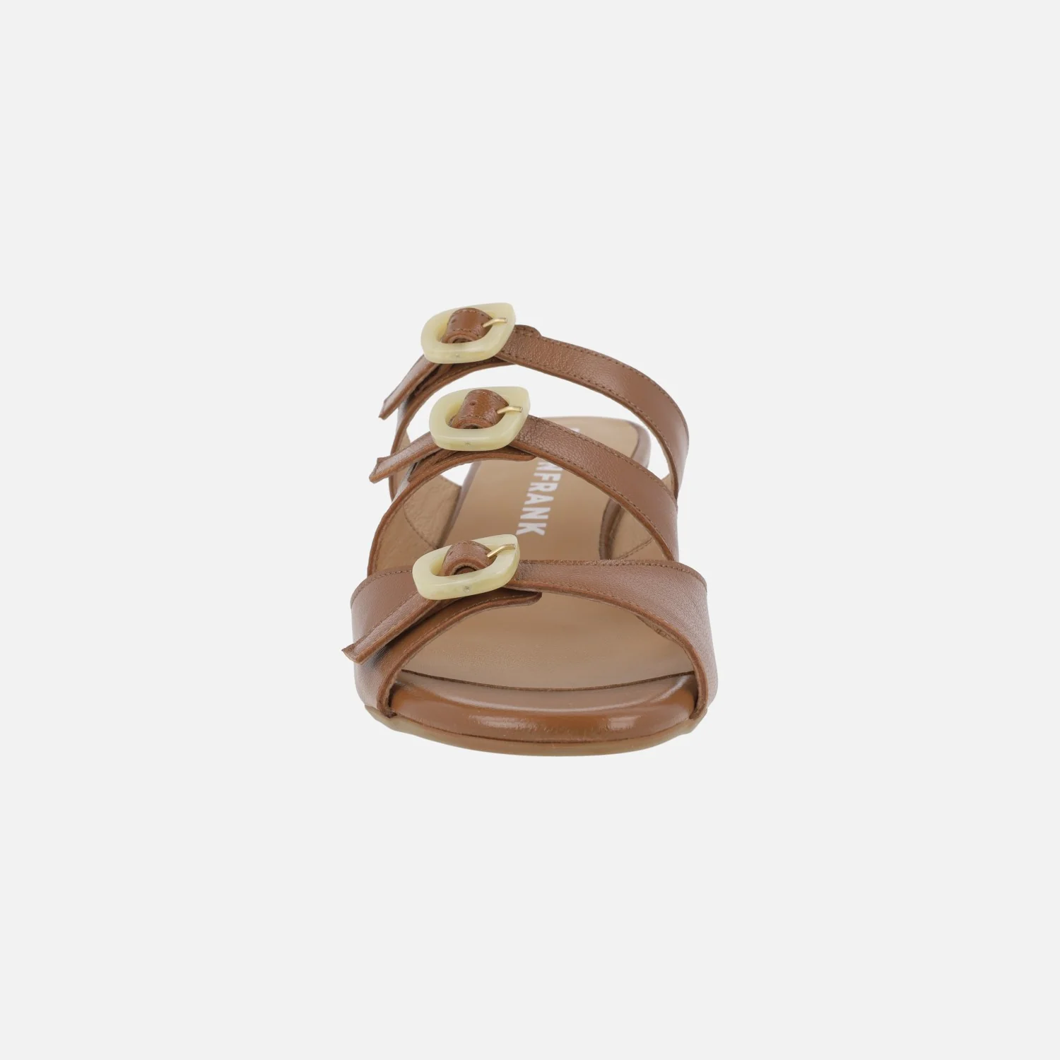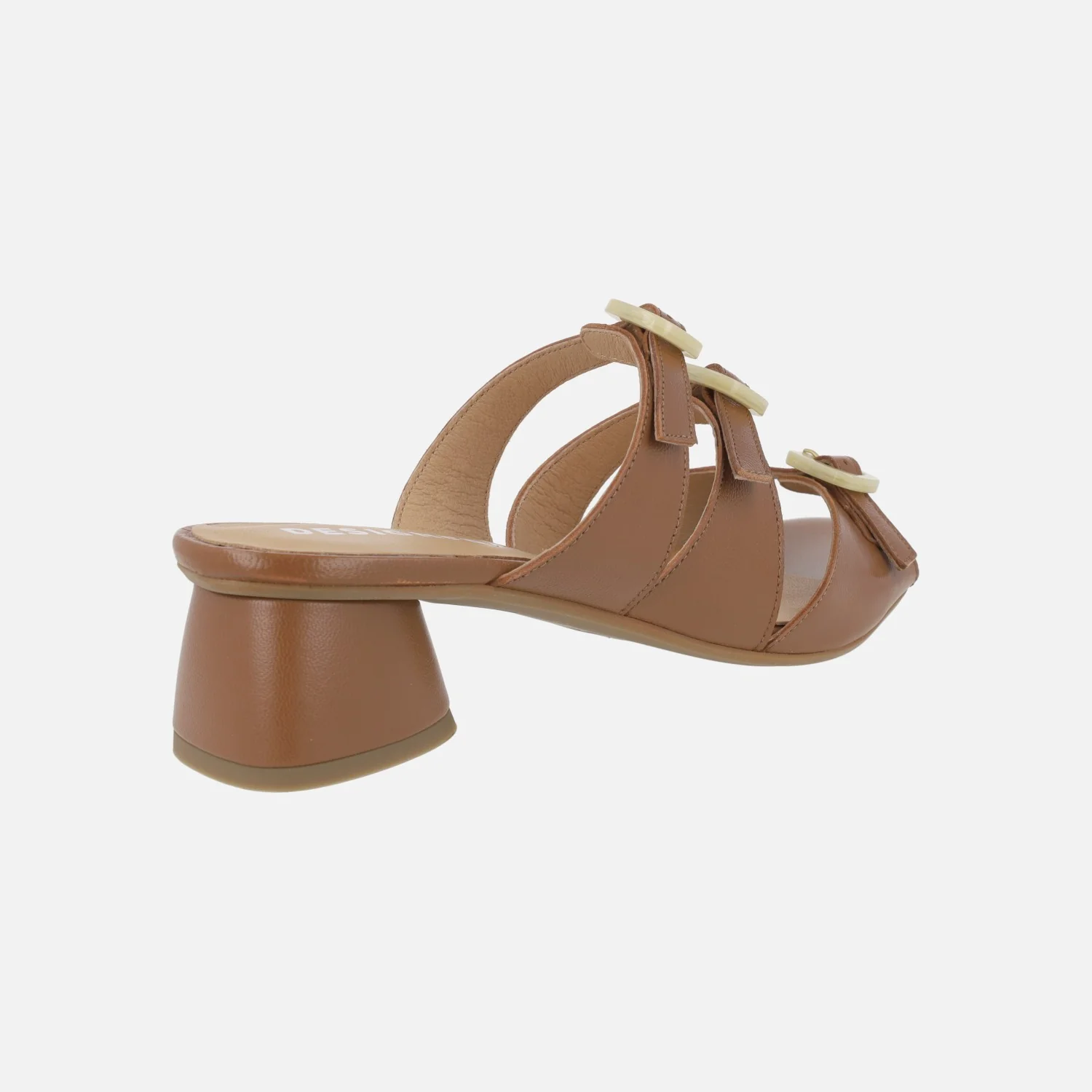Sandalias marrones de piel de la marca Design Frank modelo 27976 Cuero. Sandalias de piel con detalle de tres hebillas en nacarado beige, ajustables. Forro y planta de piel. Tacones anchos y bajos, forrados, de 5 cms de altura. Made in Spain.