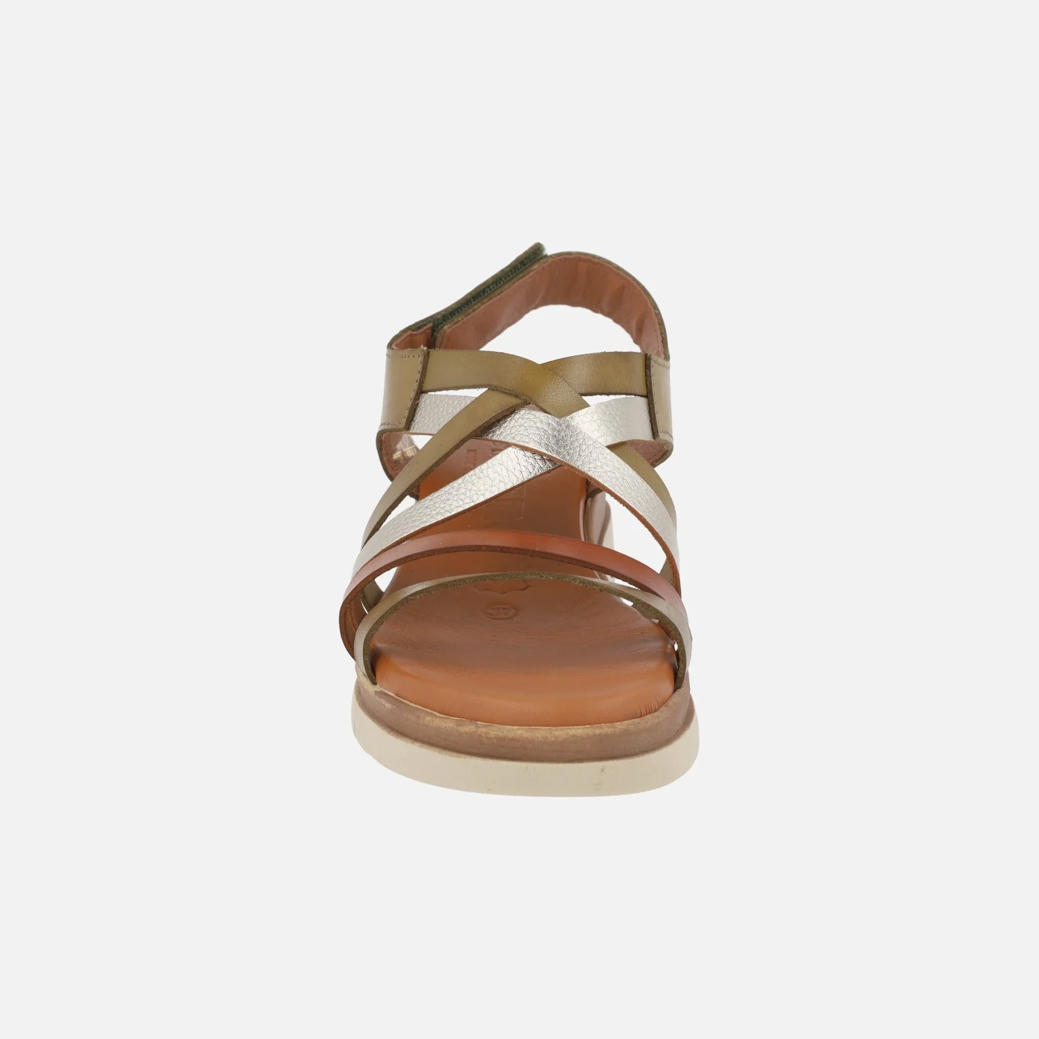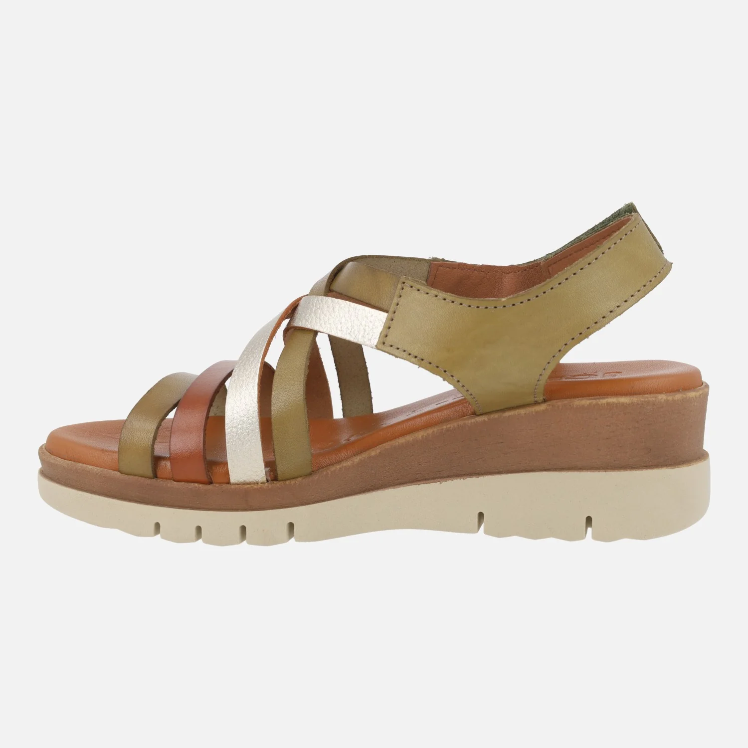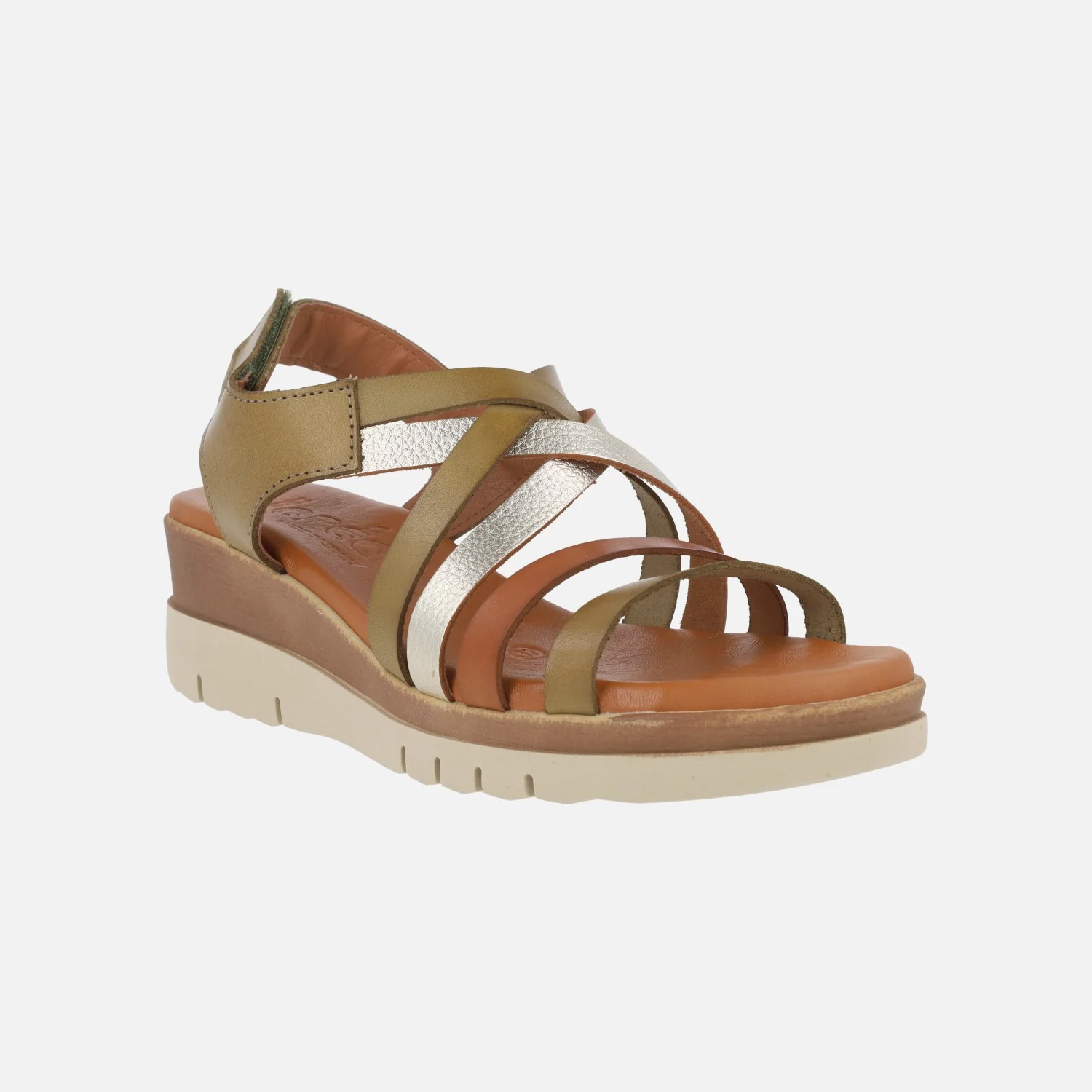 Sandalias de piel de la marca Jordana modelo 4194 Kaki. Sandalias de tiras combinadas en kaki predominantemente y también marrón y metalizados. Cierre de velcro. Interiores forrados de piel combinado con otros materiales. Cuña trasera de 5 cm de altura (2,5 cm parte delantera). Made in Spain.