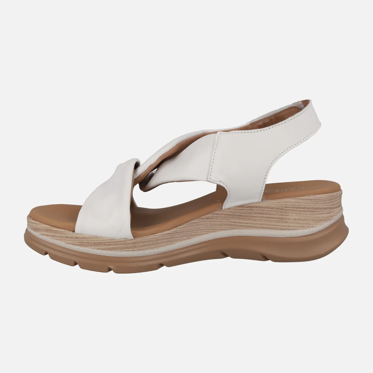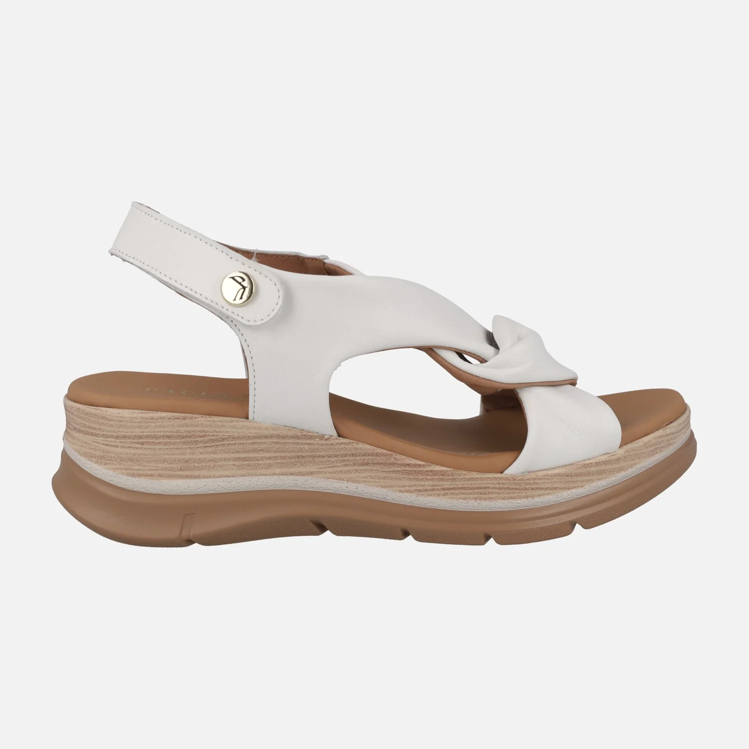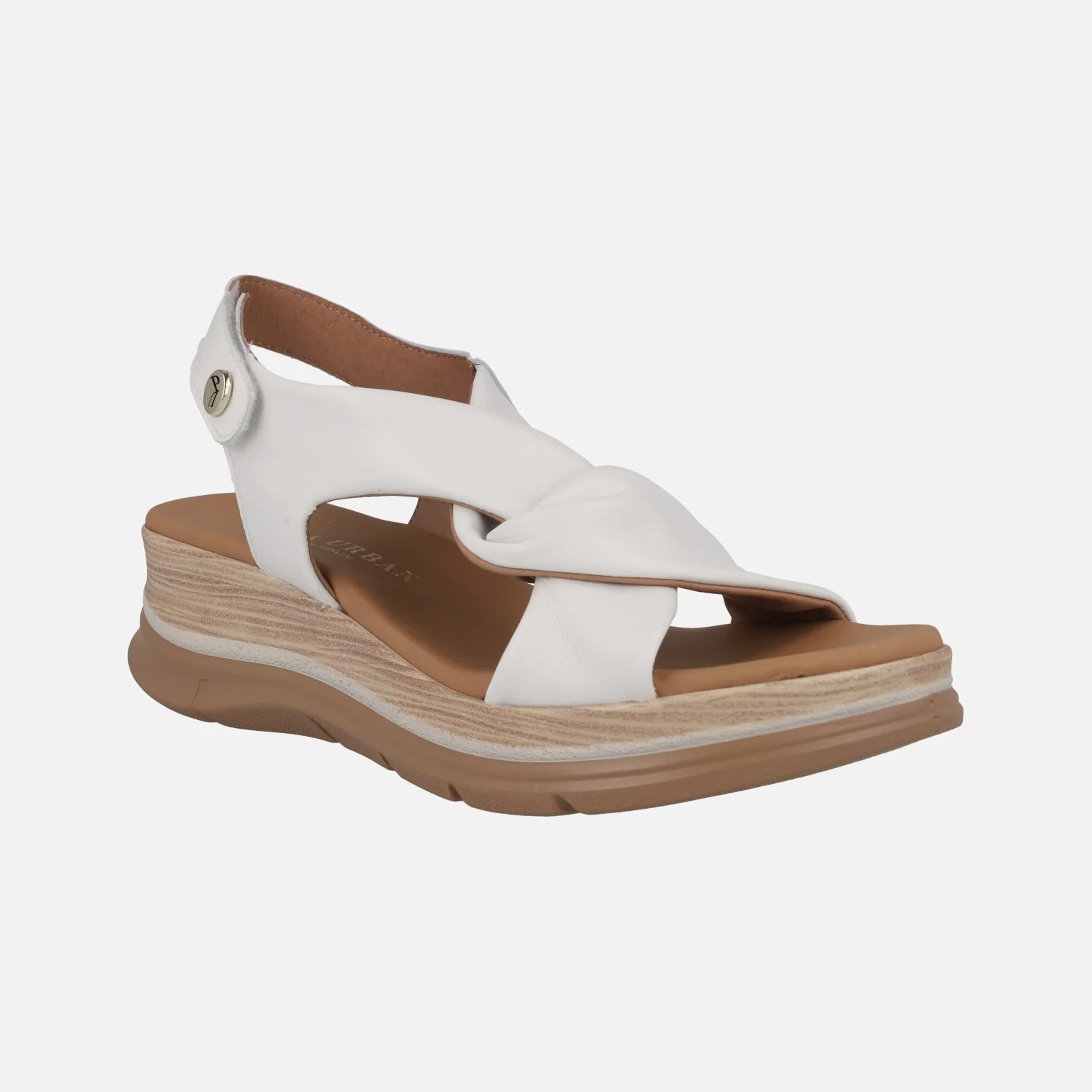 Sandalias de piel para mujer de la marca Paula Urban modelo 24-669 disponibles en Sunset blanco o camel. Cómodas sandalias de piel, con tiras entrelazadas haciendo un nudo en el empeine. Tira al talón con cierre de velcro. Forro y planta de piel. Piso ligero que imita madera, con una altura trasera de 5 cms (3 cms en la parte delantera). Paula Urban, made in SPain.