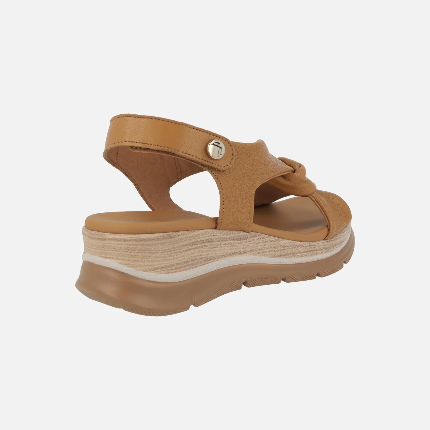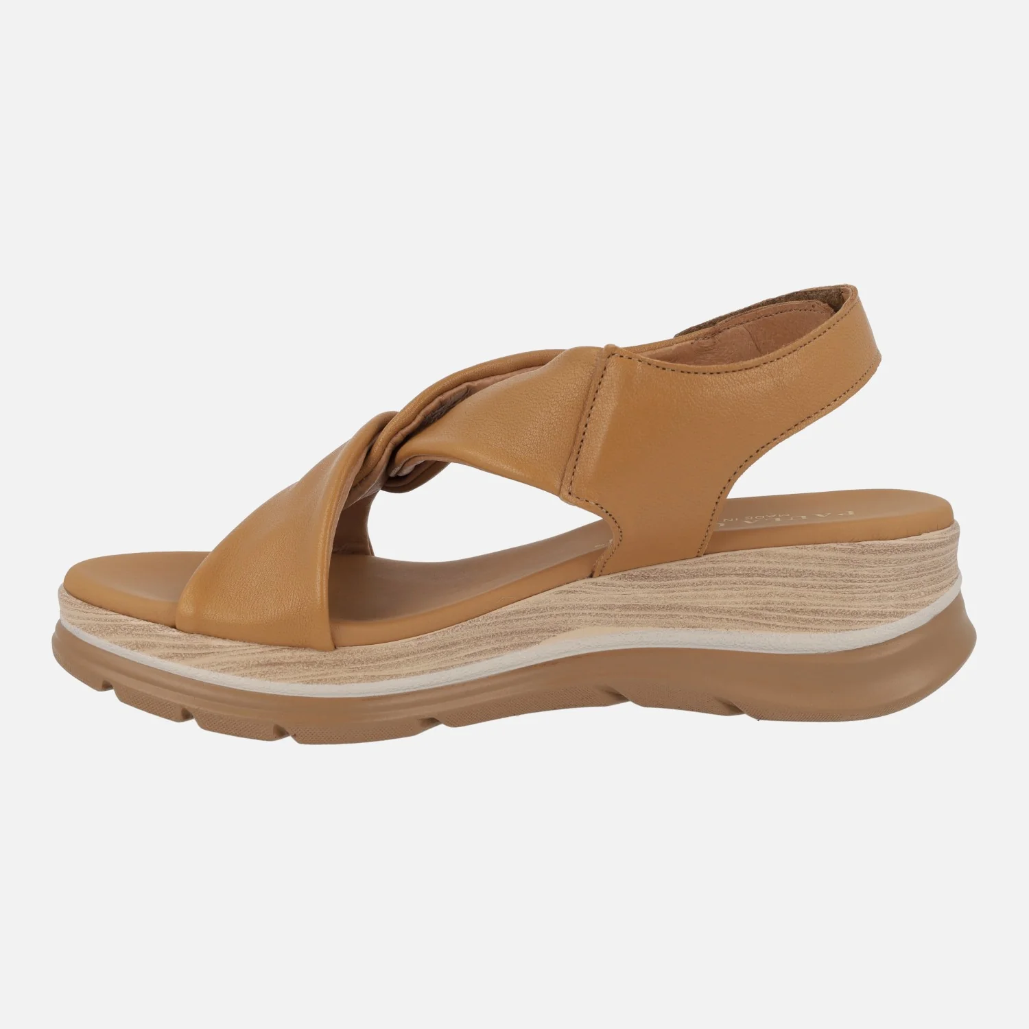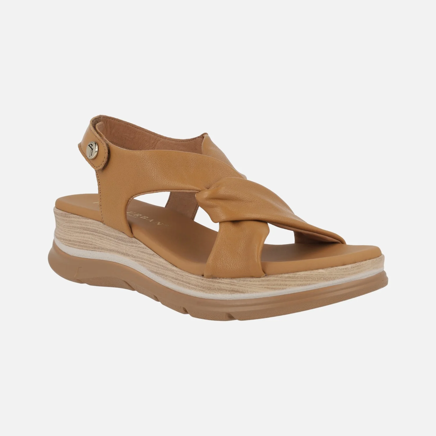 Sandalias de piel para mujer de la marca Paula Urban modelo 24-669 disponibles en Sunset blanco o camel. Cómodas sandalias de piel, con tiras entrelazadas haciendo un nudo en el empeine. Tira al talón con cierre de velcro. Forro y planta de piel. Piso ligero que imita madera, con una altura trasera de 5 cms (3 cms en la parte delantera). Paula Urban, made in SPain.