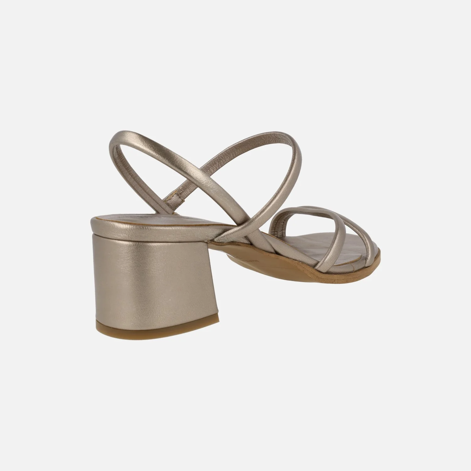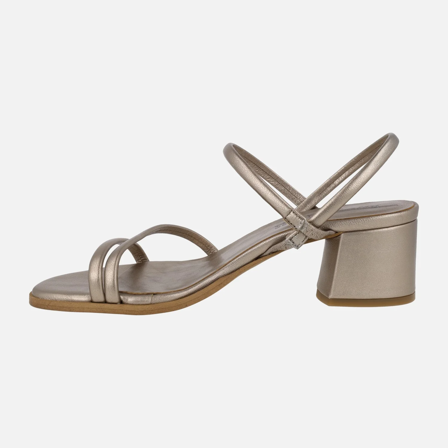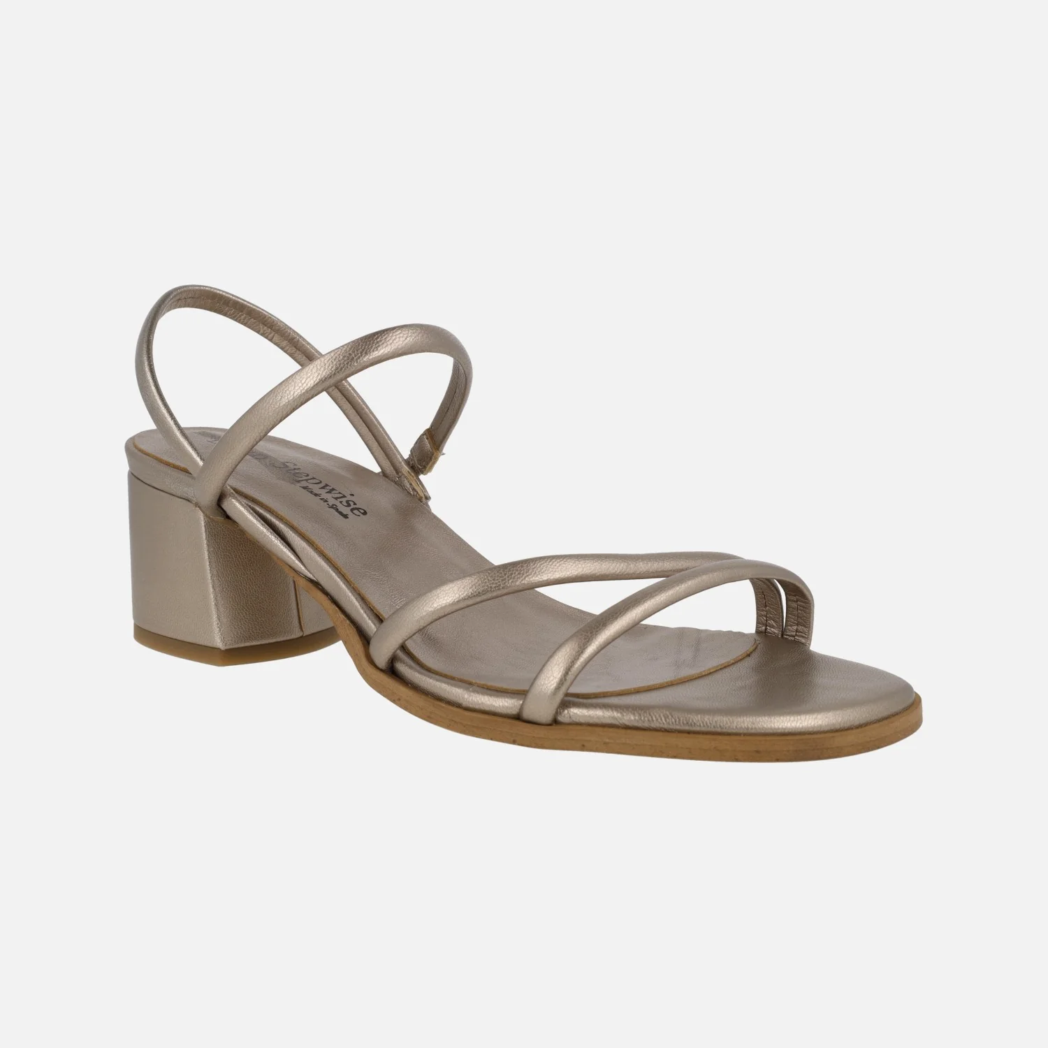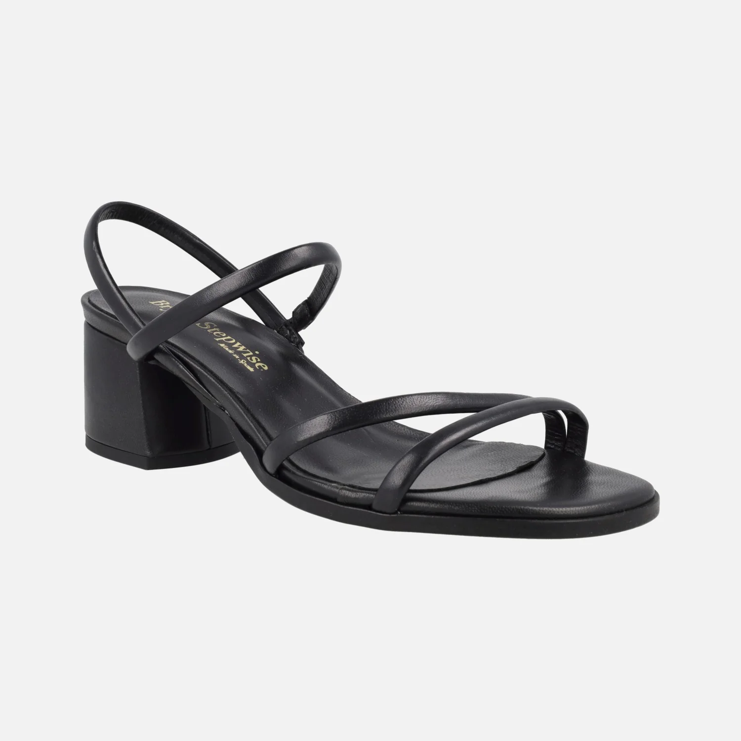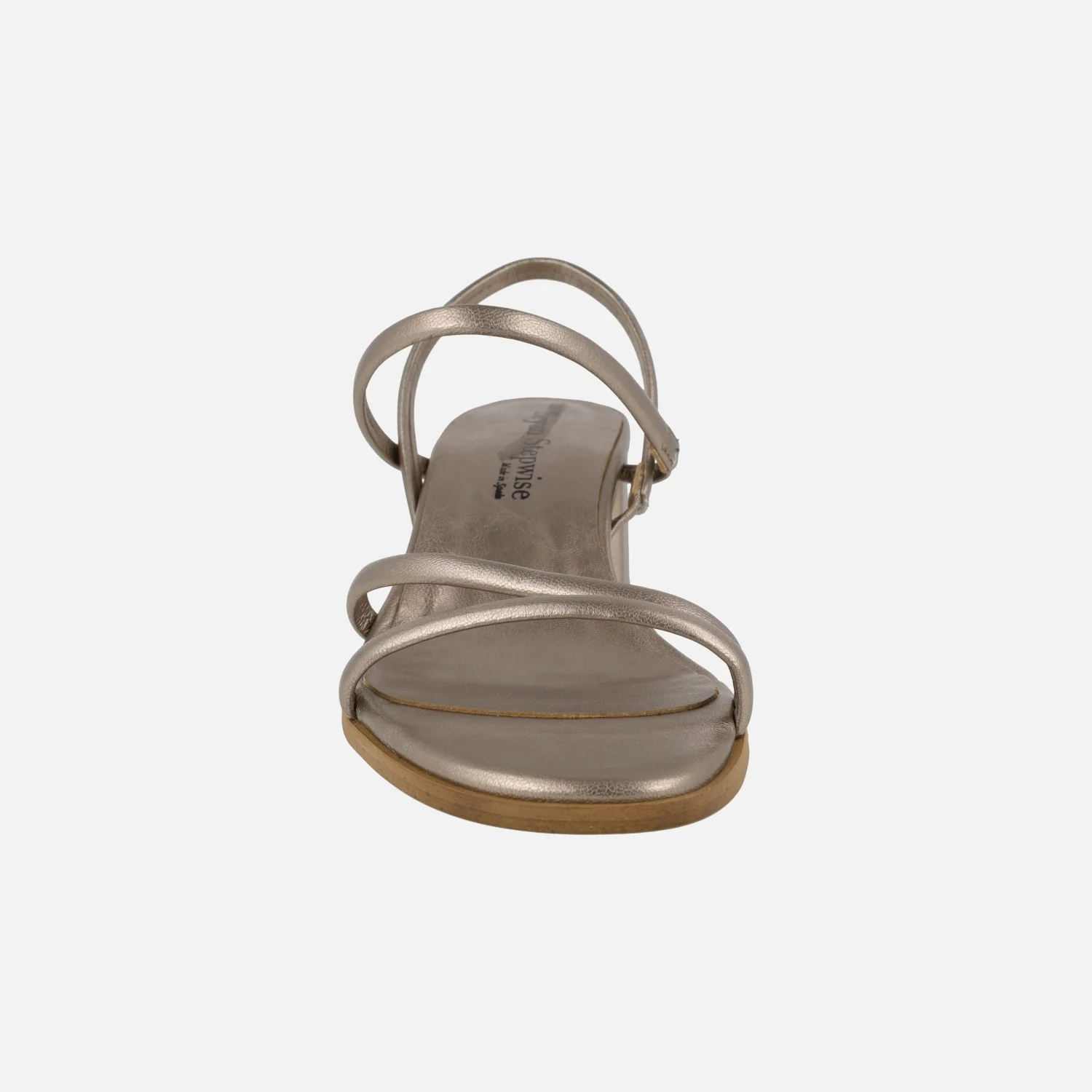 Sandalias de tiras para mujer de la marca Bryan Stepwise modelo 2614, disponibles en metalizado onix y en piel negra. Sandalias de piel con dos tiras delanteras que se juntan en un lado y dos tiras traseras que envuelven el tobillo. Interiores forrados de piel. Tacones anchos y bajos, de aproximadamente 6 cm de altura. Made in Spain.