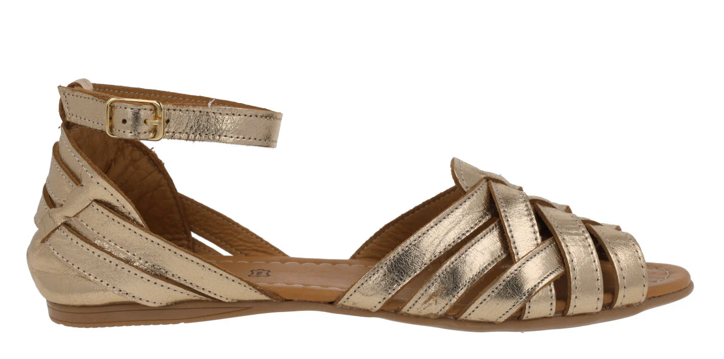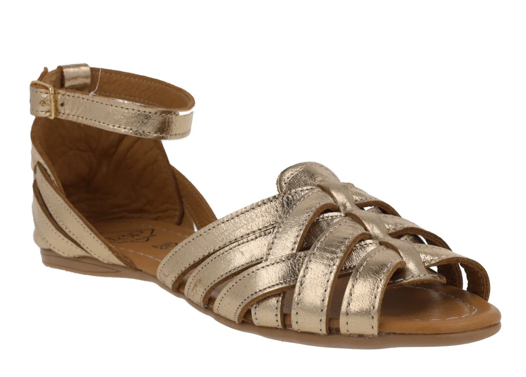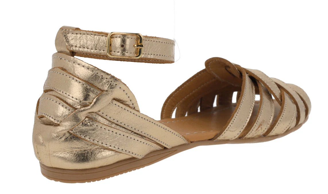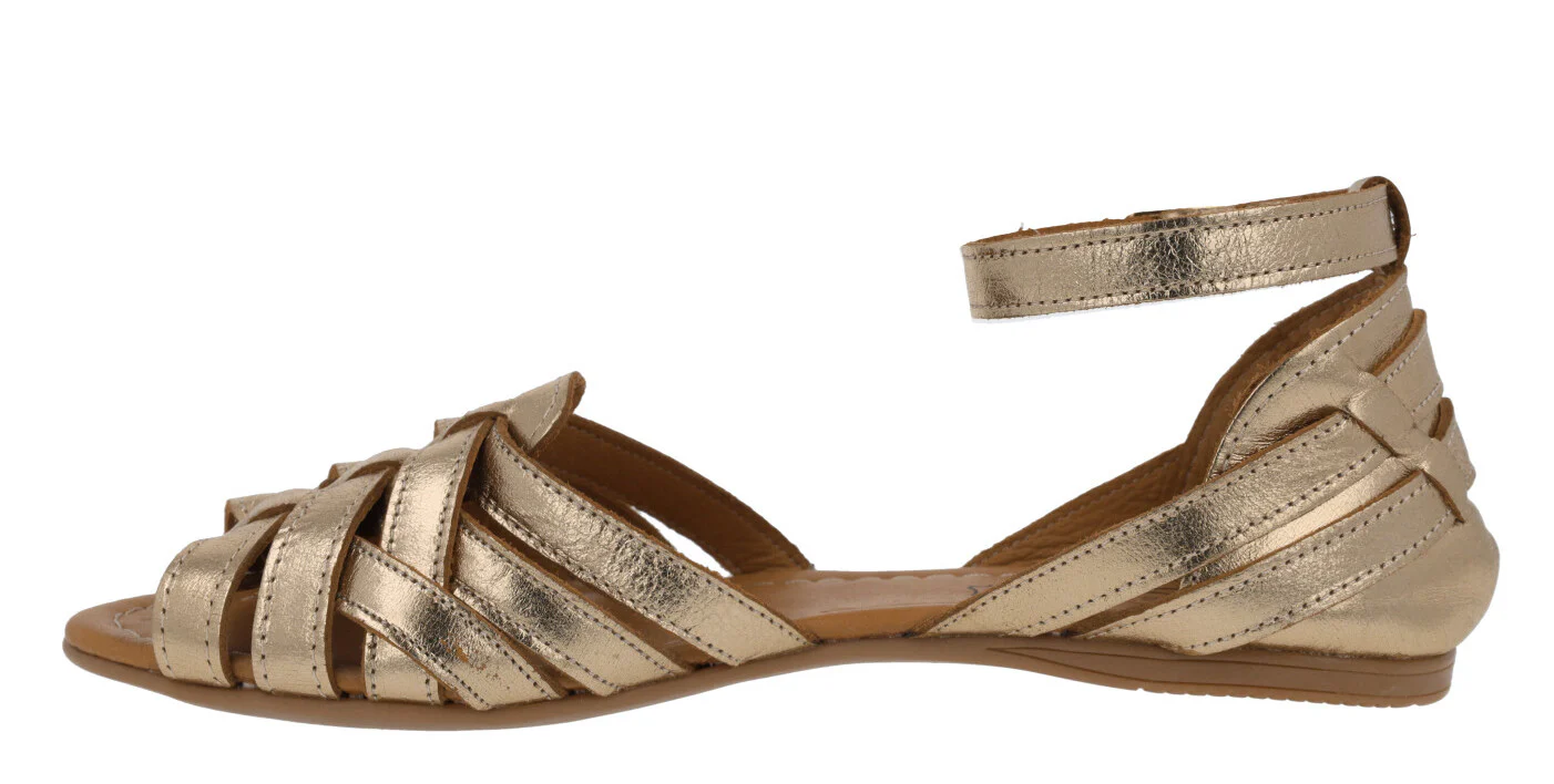Sandalias planas para mujer de la marca Top3 modelo 23487. Sandalias de piel, con múltiples tiras que se van cruzando, talonera cerrada con pulsera al tobillo y cierre de hebilla. Interiores de piel. Piso plano de goma, de apenas 1 cm de altura trasera. Disponibles en metalizado oro, verde kaki y negras.