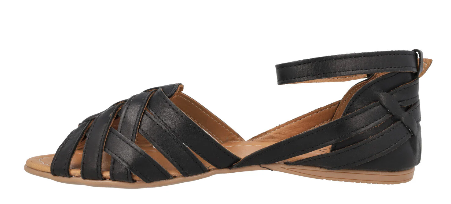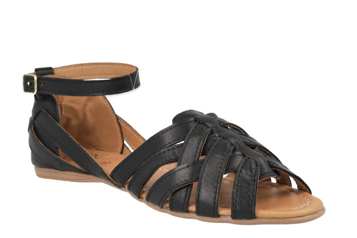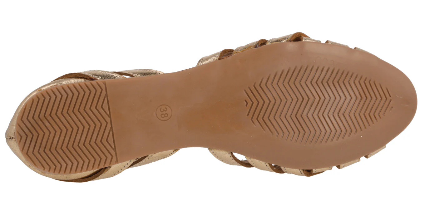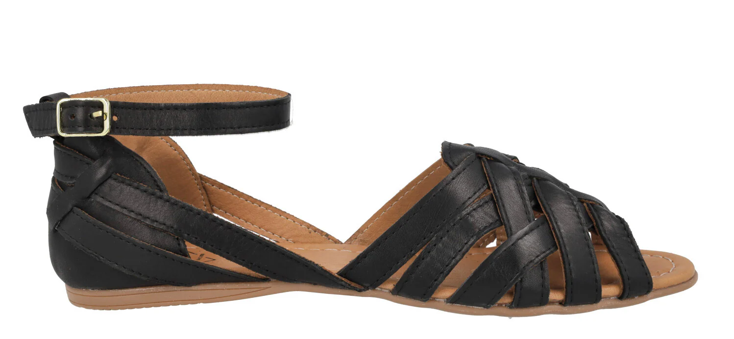 Sandalias planas para mujer de la marca Top3 modelo 23487. Sandalias de piel, con múltiples tiras que se van cruzando, talonera cerrada con pulsera al tobillo y cierre de hebilla. Interiores de piel. Piso plano de goma, de apenas 1 cm de altura trasera. Disponibles en metalizado oro, verde kaki y negras.