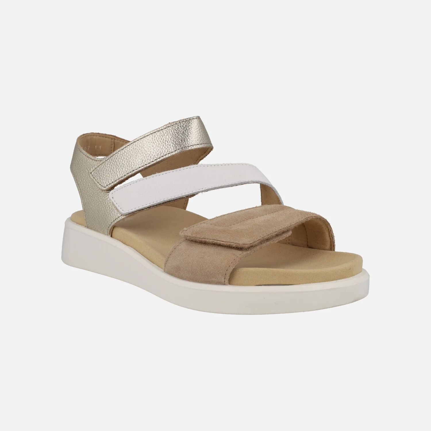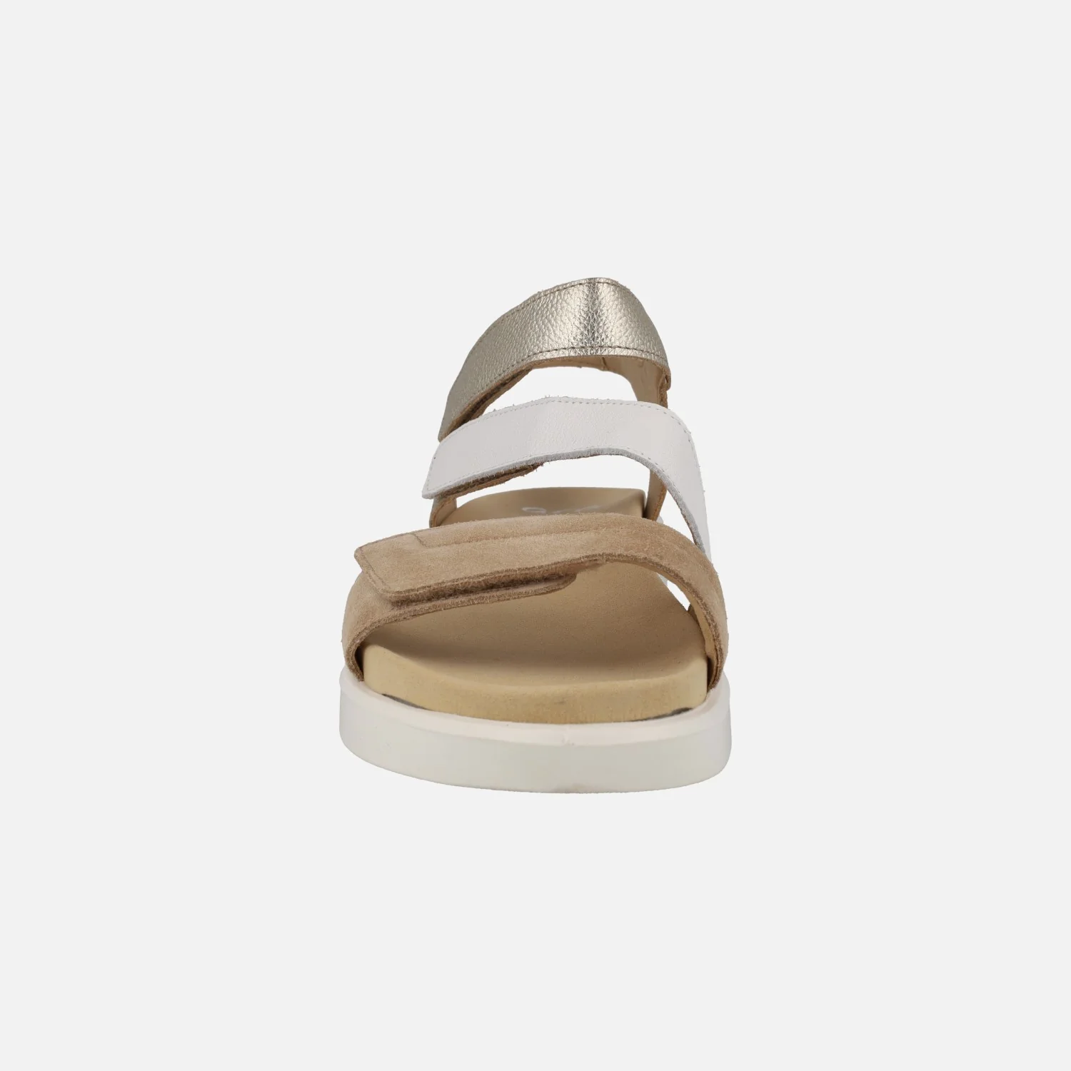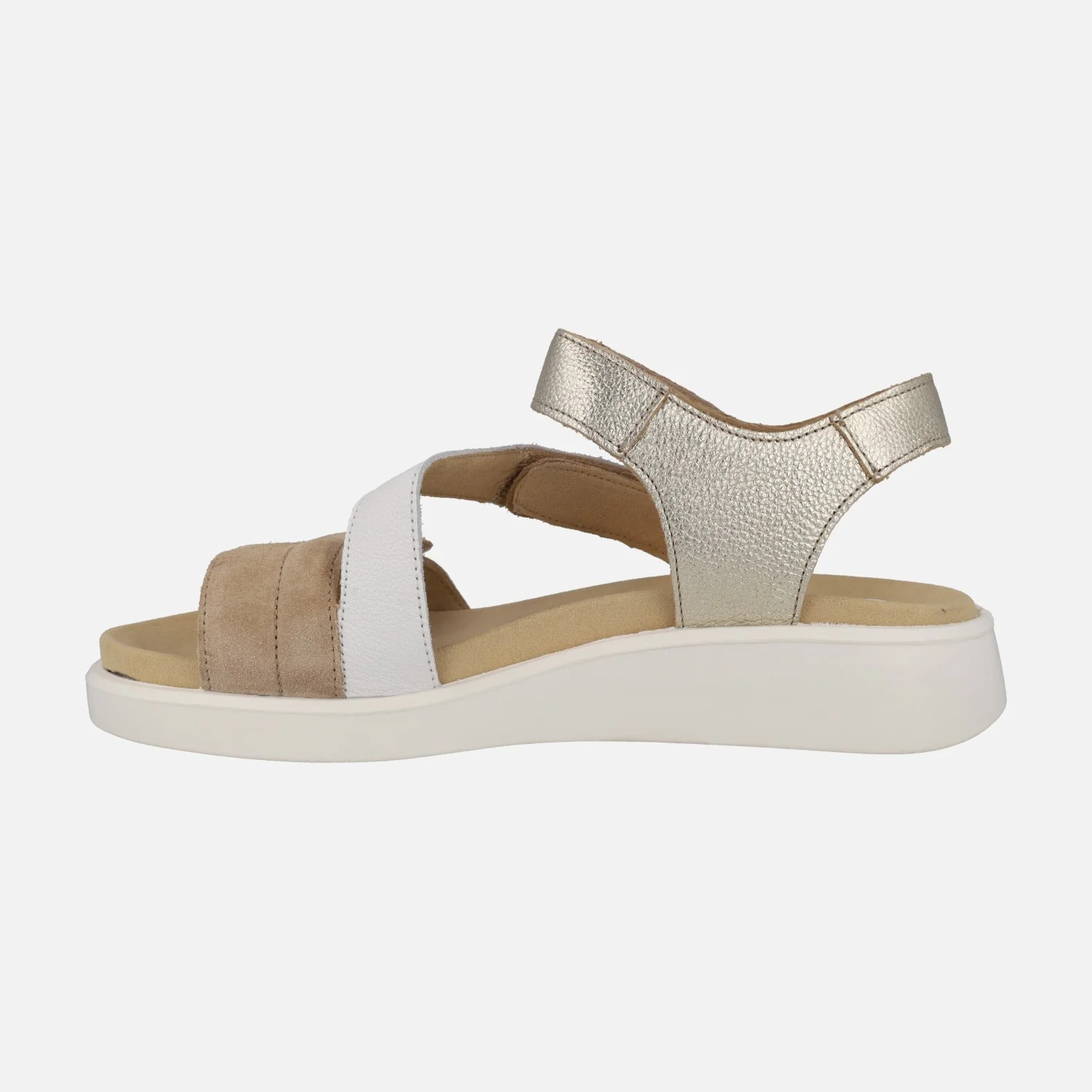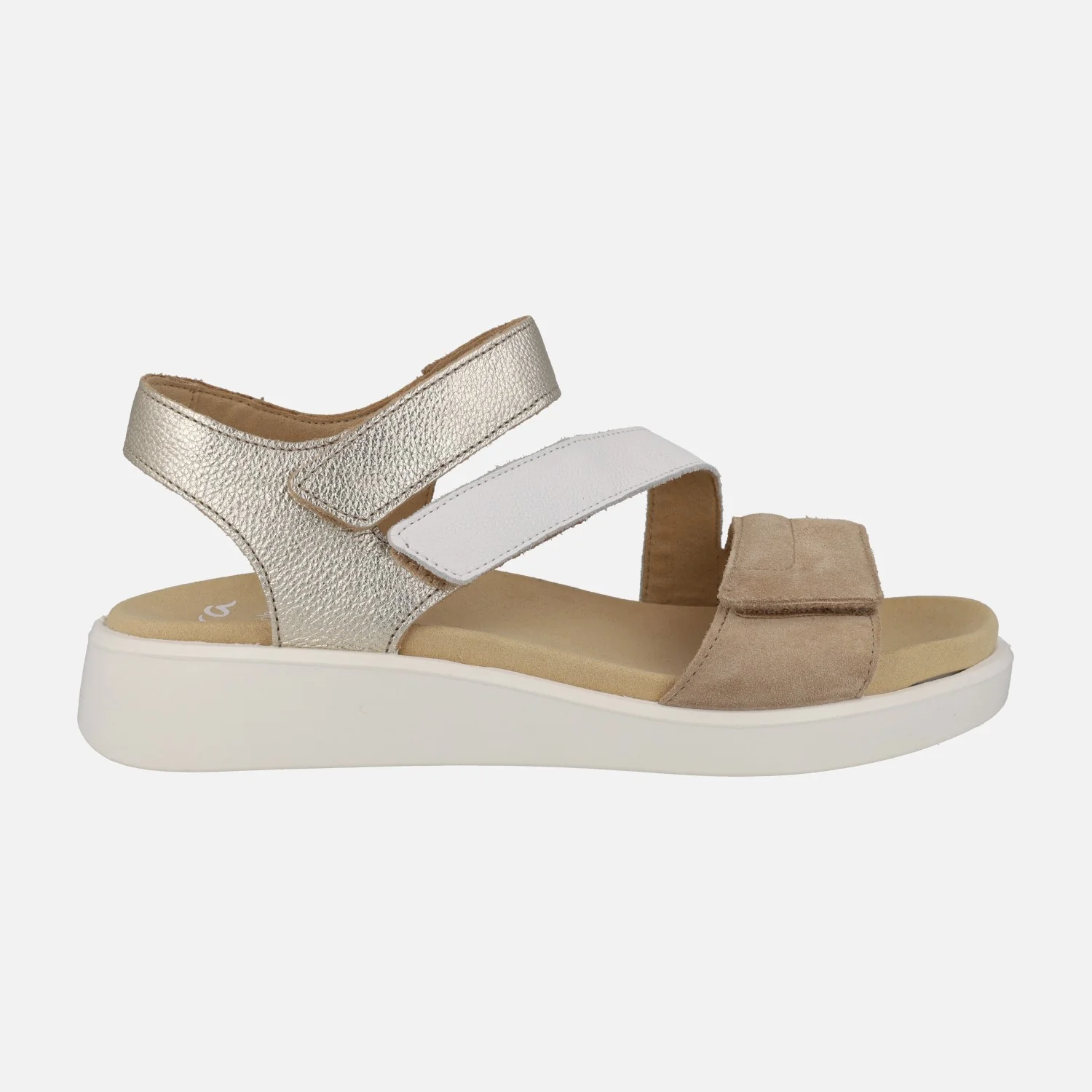 Sandalias confort para mujer de la marca Ara, modelo 1221407-11 Sand/weiss/platino. Sandalias de piel que combinan piel blanca, piel metalizada oro claro y serraje camel. Sandalias de tiras que cierran con velcros, para un gran ajuste. Interior textil, con plantillas extraíbles. Piso ligero de goma, con 3,5 cm en la parte trasera (1,5 cm parte delantera).