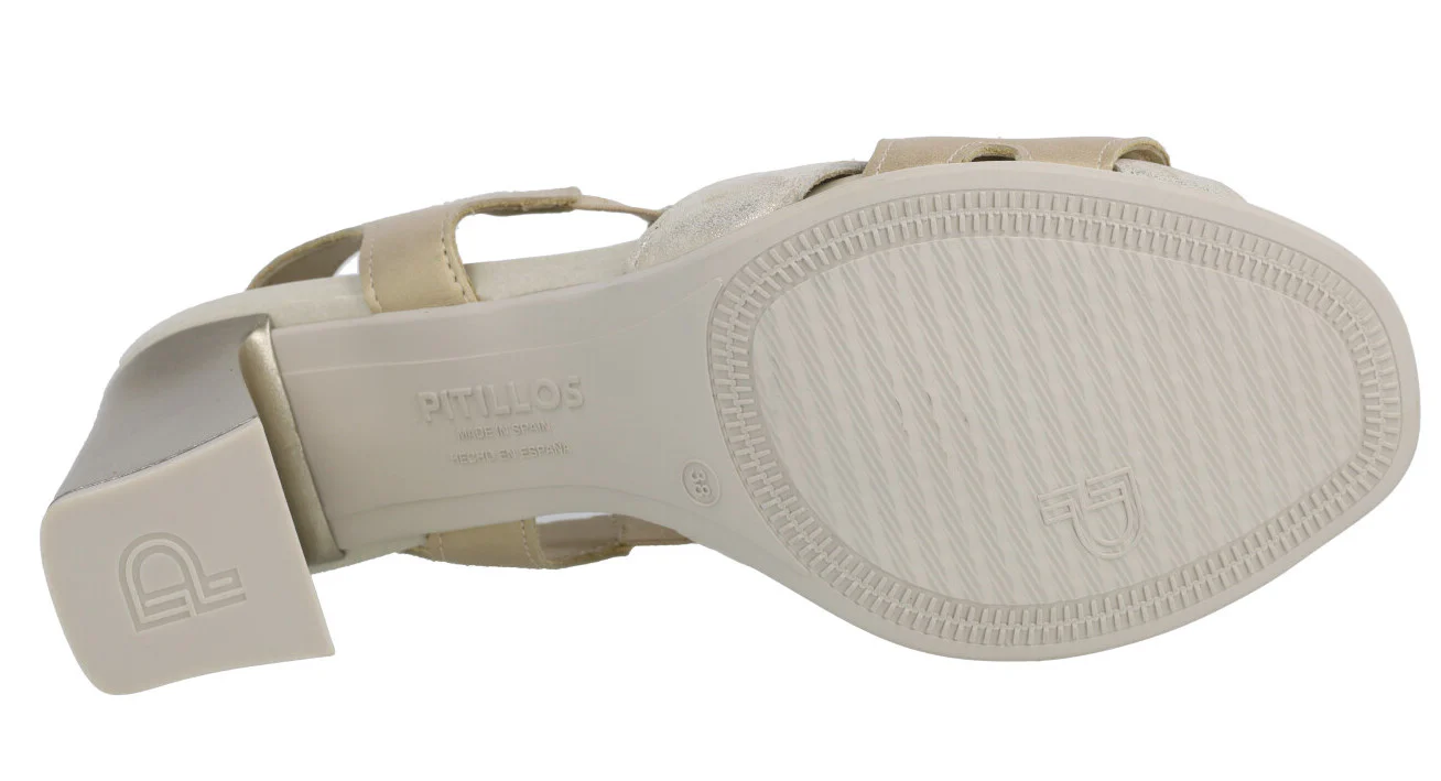 Sandalias para mujer de la marca Pitillos modelo 5185 en combinado oro. Sandalias de piel metalizada con distintos acabados en tonos oro. Lleva dos elásticos, uno en cada lateral, para mejor calce y sujección. Forro y planta en un tejido técnico compuesto por un entramado de fibras que ofrecen una gran transpiración y confort. Tacones anchos, muy estables, de 9 cms de altura (1,5 cms de plataforma delantera). Made in SPain.