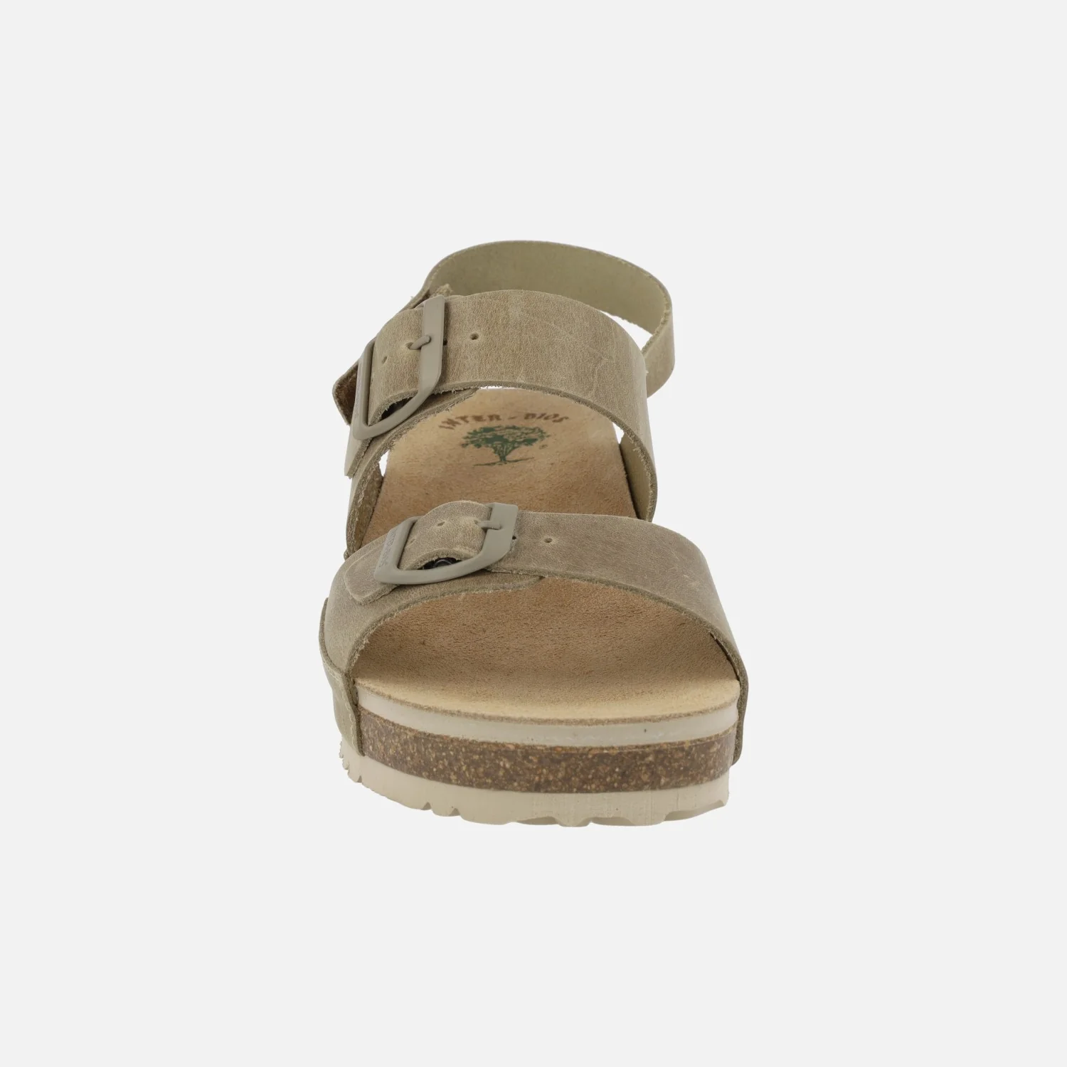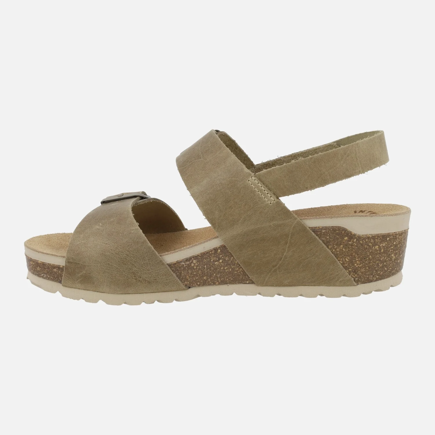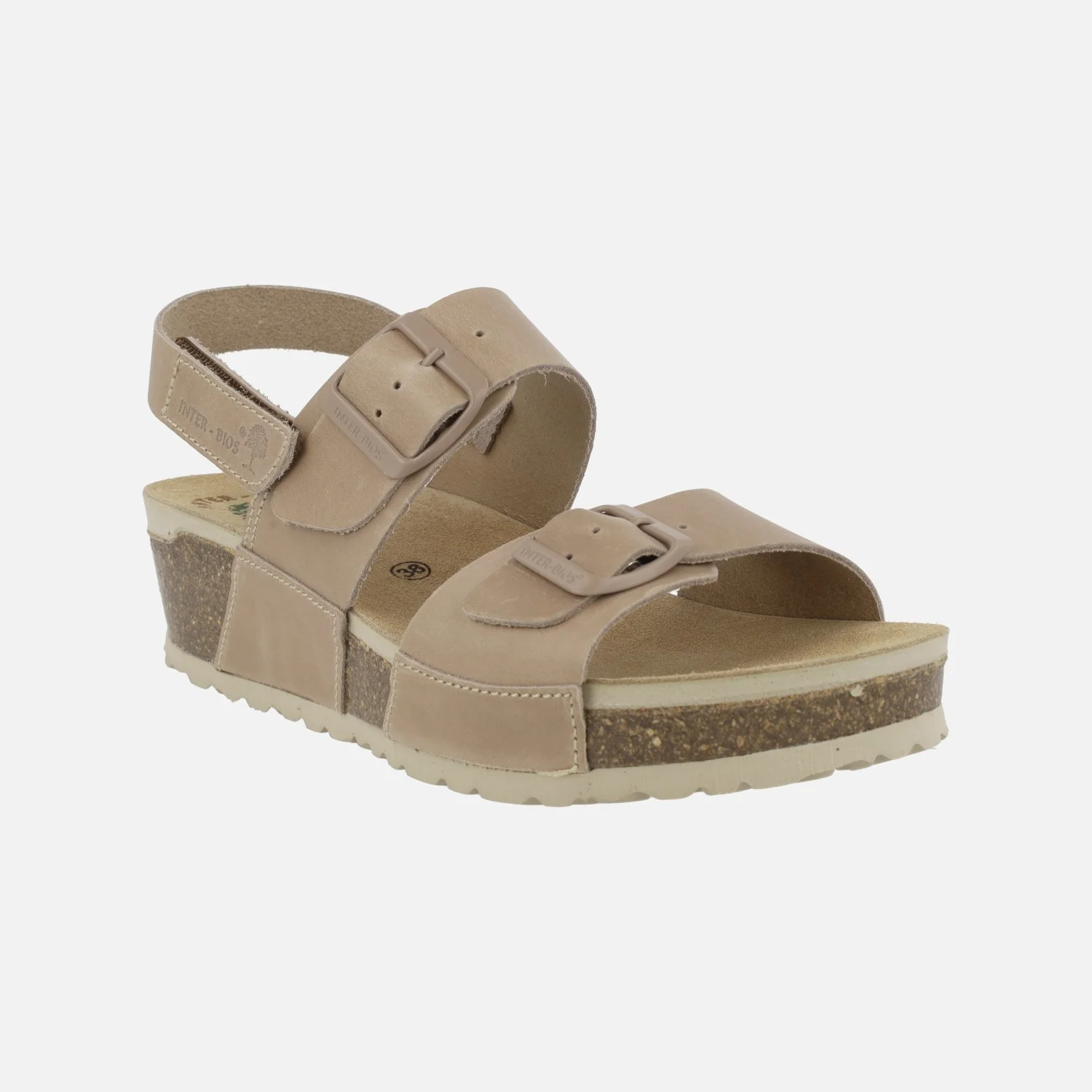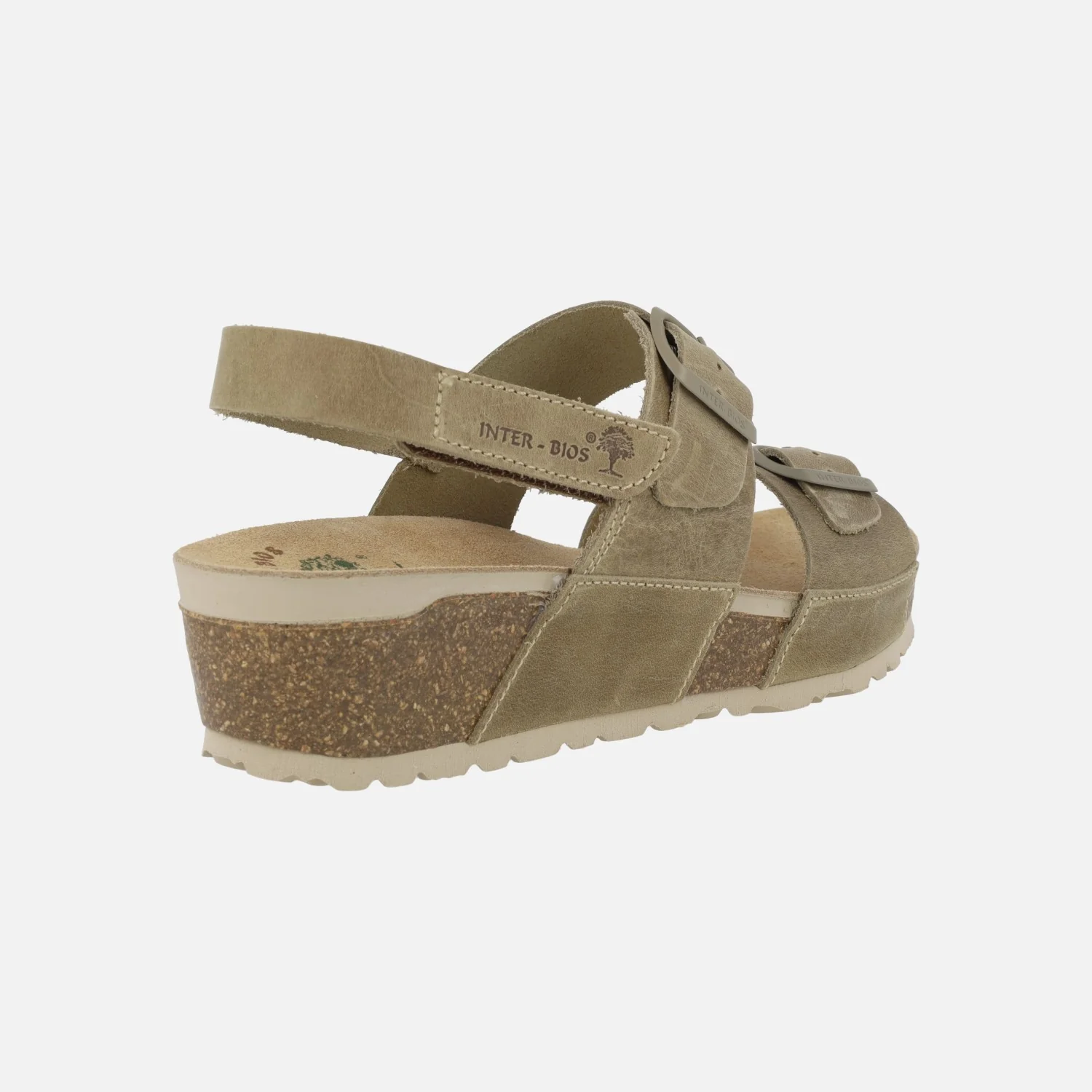 Sandalias de piel engrasada para mujer de la marca Interbios modelo 5812, disponibles en color kaki y en beige. Sandalias de piel con dos hebillas ajustables del mismo tono y una tira al talón con cierre de velcro. Interiores en piel. Cuña de corcho y suela de goma. Altura trasera 4,5 cm (2,5 cm parte delantera). Made in Spain.