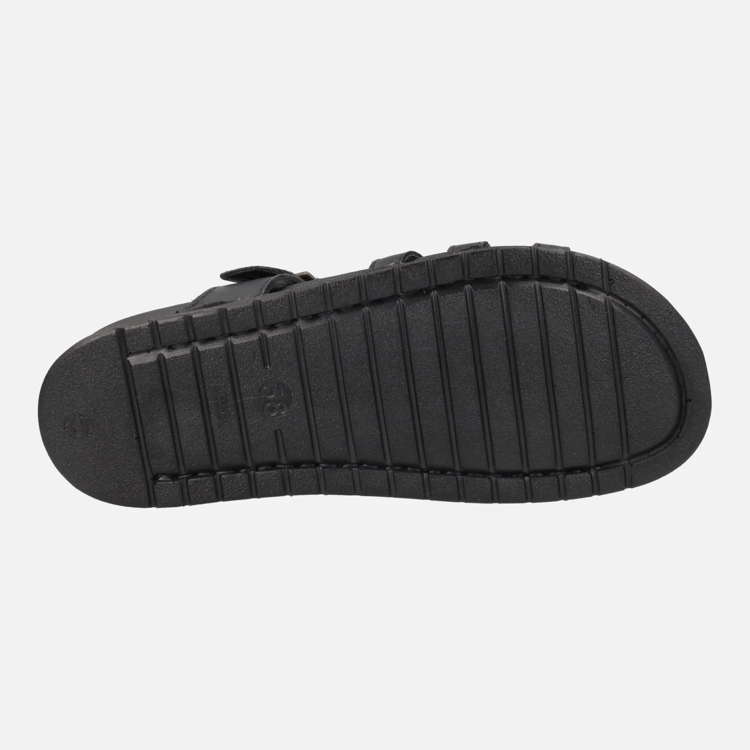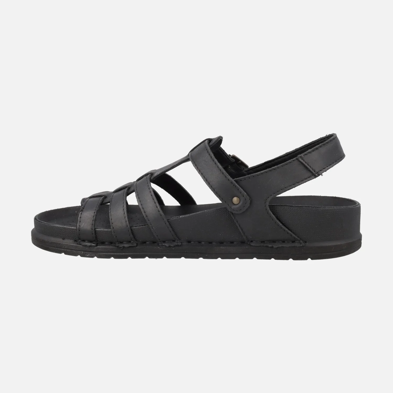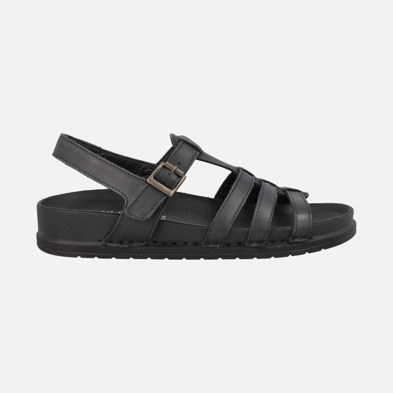 Sandalias de piel estilo cangrejeras de la marca Walk & Fly, modelo 7447 500, disponibles en piel negra y en nobuck canapa (beige taupe). Sandalias con cierre de hebilla ajustable al tobillo. Interiores forrados de piel. Piso de goma, con una altura trasera de 3 cm, 1,5 cm en la parte delantera. Planta BIO.