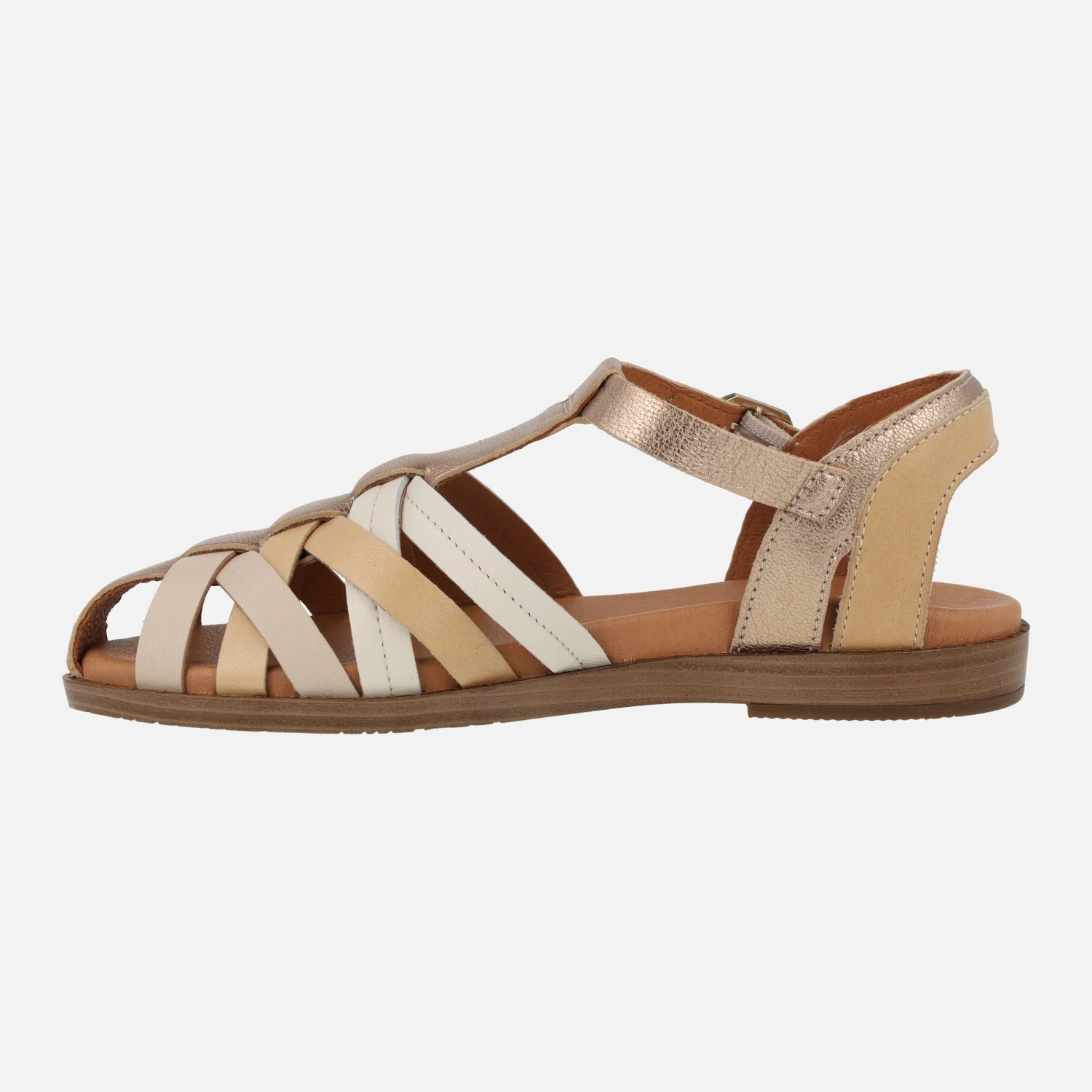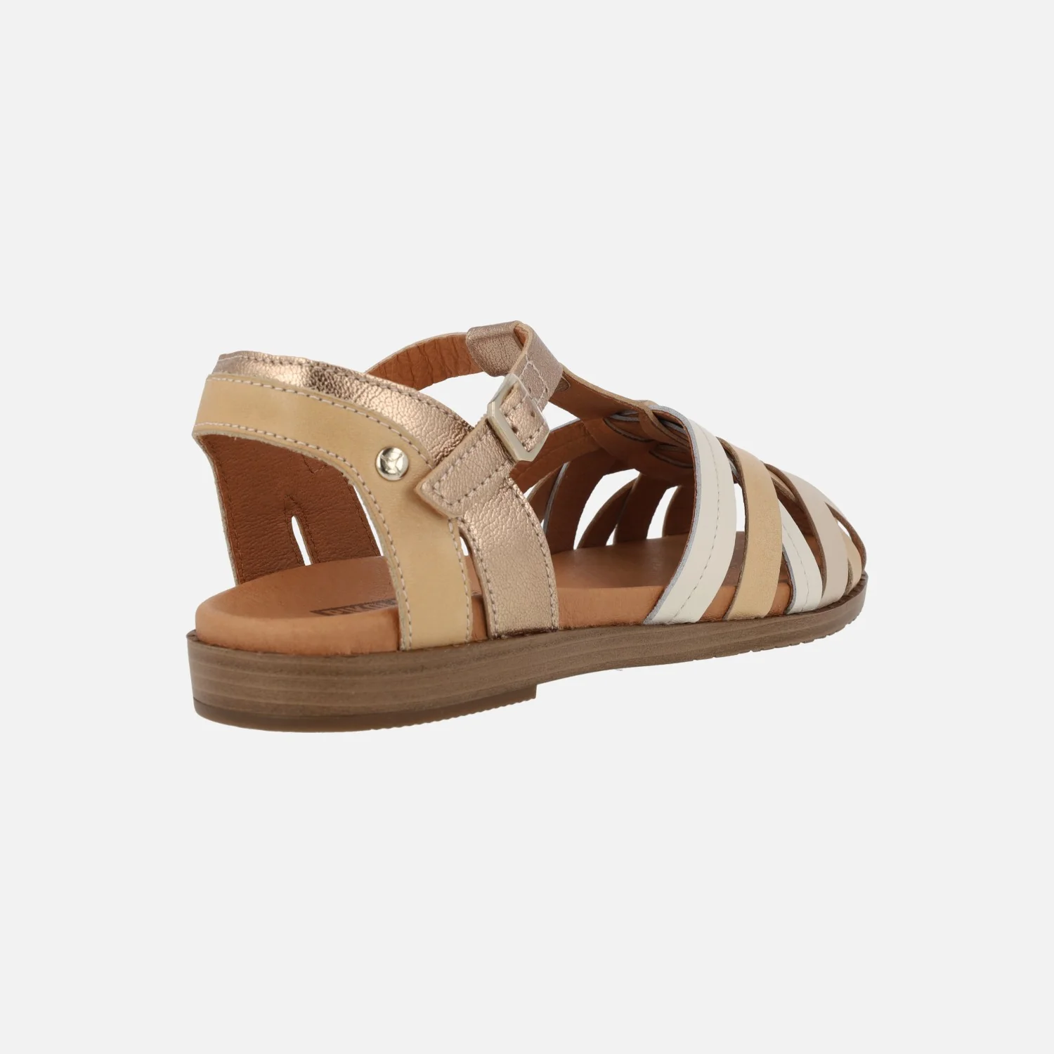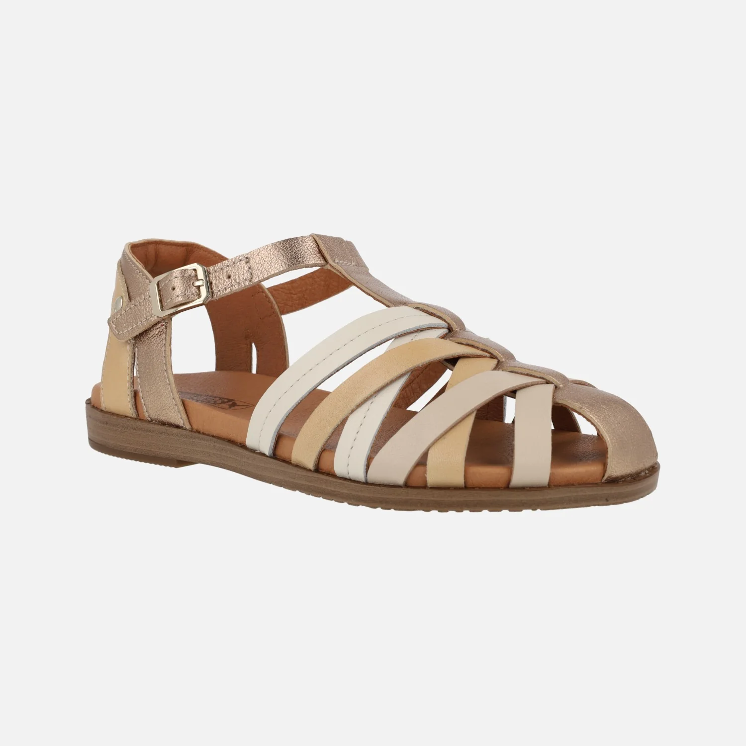 Sandalias de piel Pikolinos FORMENTERA W8Q-0803 disponibles en combinado champagne. Sandalias de piel estilo cangrejeras, con tiras cruzadas en la parte delantera. Tira con hebilla al tobillo. Interior mixto de piel y tejido. Piso sintético, prácticamente plano, de 2.5 cms de altura trasera. Disponibles en combinado champagne, que intercala distintos tonos de beige y dorado.