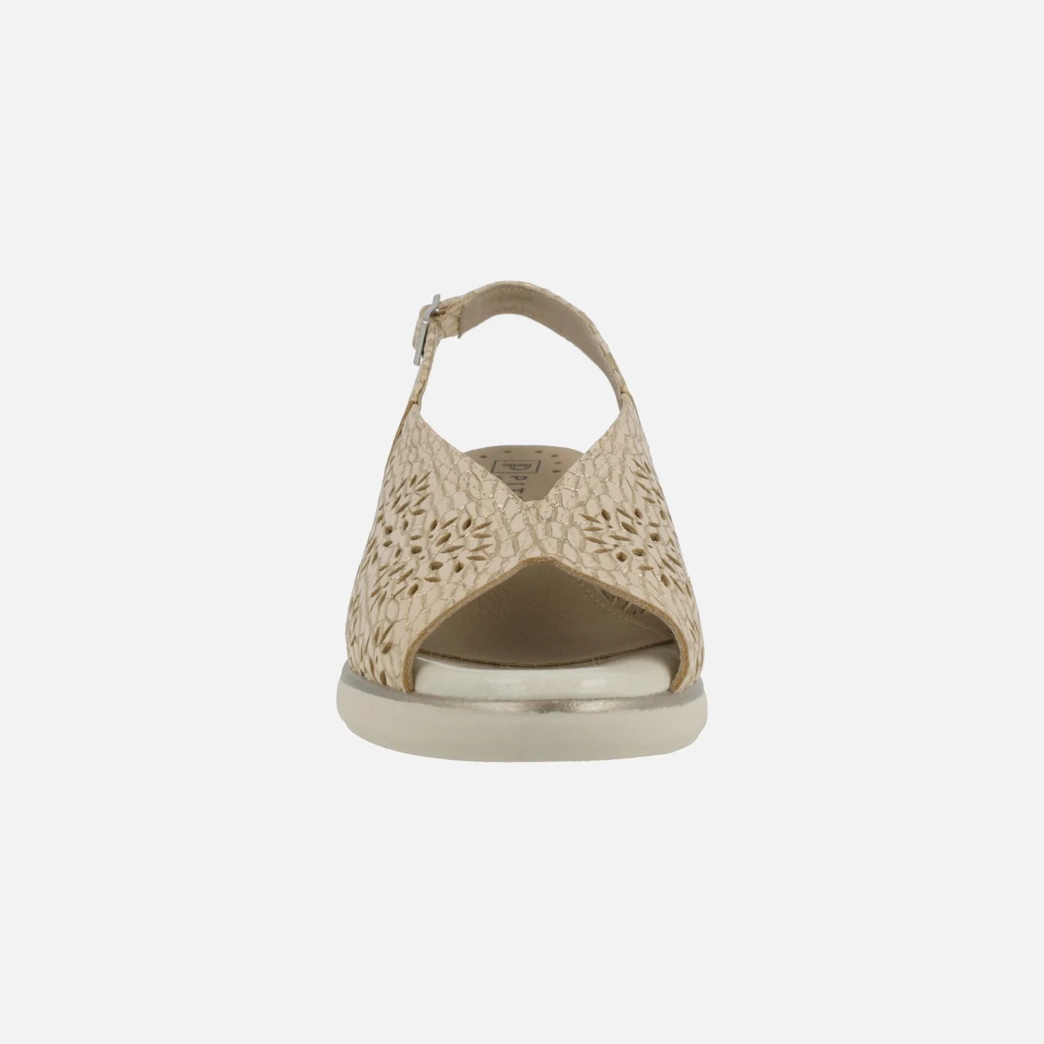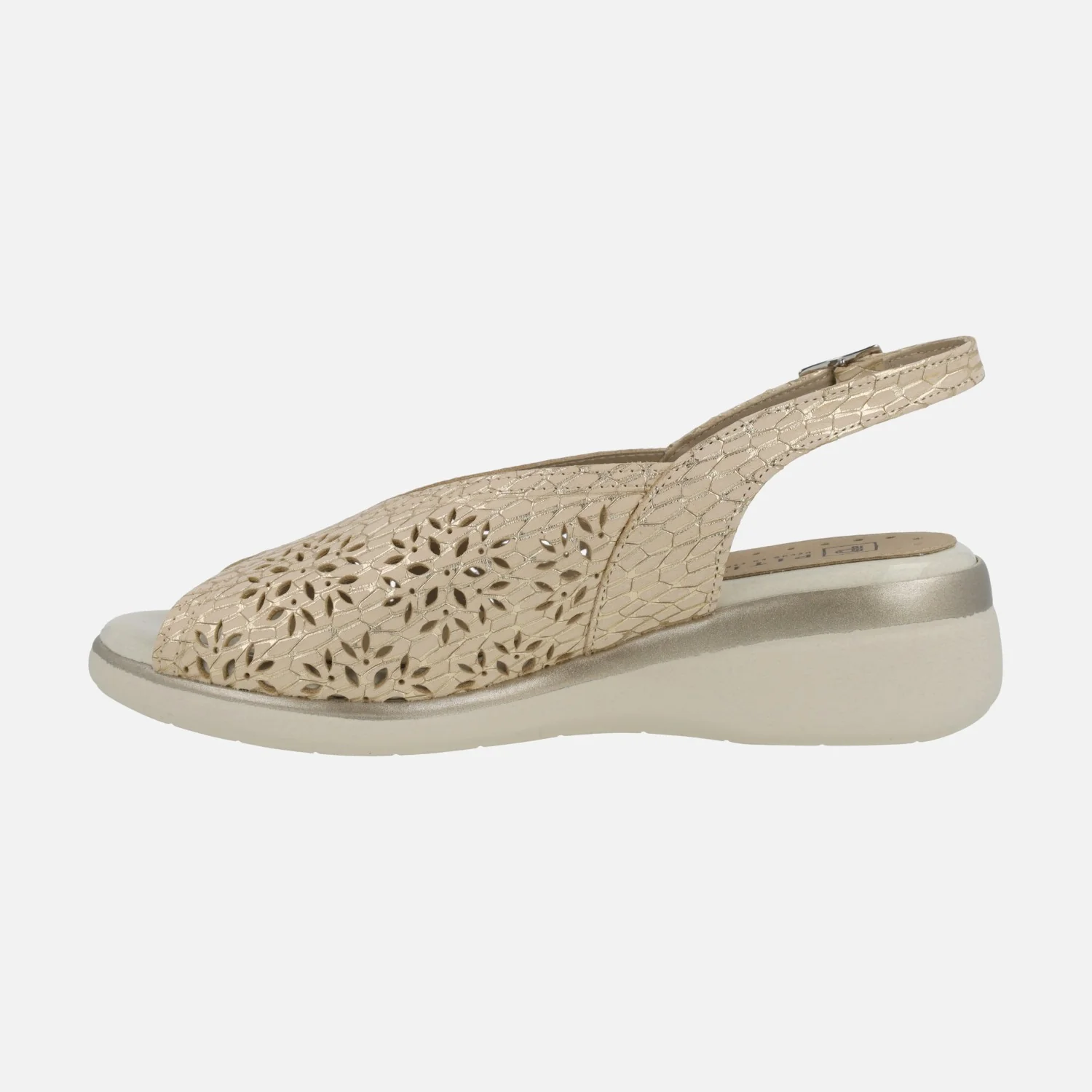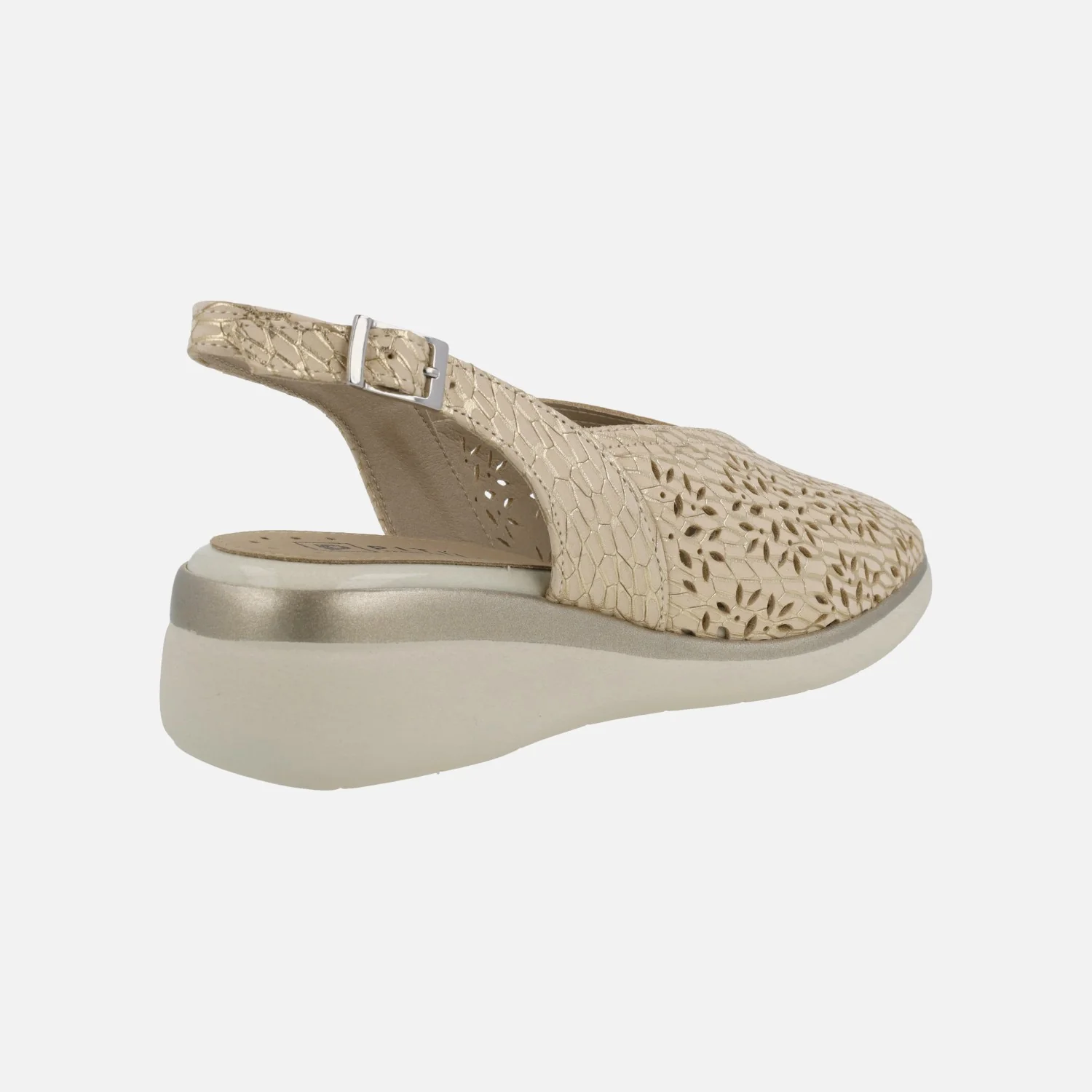 Sandalias confort para mujer de la marca Pitillos modelo 10342 Beige/Oro. Sandalias de piel grabada color beige con destellos dorados y troquelados. Tira al talón con cierre de hebilla. Interiores en tejido y otros materiales. Piso de goma de 4,5 cms de altura trasera (2 cms en la parte delantera).