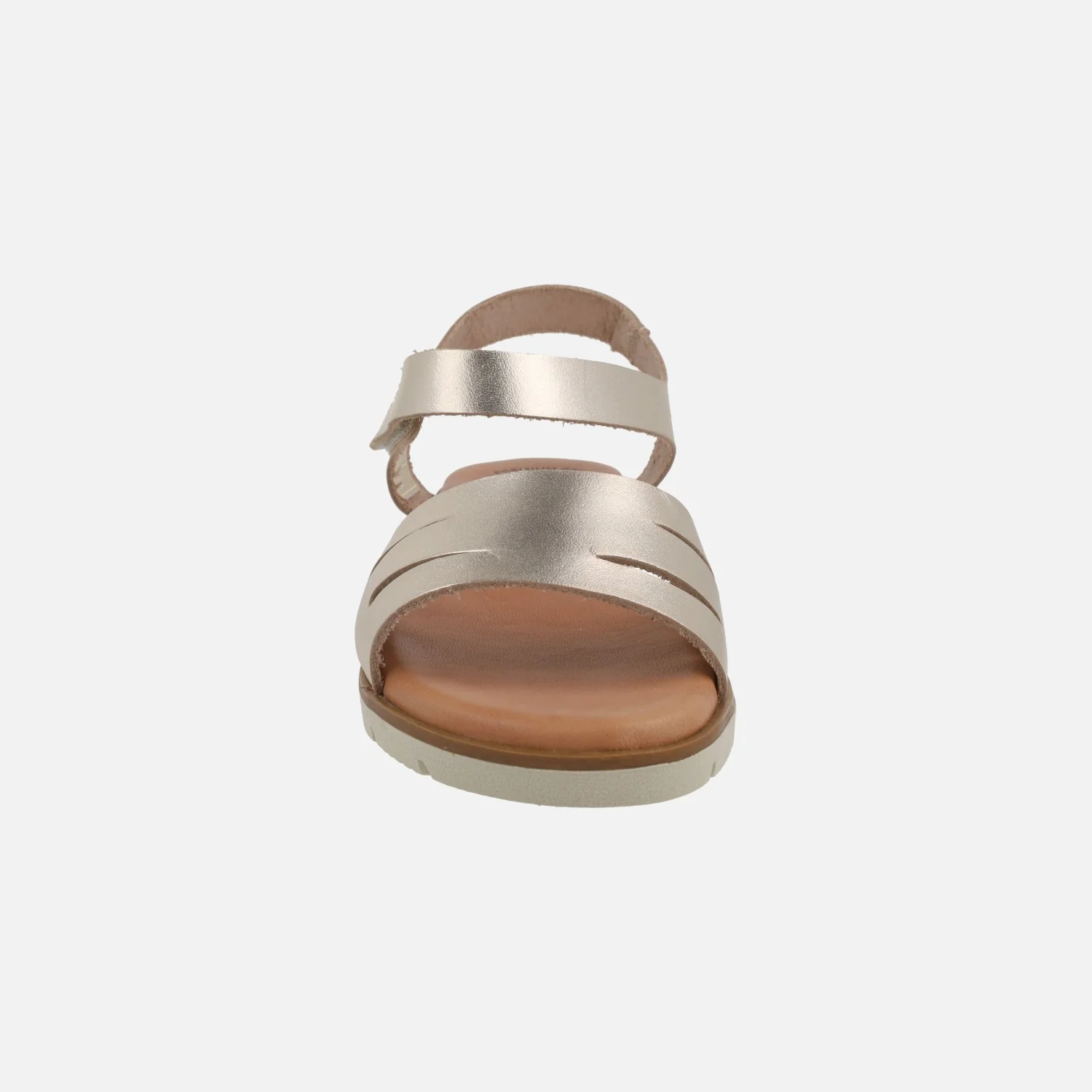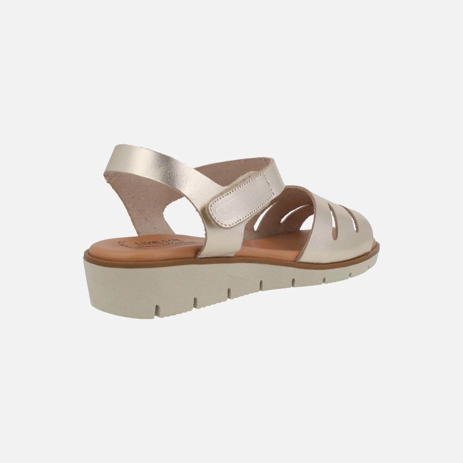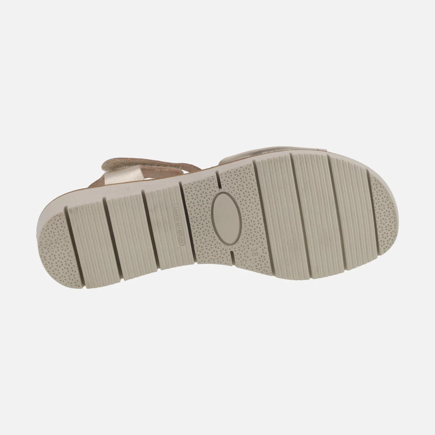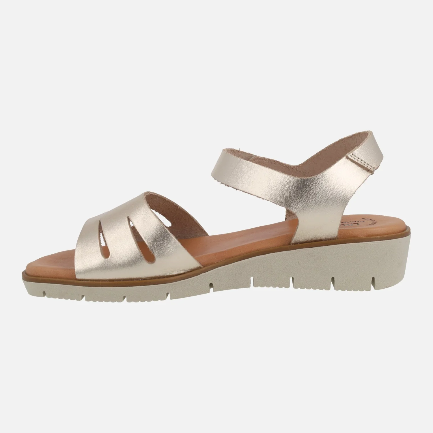 Sandalias de piel en metalizado oro modelo 677 platino de la marca Kaola. Sandalias elaboradas en piel, con pulsera al tobillo y cierre de velcro. Interiores y planta de piel. Cuña baja de goma, de 3,5 cm de altura trasera (1 cm parte delantera).