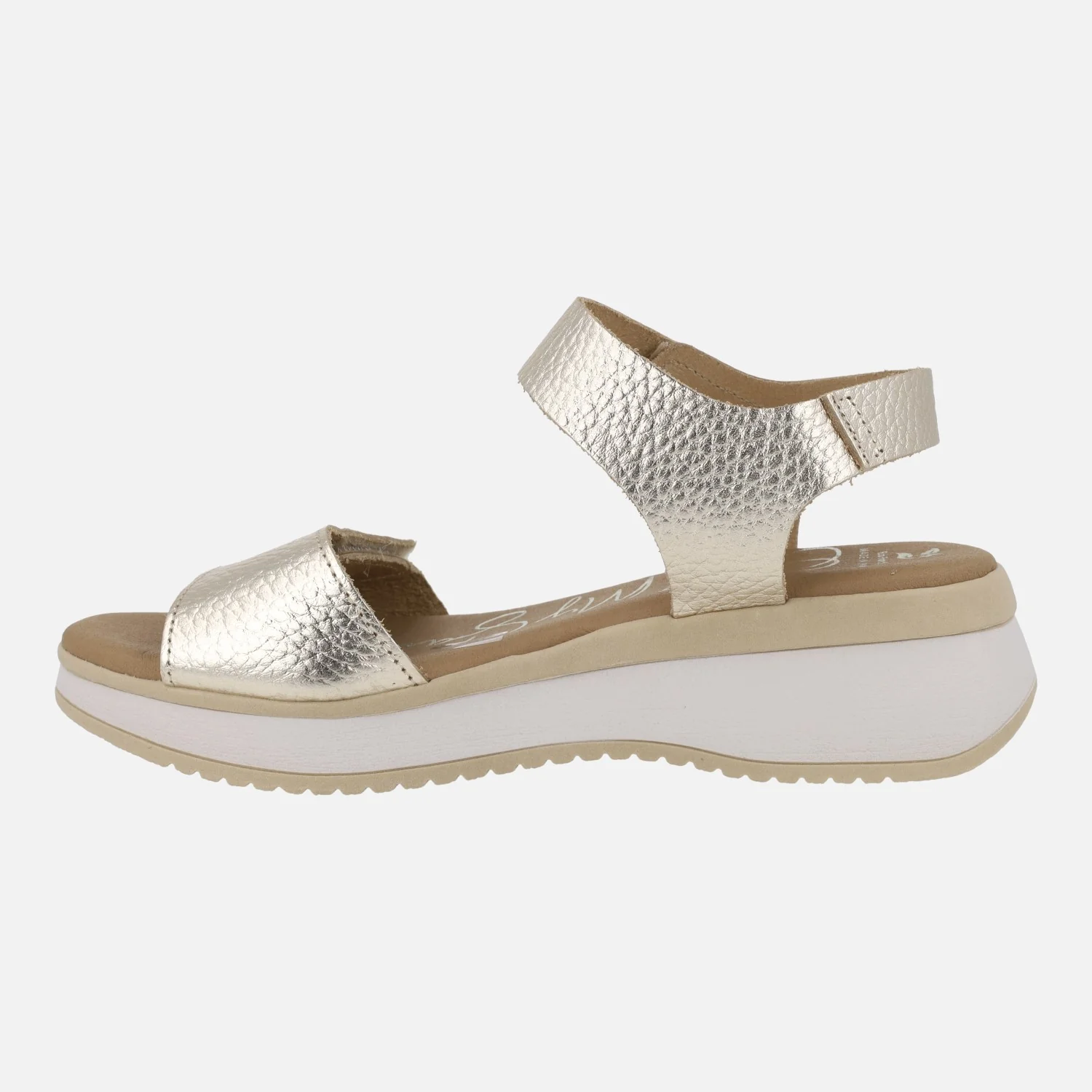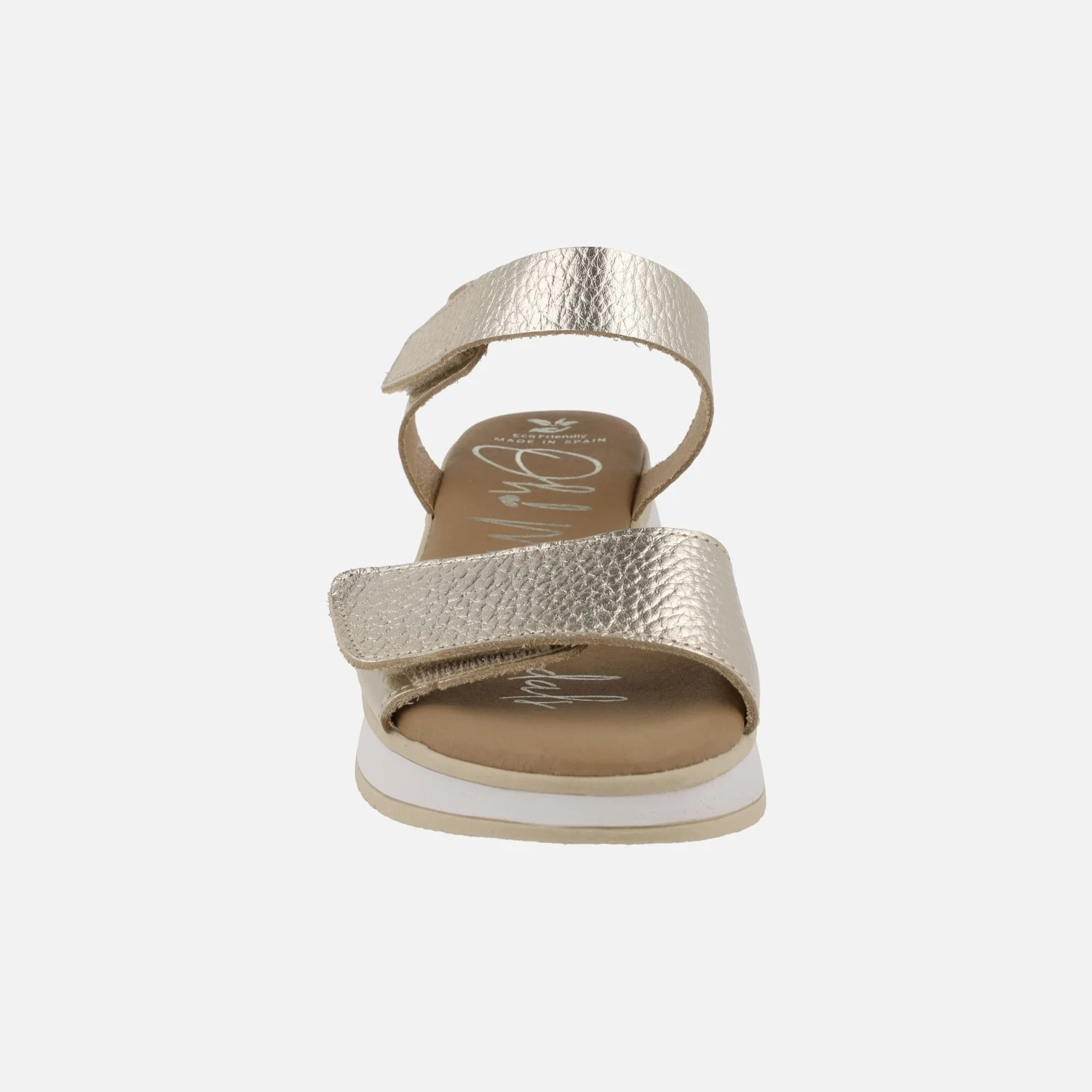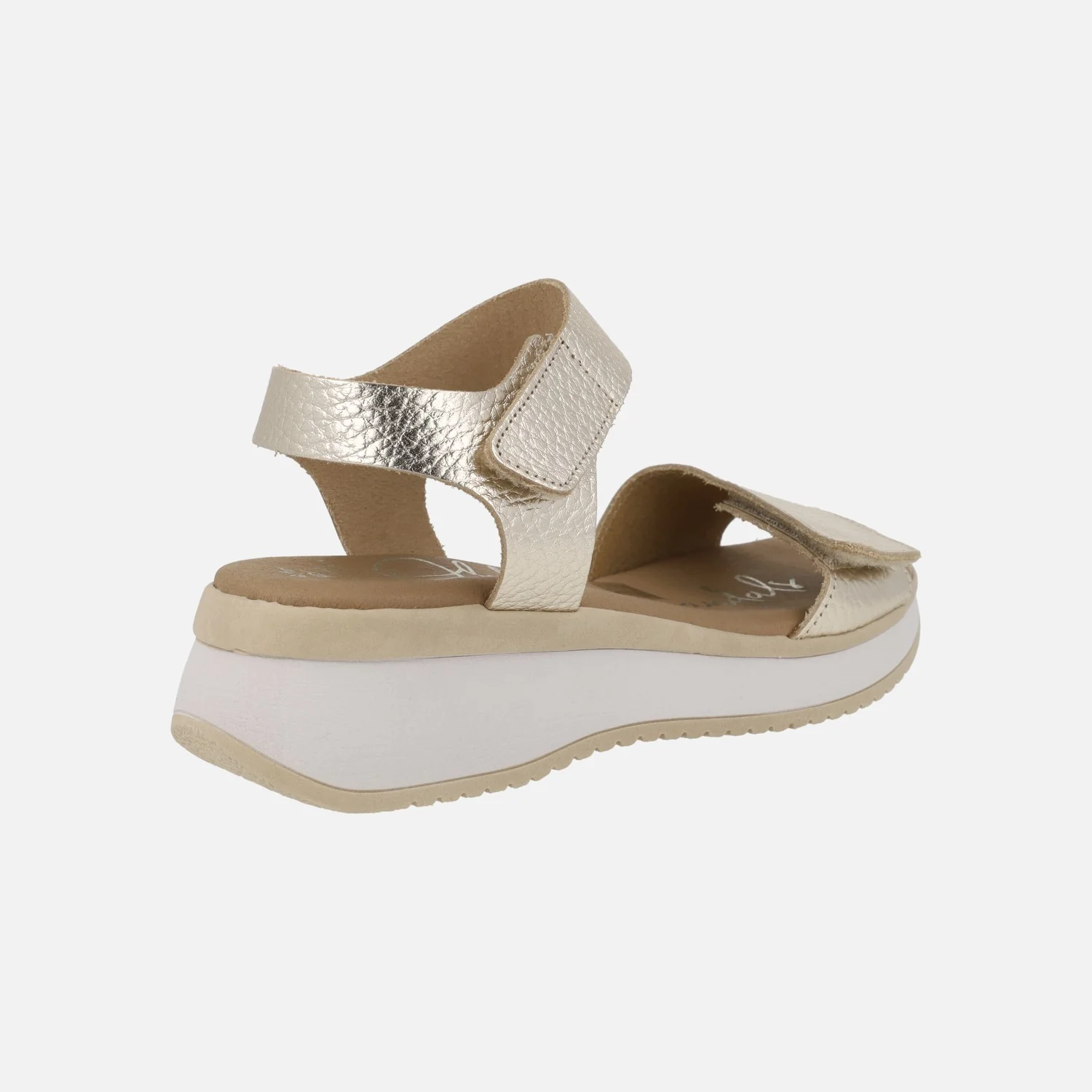 Sandalias doradas de piel marca Lince modelo 5660 Champagne. Sandalias de piel metalizada color oro claro, con dos tiras que cierran con velcro: una en la parte delantera y otra al tobillo. Interior textil. Piso de goma, con 5 cm de altura trasera (2,5 cm parte delantera).