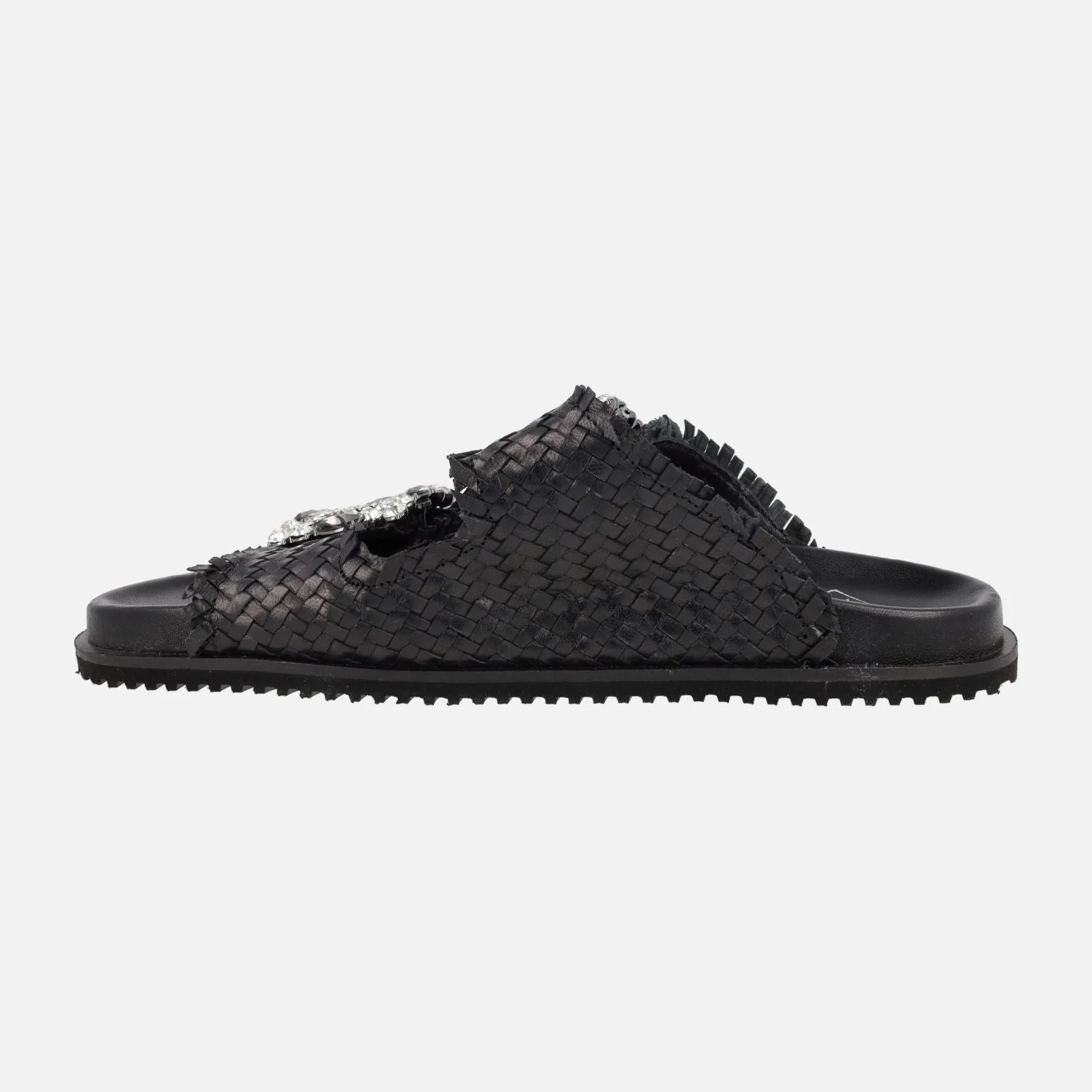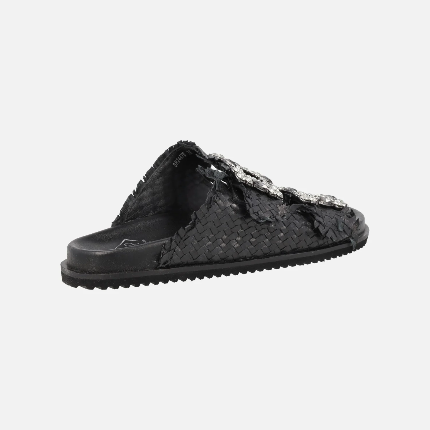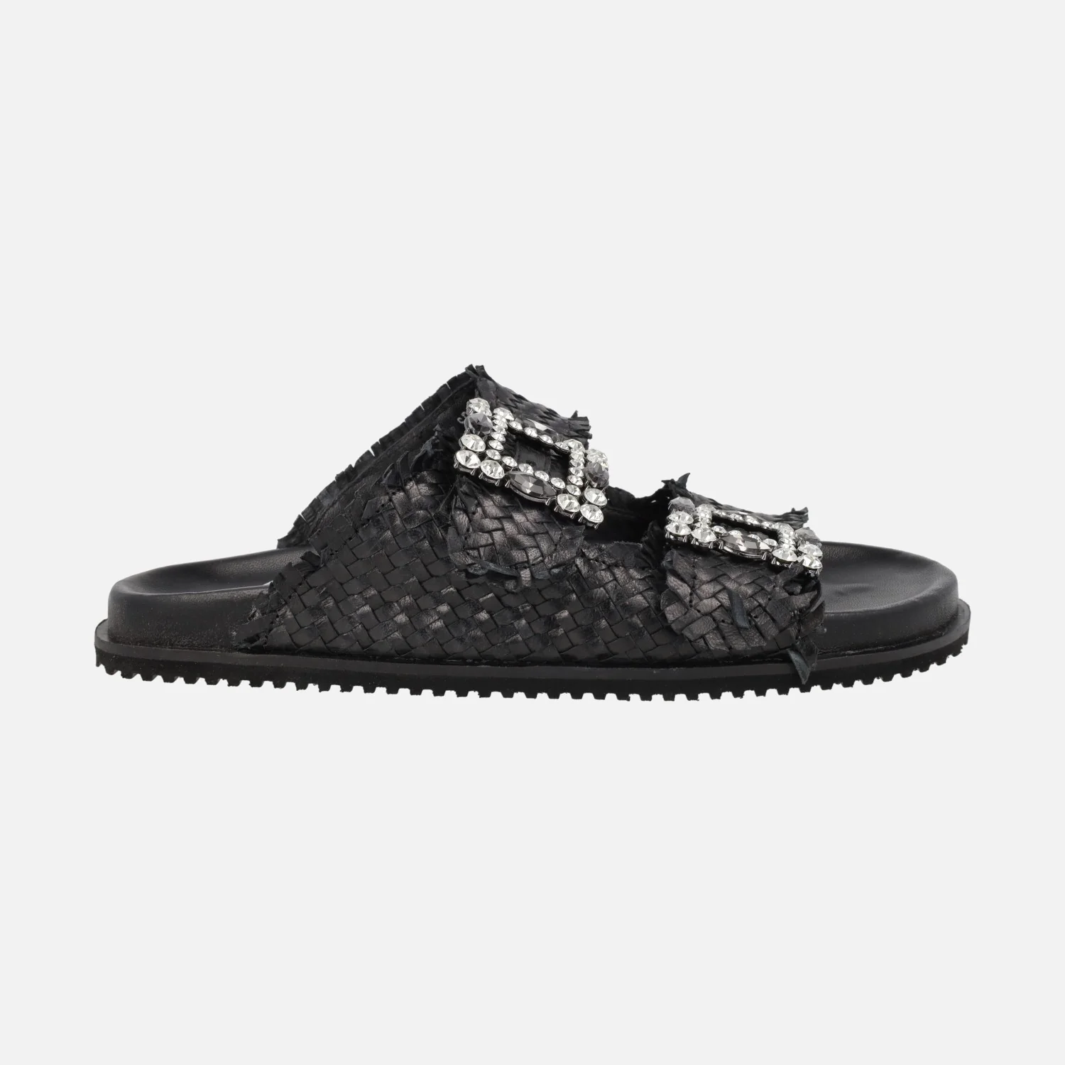 Sandalias trenzadas de piel de la marca Top3 modelo SF25446, disponibles en negro y platino (oro claro). Sandalias trenzadas de piel con adorno de hebillas joya, con pedrería. Forro y planta de piel. Piso de goma, con una altura aproximada de 2 cms.