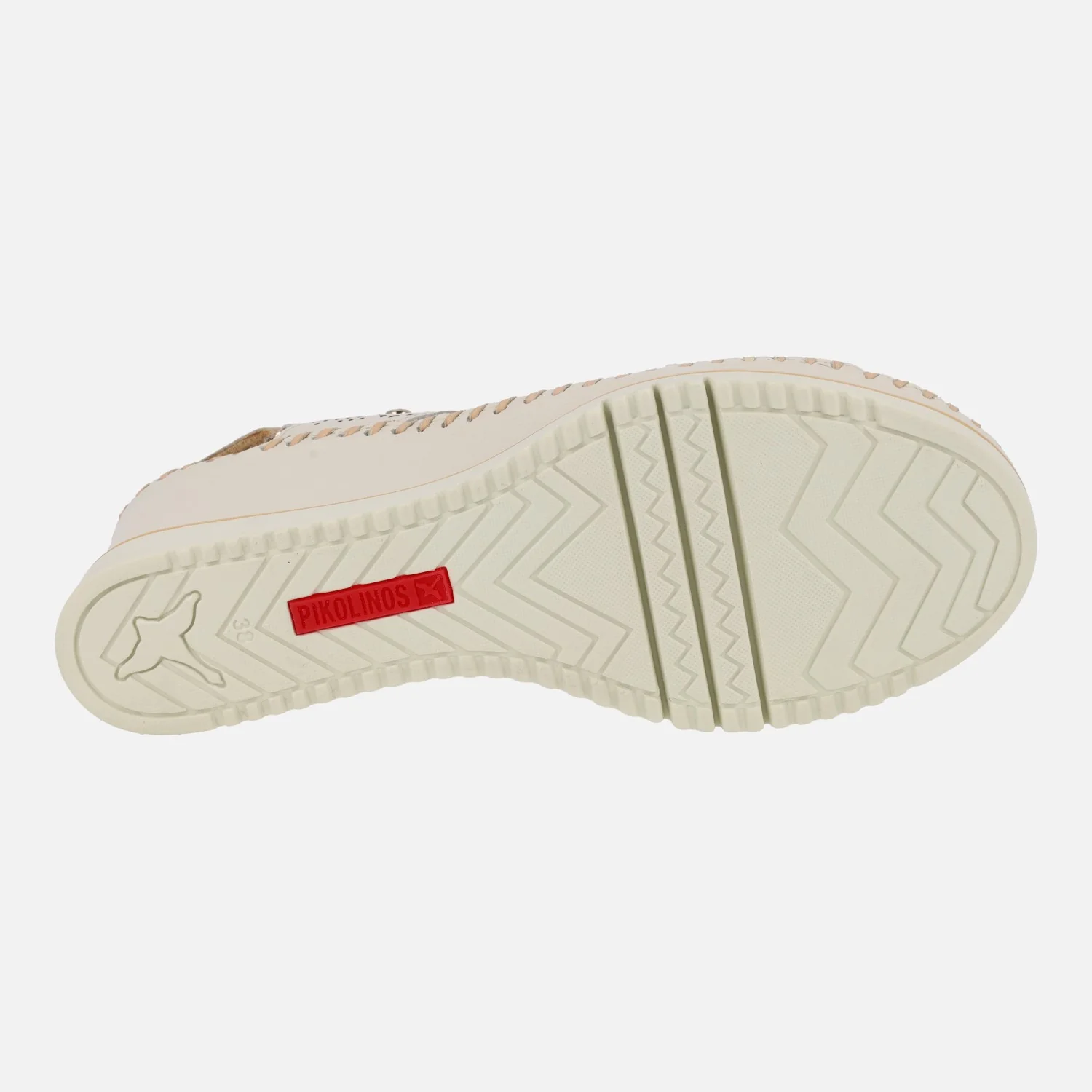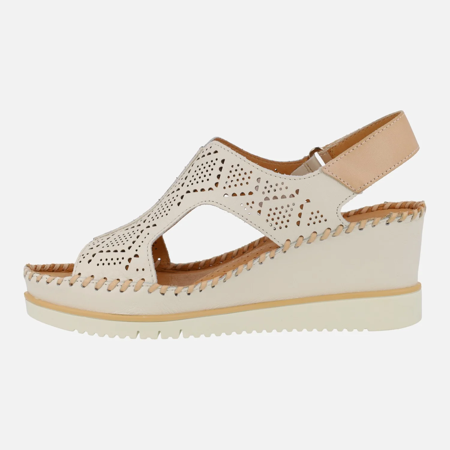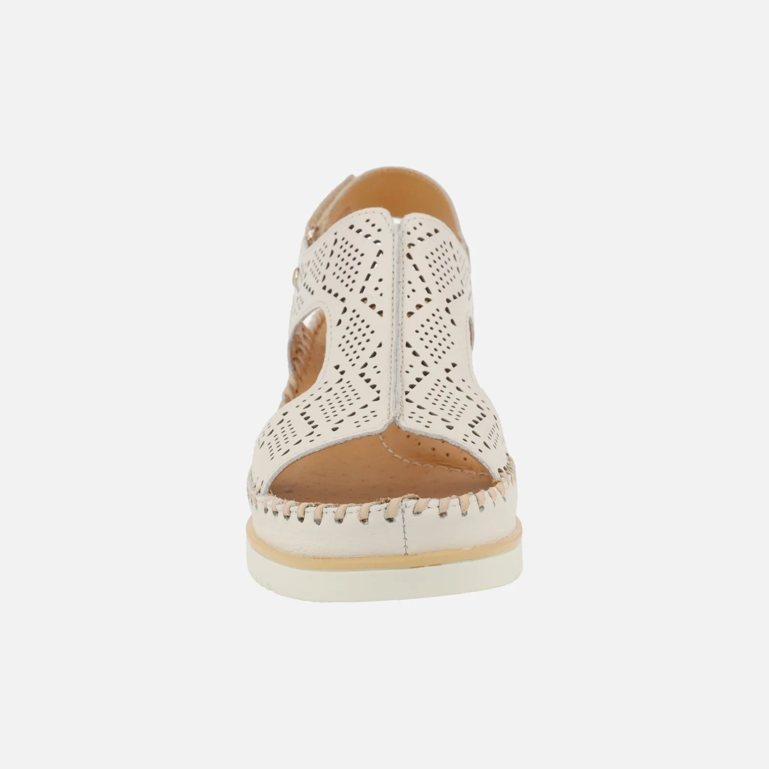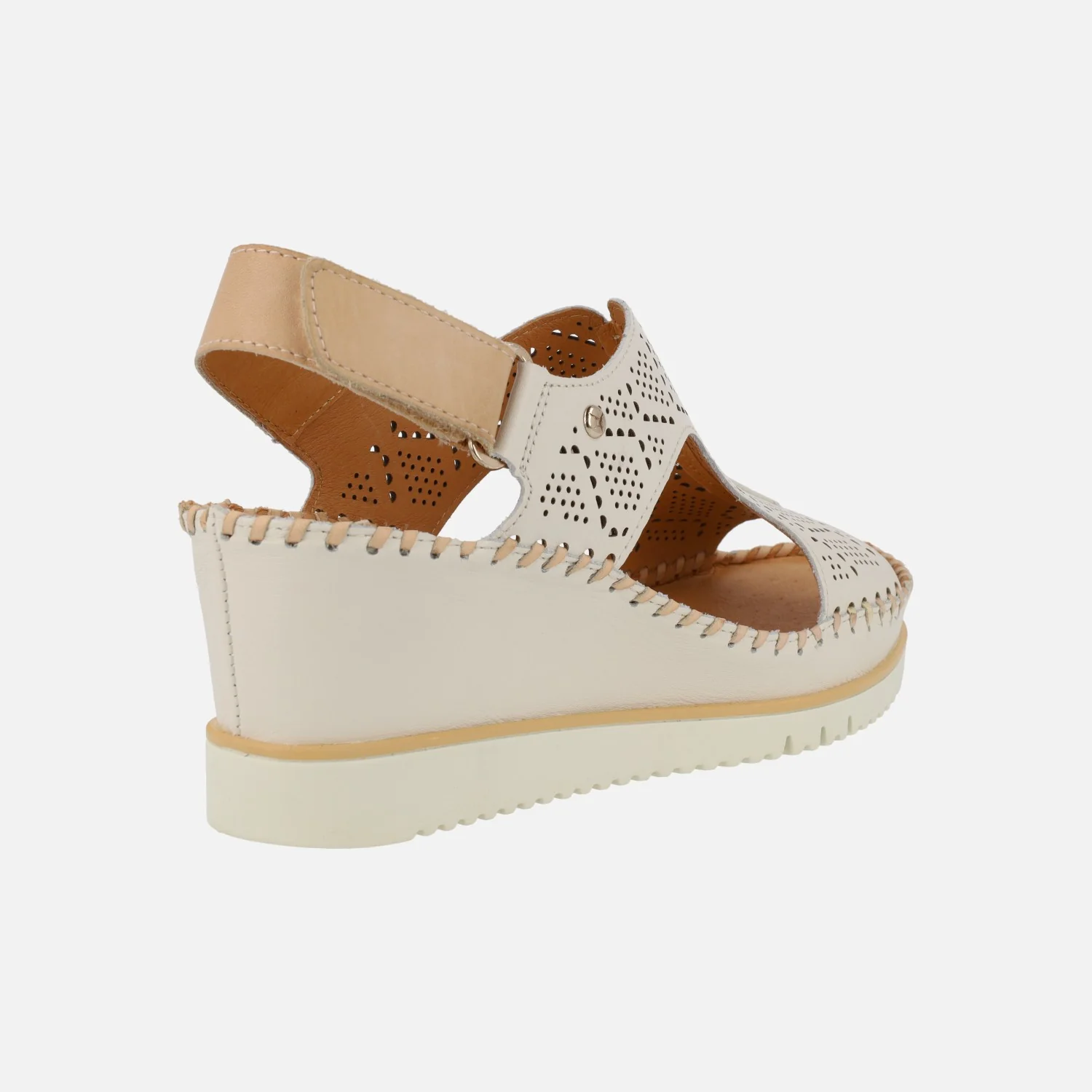Sandalias de piel troqueladas para mujer de la marca Pikolinos, modelo Aguadulce W3Z-1775C1 Nata o Brandy. Sandalias troqueladas de piel con tira al talón y cierre de velcro. Interiores forrados de piel. Piso extralight, super ligero, con 7 cm de altura de cuña en la parte trasera (3 cm parte delantera).