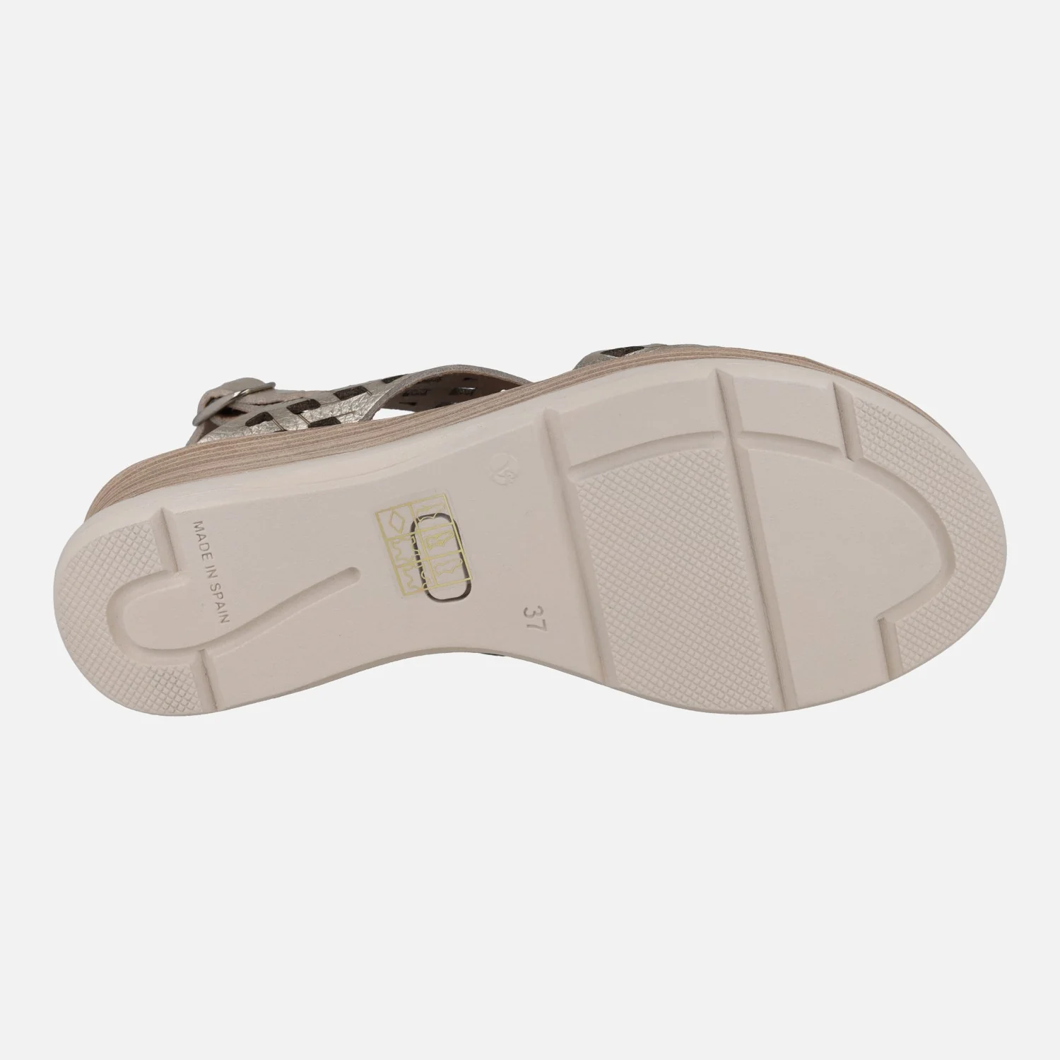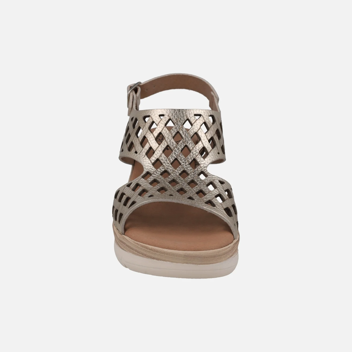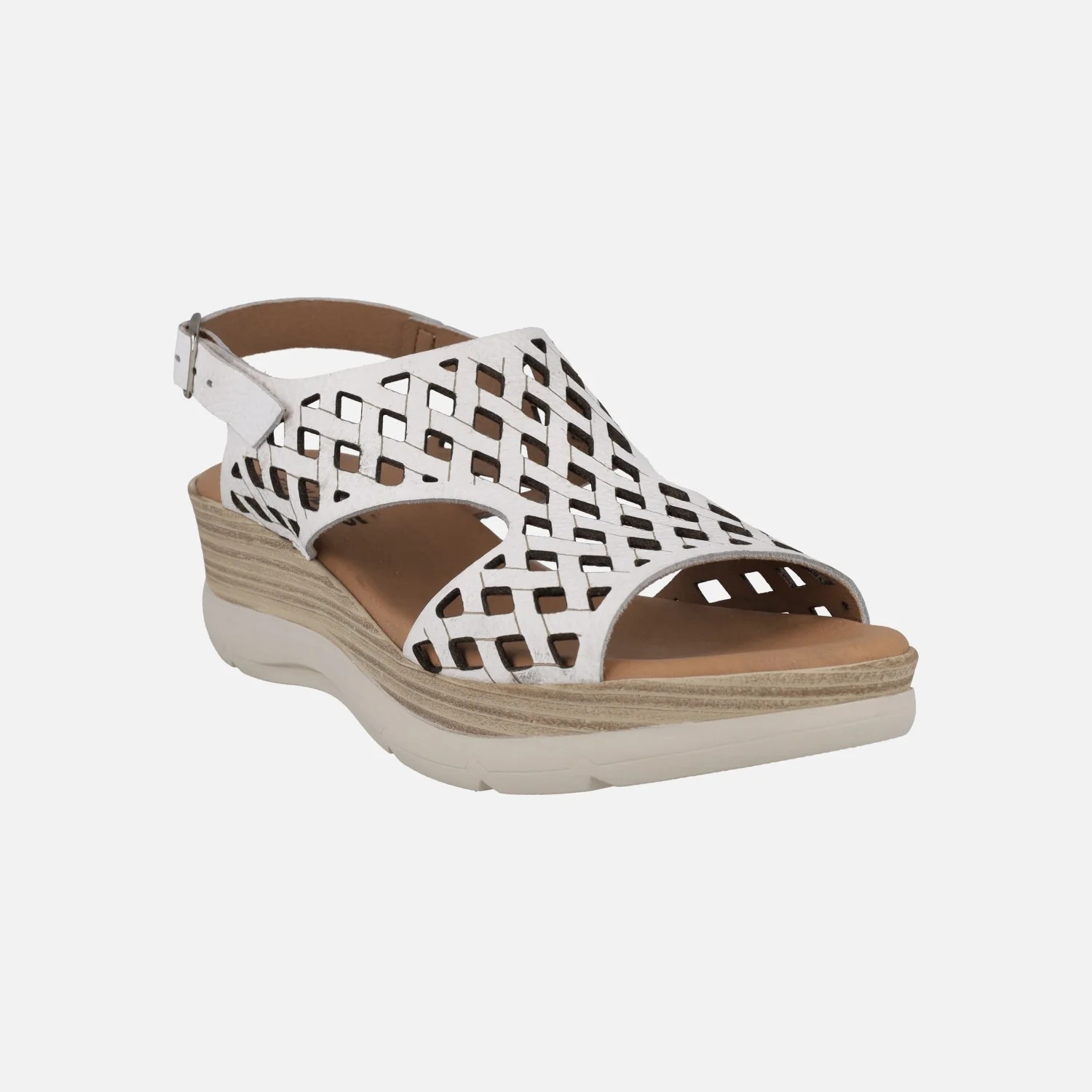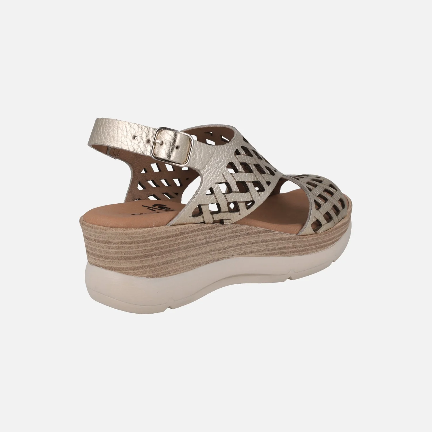 Sandalias de piel troqueladas de la marca Circulus, modelo 2088 disponibles en blanco y en platino (oro claro). Sandalias con tira al talón y cierre ajustable de hebilla. Forro y planta de piel. Plataforma sintética, con 6 cm de altura trasera (3,5 cm parte delantera). Made in Spain.