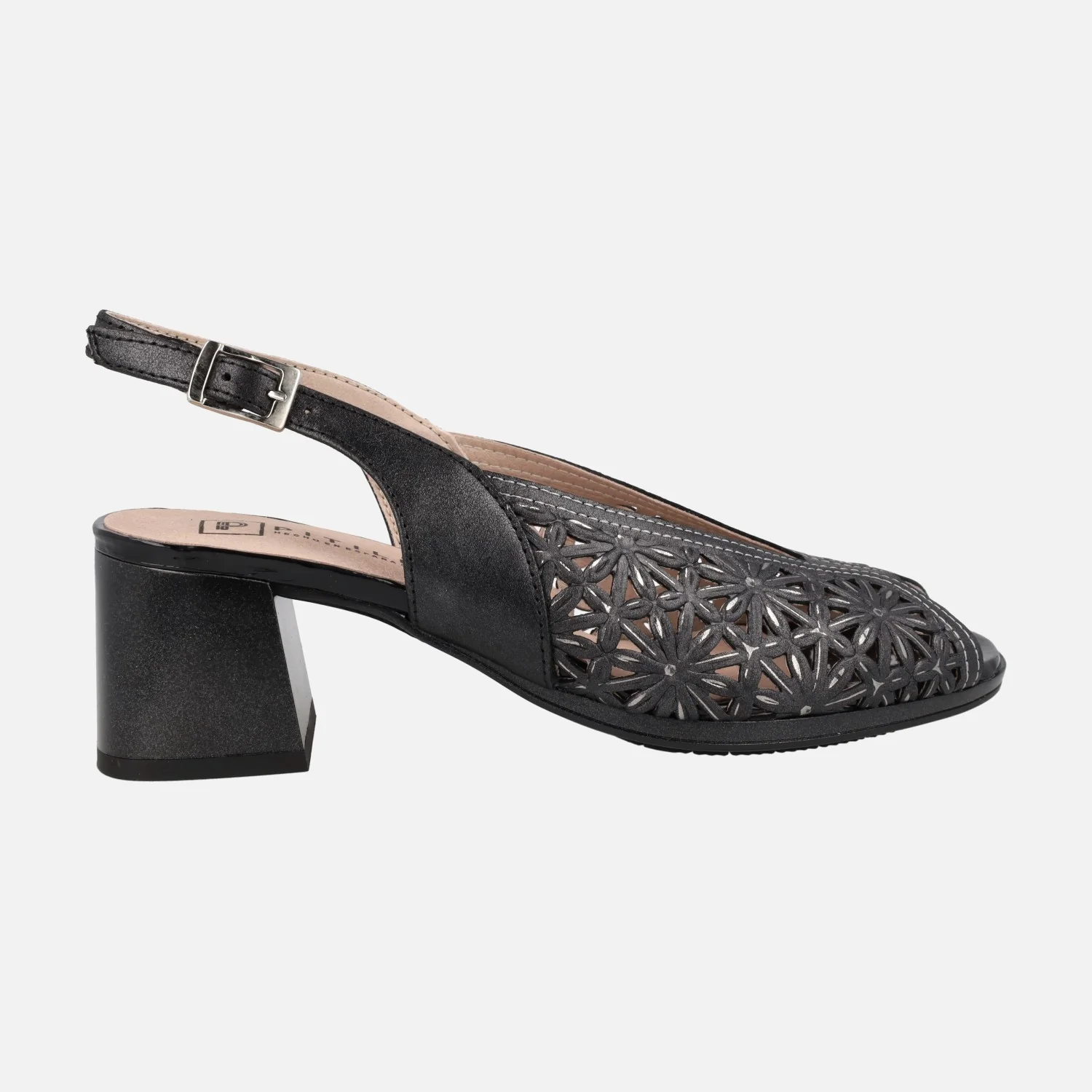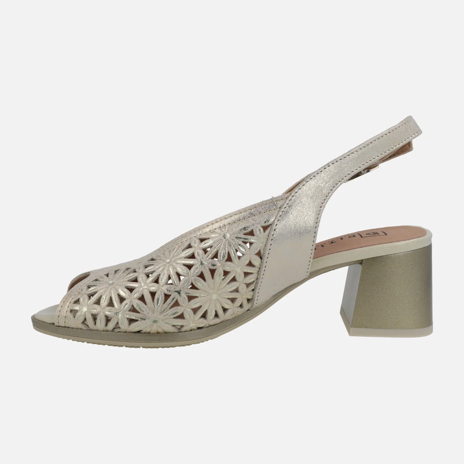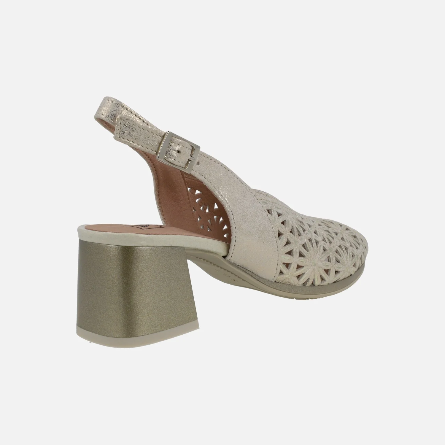 Sandalias de tacón troqueladas para mujer de la marca Pitillos, modelo 5691 Oro o negro. Sandalias de piel metalizada, con troquelado de flores. Tira al talón y cierre de hebilla. Interior mixto de tejido y otros materiales. Tacones anchos, de 6 cms de altura. Made in Spain.
