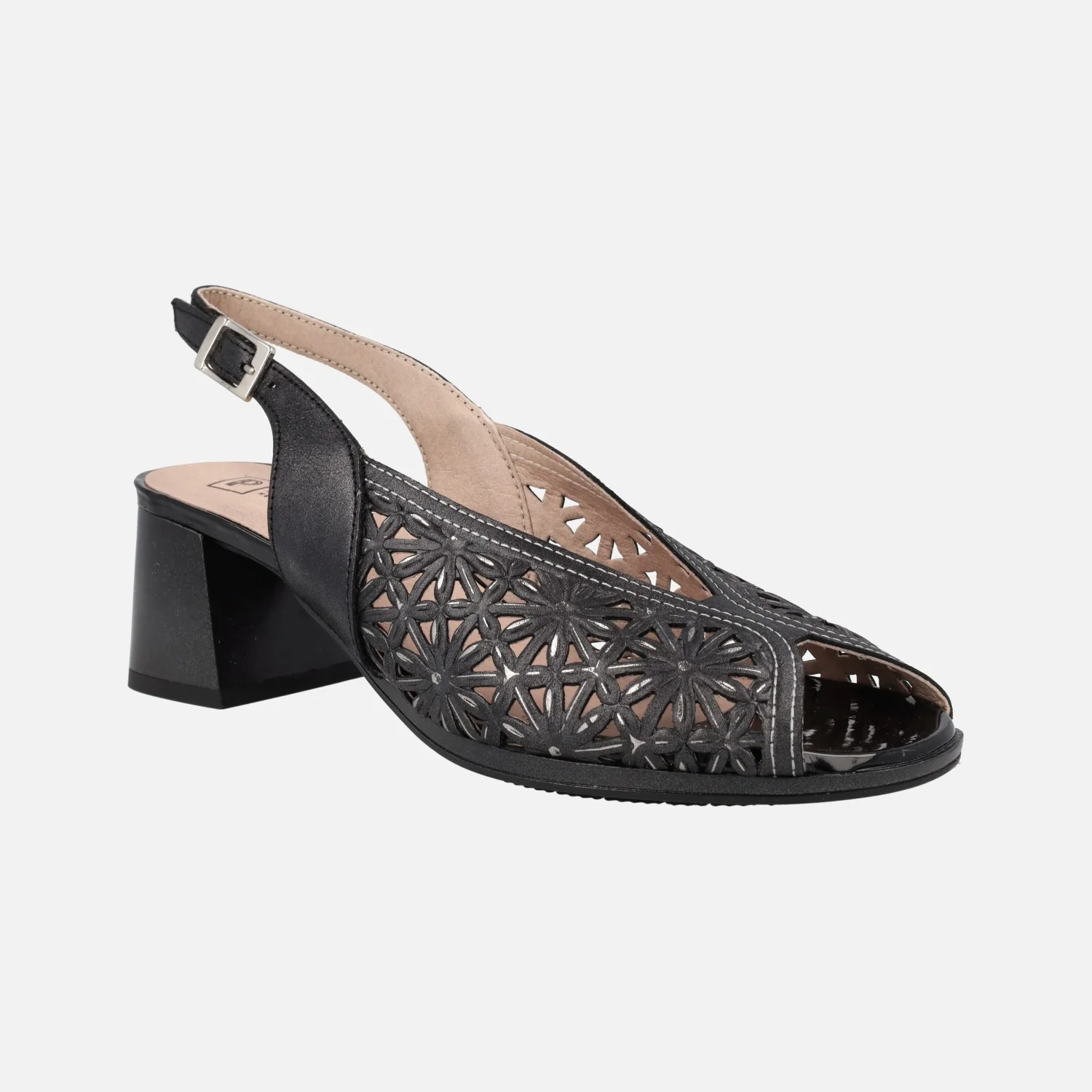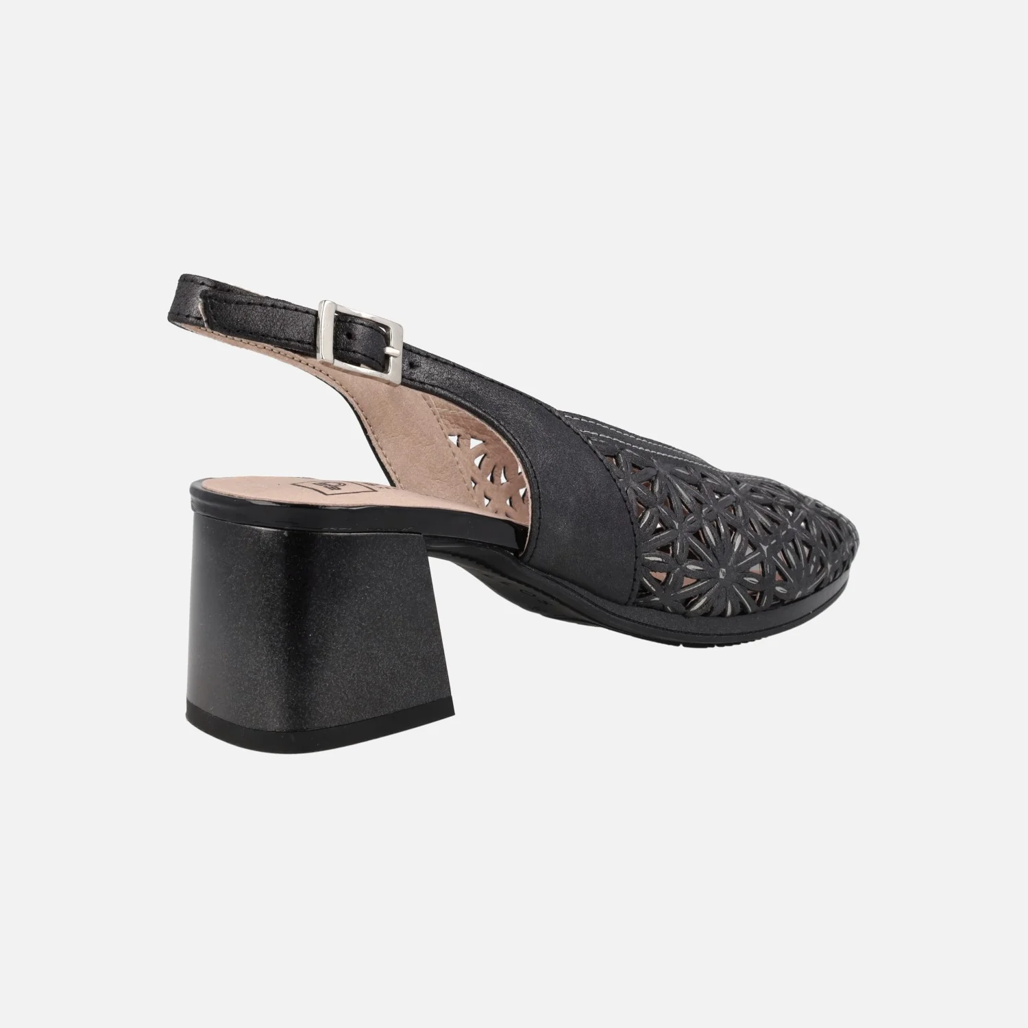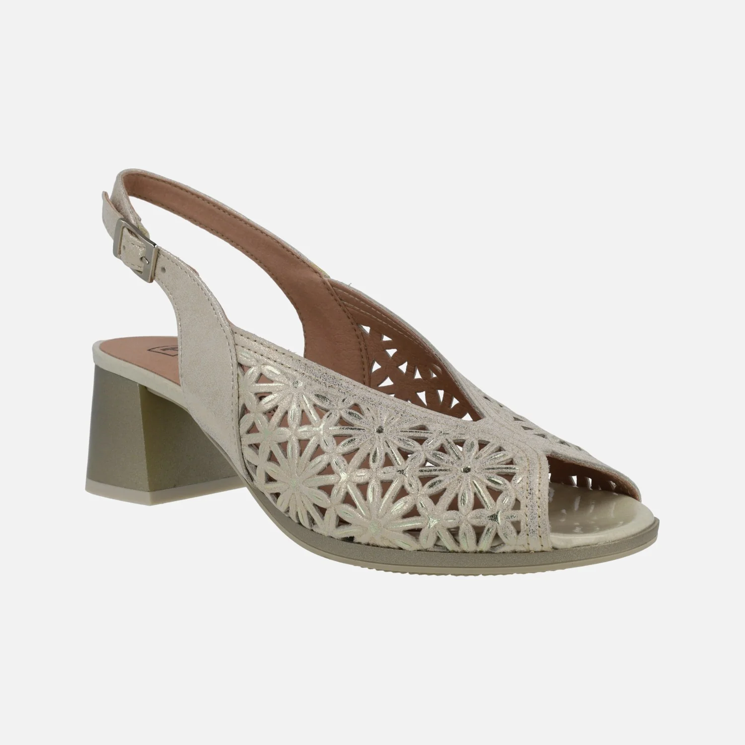 Sandalias de tacón troqueladas para mujer de la marca Pitillos, modelo 5691 Oro o negro. Sandalias de piel metalizada, con troquelado de flores. Tira al talón y cierre de hebilla. Interior mixto de tejido y otros materiales. Tacones anchos, de 6 cms de altura. Made in Spain.