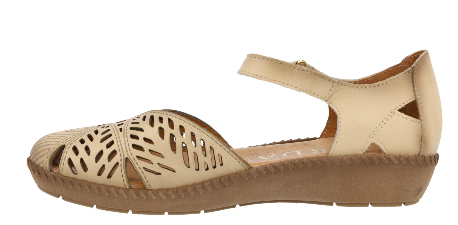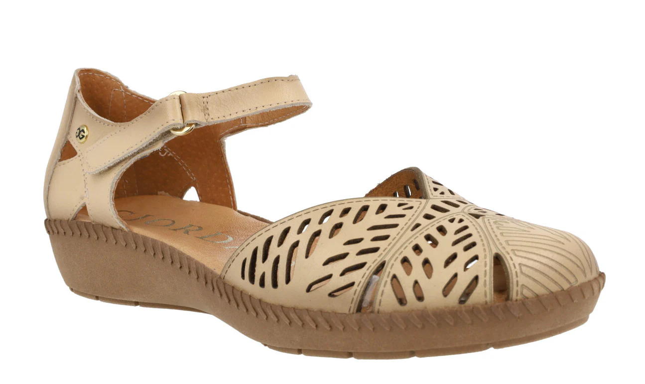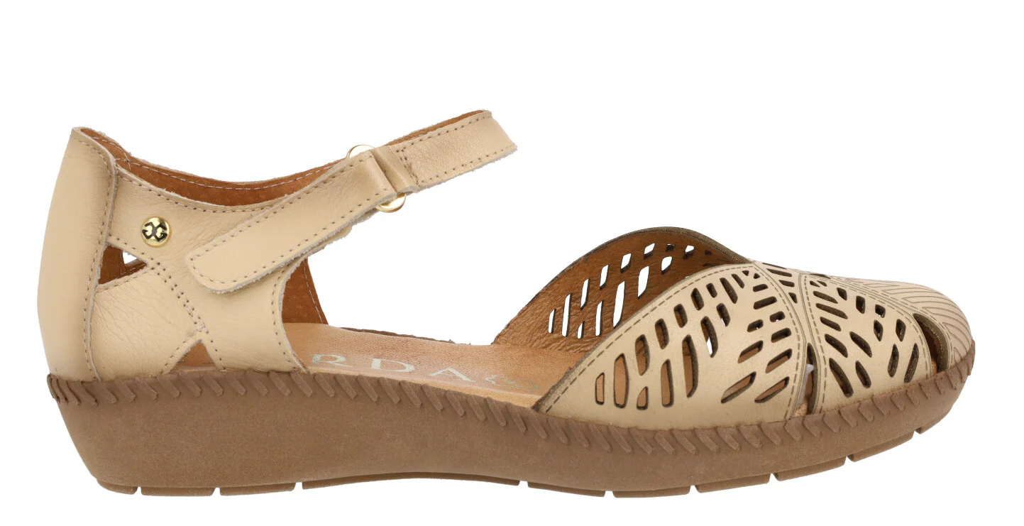 Sandalias confort para mujer de la marca Giorda modelo 28932. Sandalias de piel con pala troquelada y cierre de velcro al tobillo. Cerradas de puntera y talón, con aberturas laterales. Disponibles en color cuero o beige. Forro de piel, plantillas de piel acolchadas. Piso de goma de 3 cms de altura en la parte trasera (1,5 cms en la parte delantera).