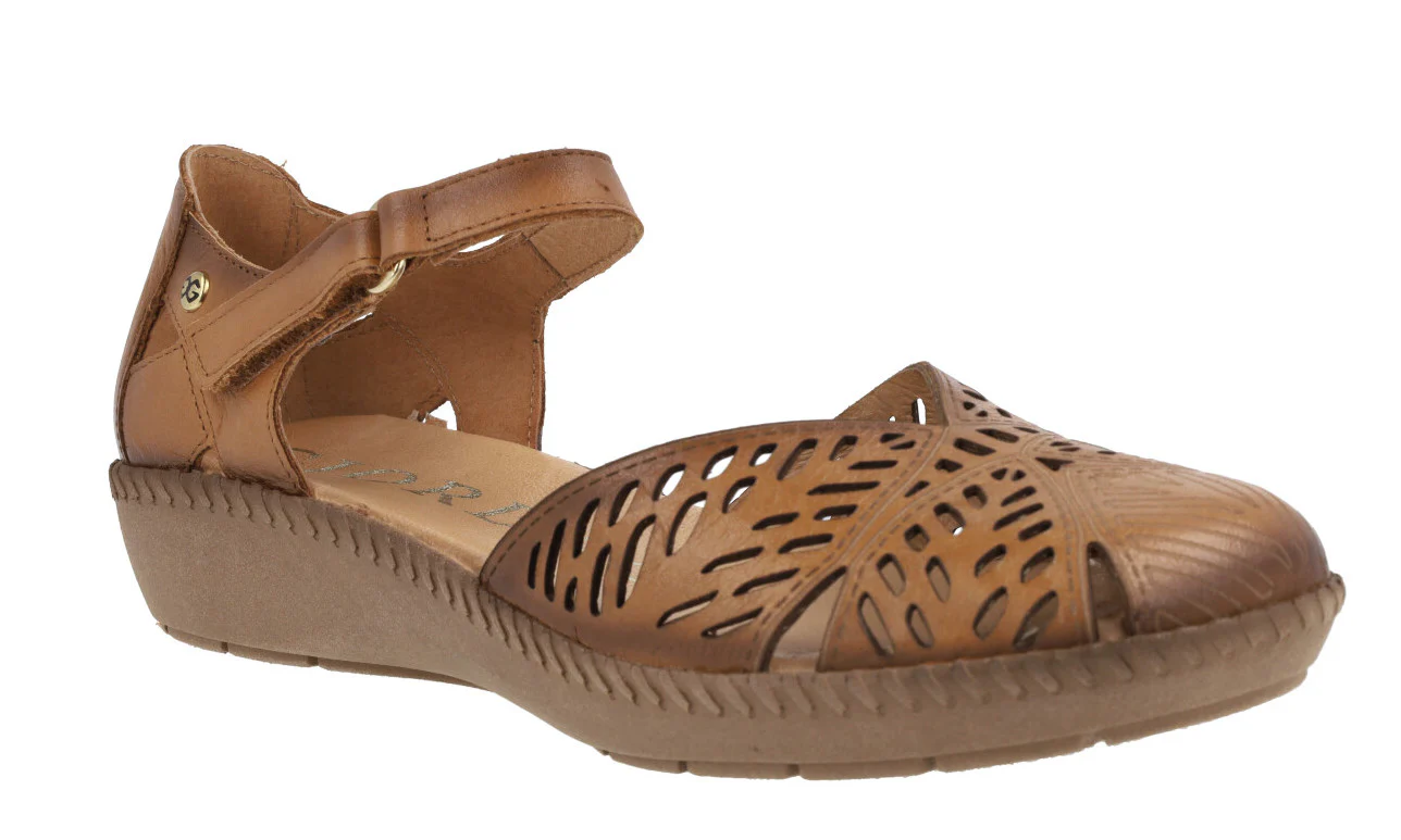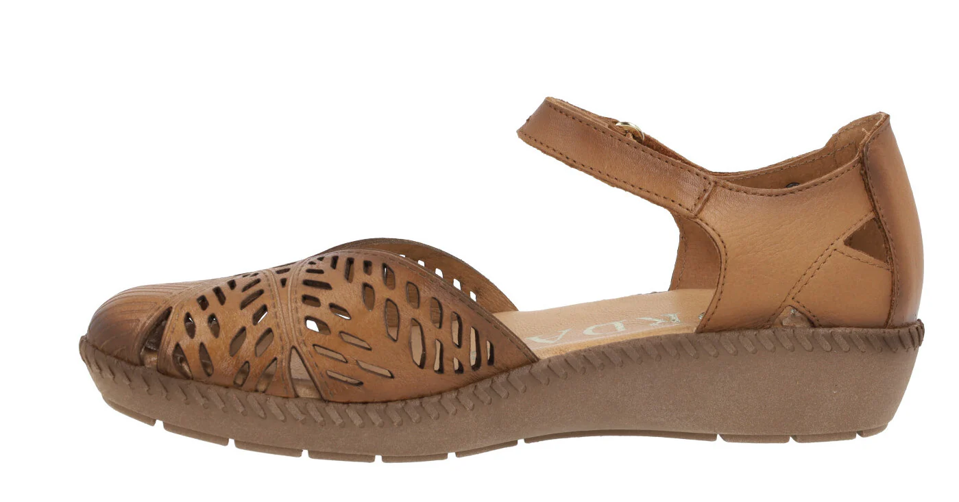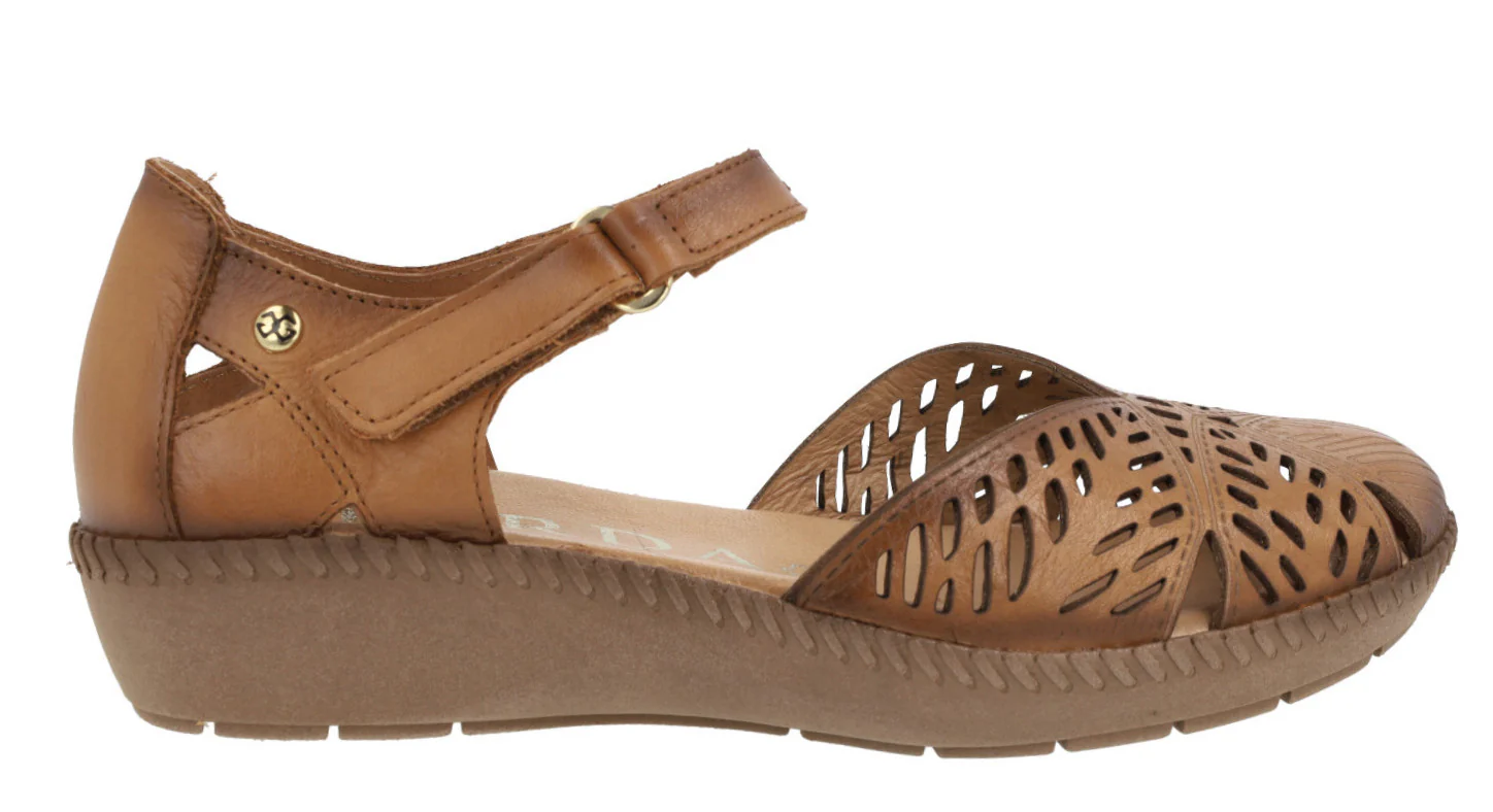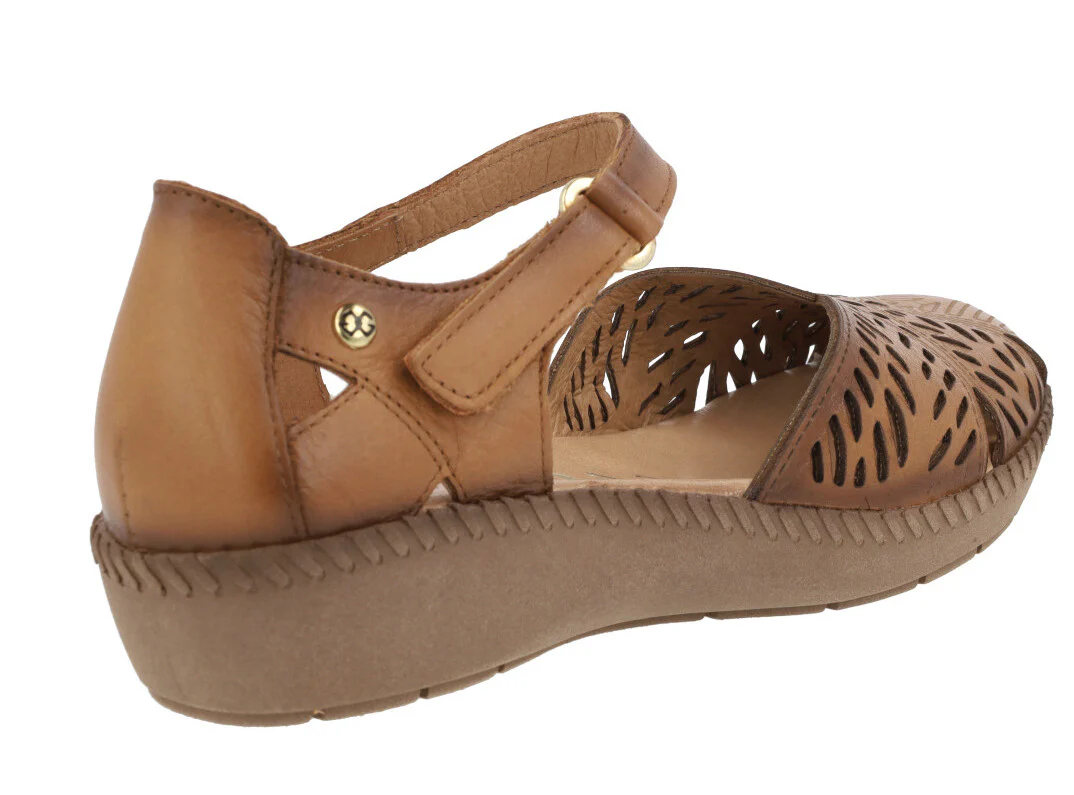Sandalias confort para mujer de la marca Giorda modelo 28932. Sandalias de piel con pala troquelada y cierre de velcro al tobillo. Cerradas de puntera y talón, con aberturas laterales. Disponibles en color cuero o beige. Forro de piel, plantillas de piel acolchadas. Piso de goma de 3 cms de altura en la parte trasera (1,5 cms en la parte delantera).