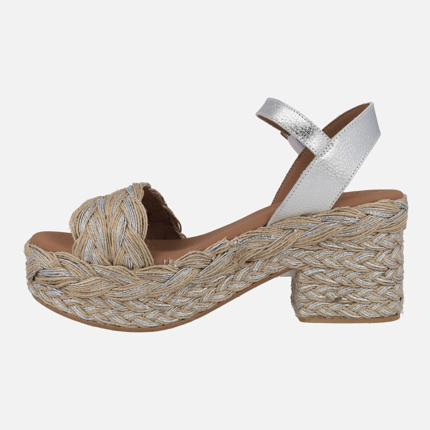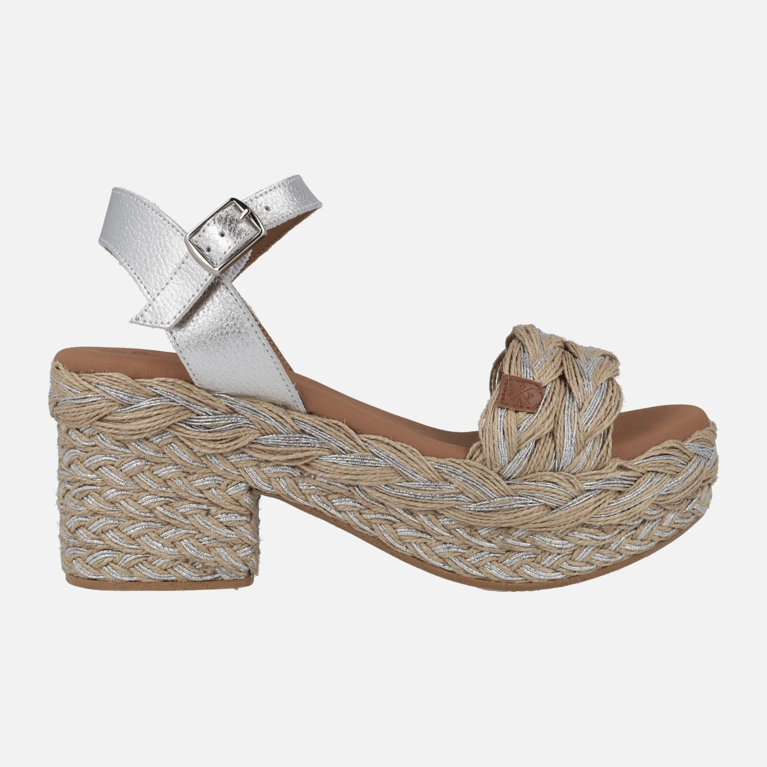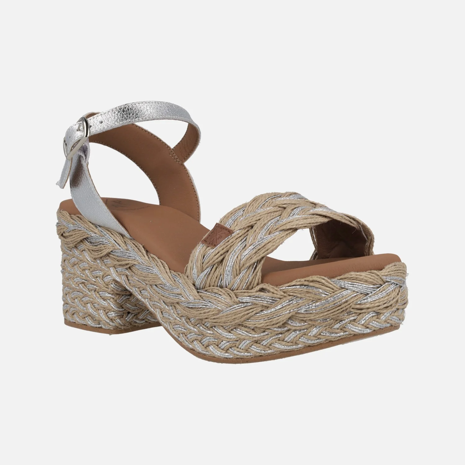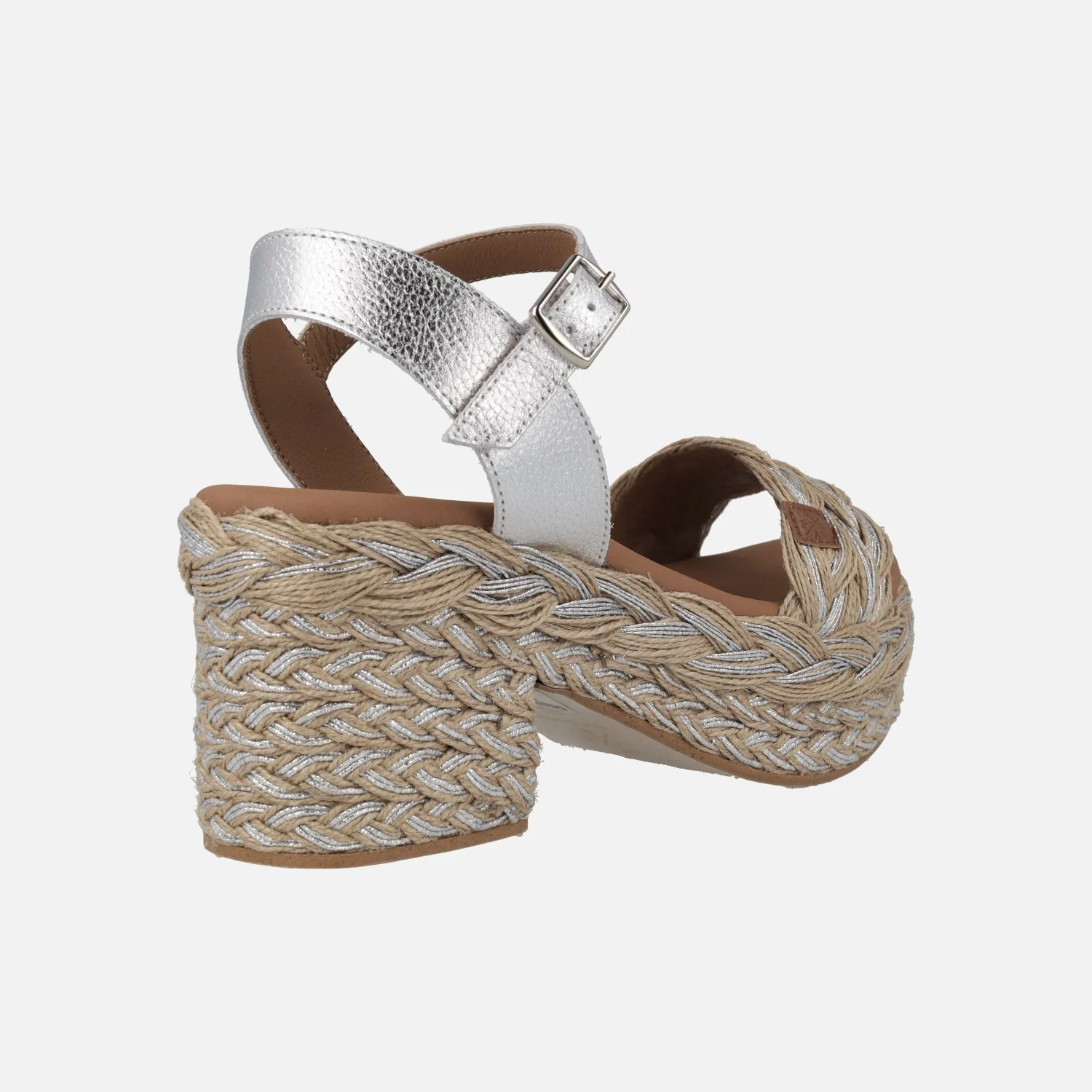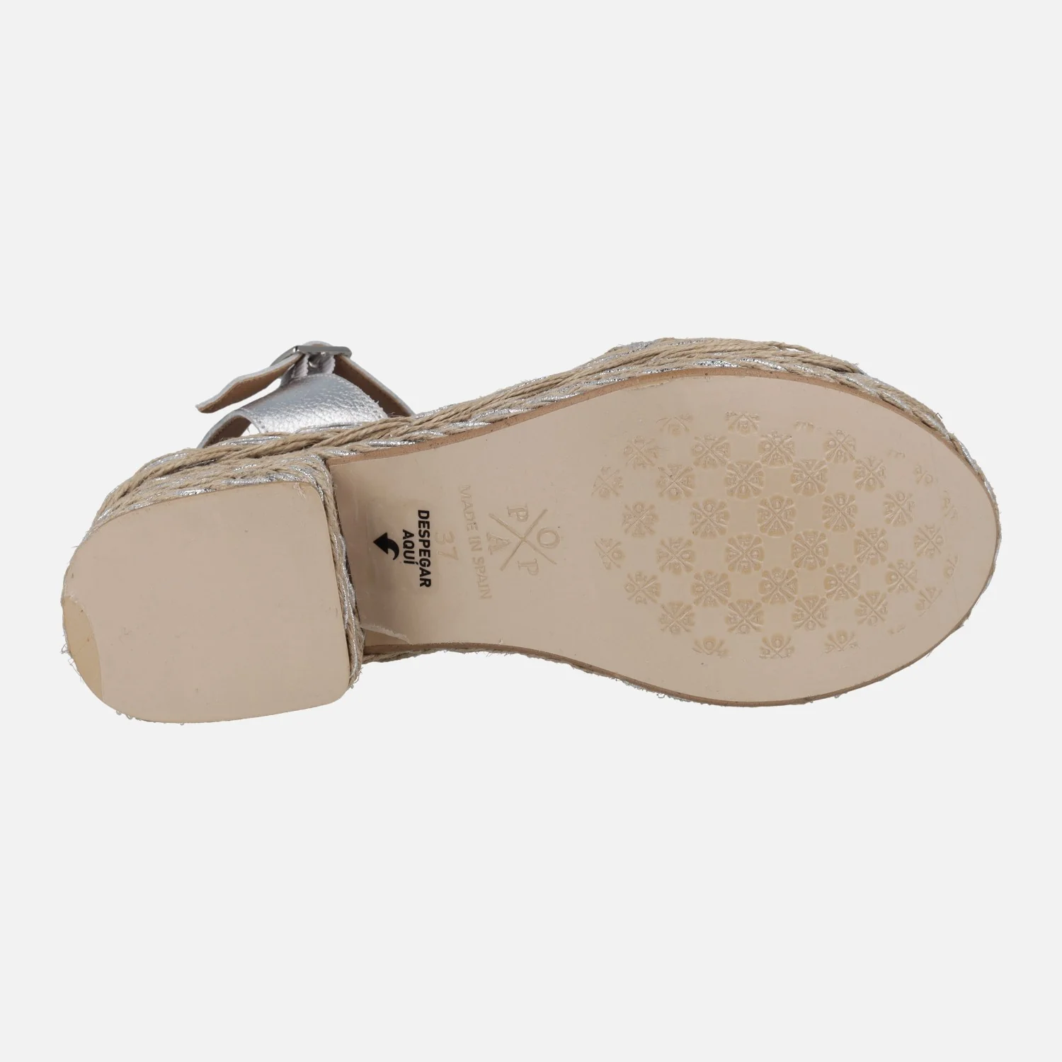 Sandalias para mujer de la marca Popa modelo Abaka Amur Plata. Sandalias con tira delantera en rafia natural entremezclada con plata. Pulsera al tobillo en piel metalizada plata, con cierre de hebilla. Interiores forrados de piel vegana (sintéticos) con planta acolchada. Tacón y plataforma de yute mezclando natural y plata. Altura trasera 8 cms (4 cms plataforma delantera). Made in Spain.