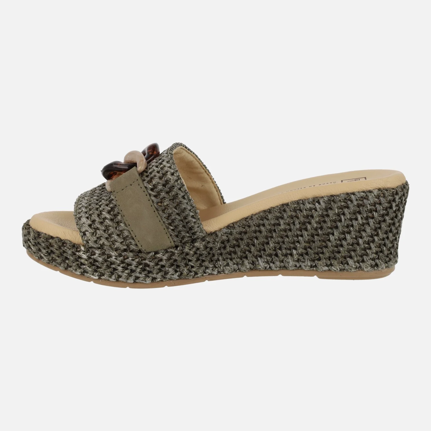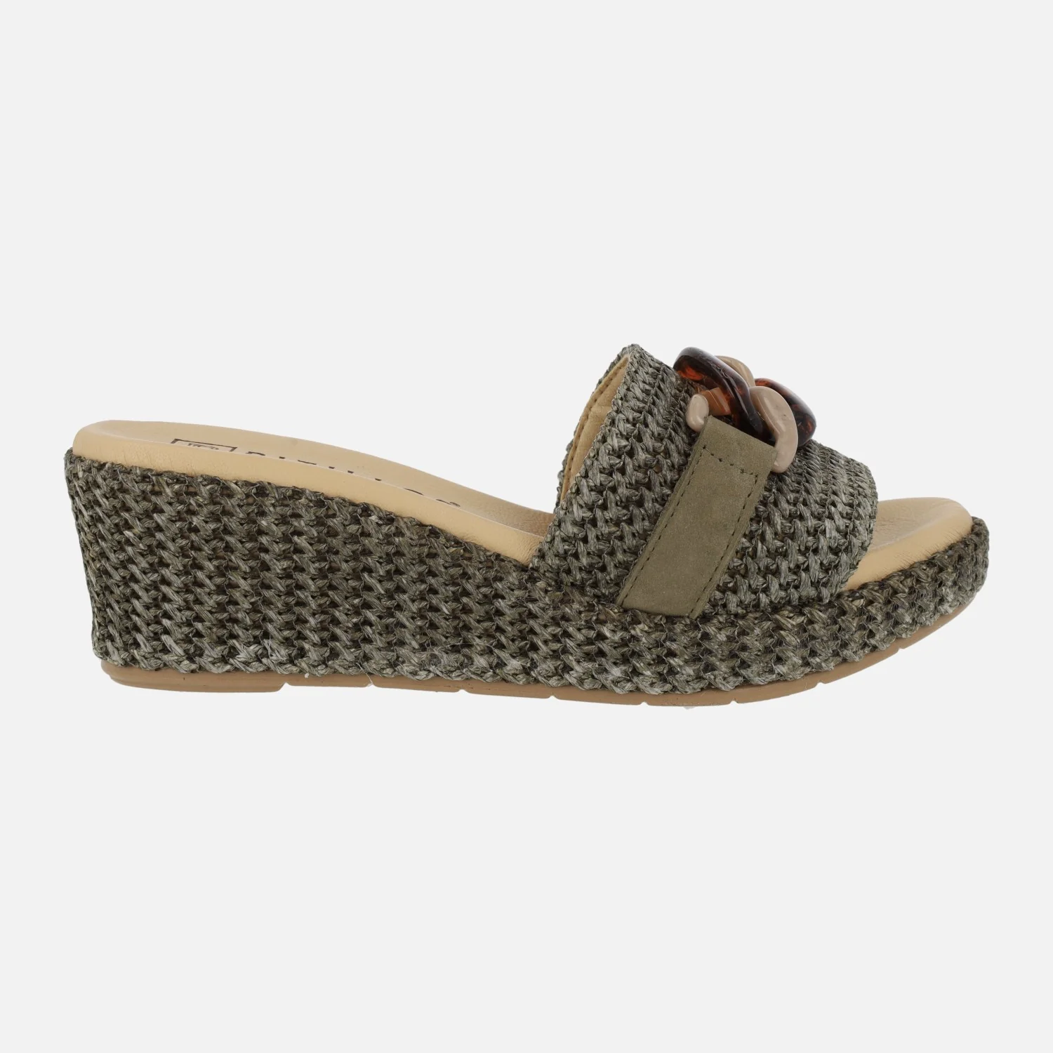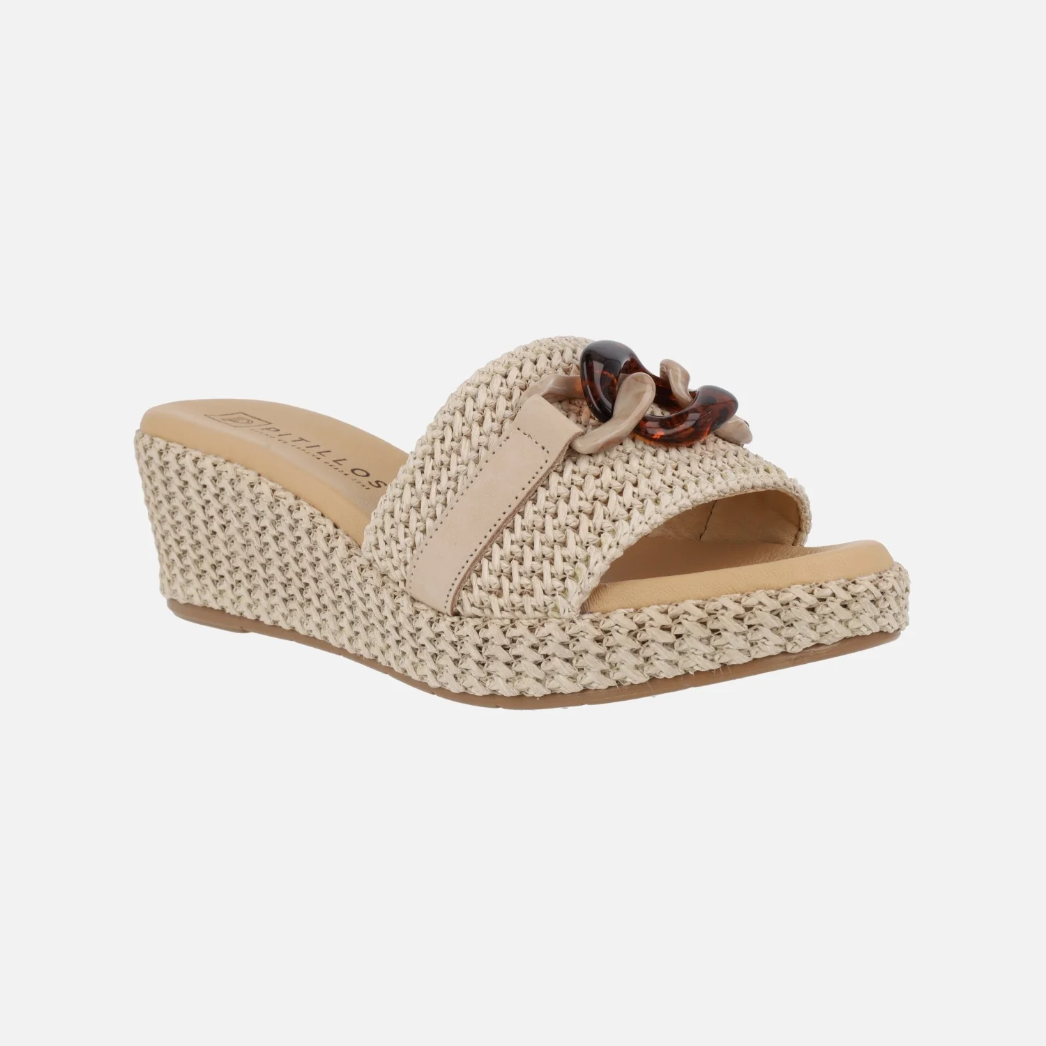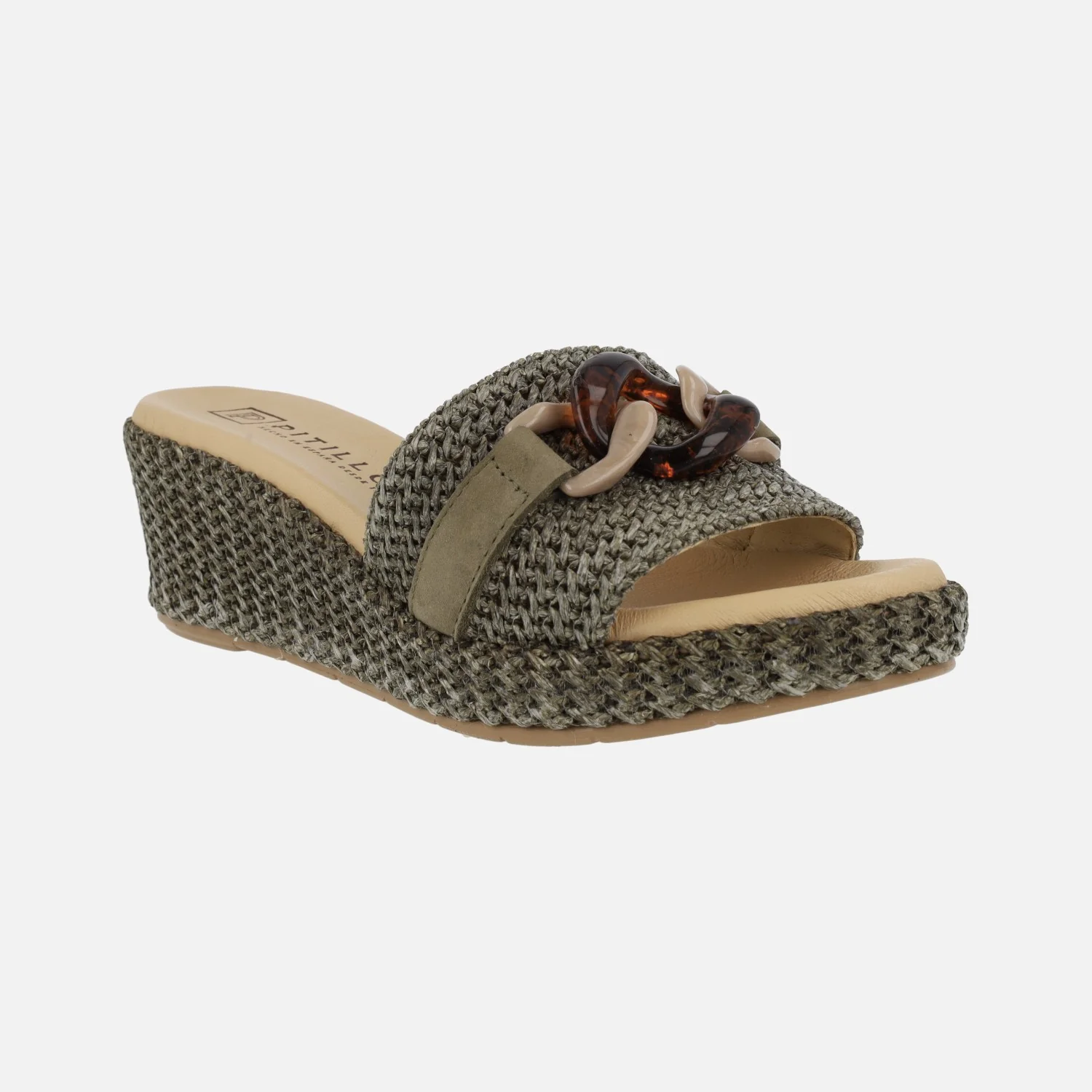 Sandalias para mujer de la marca Pitillos, modelo 5500, disponibles en color kaki o natural. Sandalias elaboradas en tejido rafia, con tira de piel cruzando la pala y adorno de cadena. Interior forrado en tejido, con planta de piel. Cuñas de 6 cms de altura trasera (3 cms parte delantera). Suela sintética. Made in Spain.