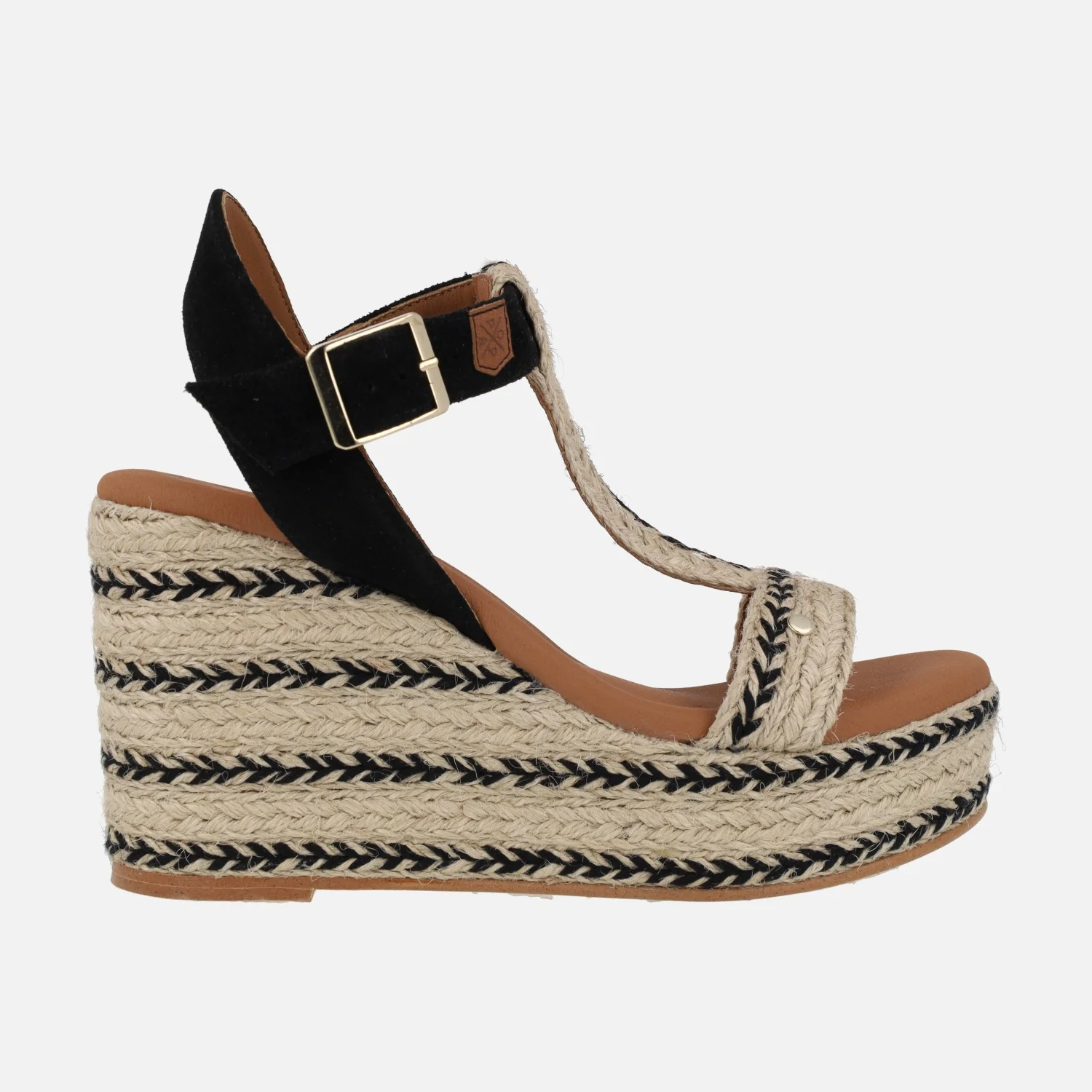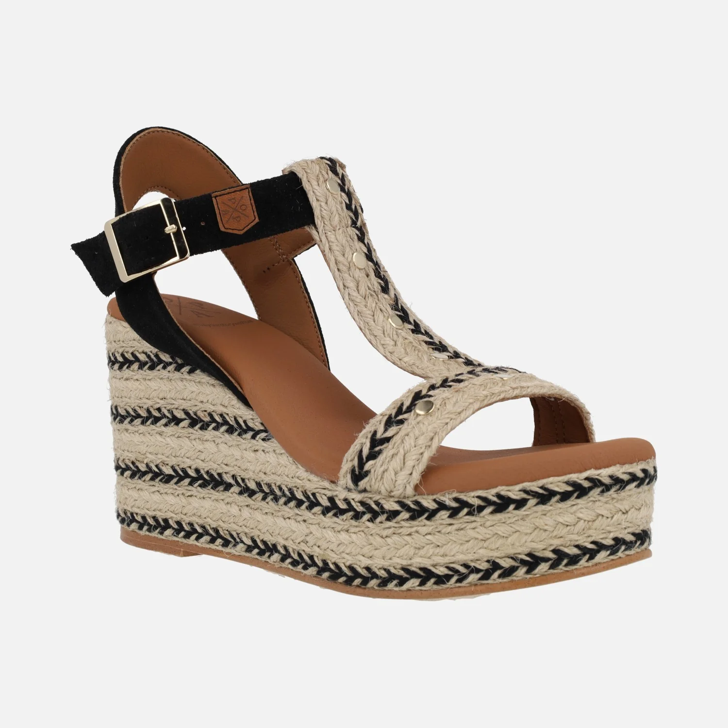 Preciosas sandalias de la nueva colección Popa, modelo Kleo Tacha Salem, disponibles en combinado negro y en combinado blanco. Sandalias elaboradas en rafia natural, con pulsera de serraje al tobillo y cierre de hebilla. Detalle de tachas doradas. Interior forrado en piel vegana. Planta acolchada. Cuña y plataforma de rafia, con una altura trasera de 10 cms (4 cms de plataforma delantera). Made in Spain.