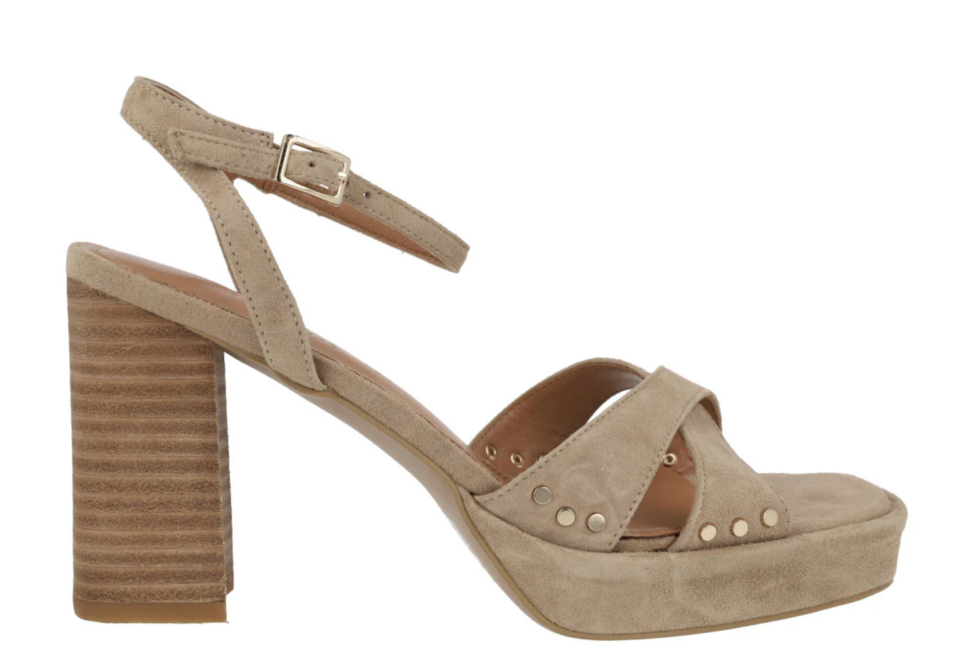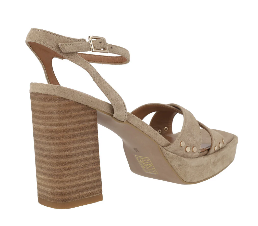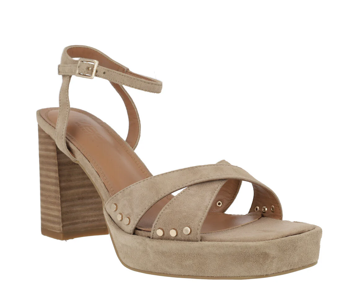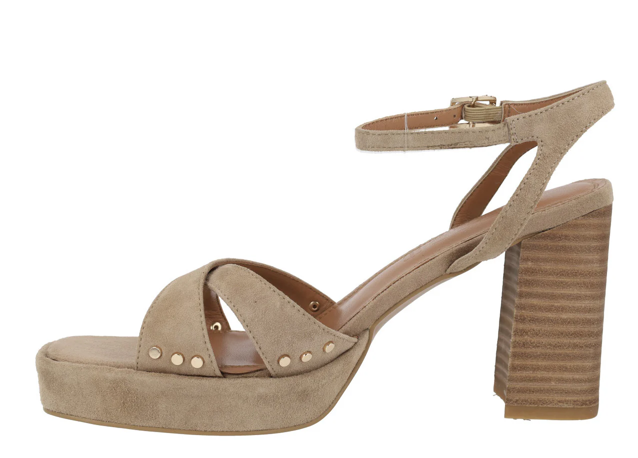 Sandalias de tacón alto para mujer modelo Fabia en ante sand. Sandalias de tiras cruzadas en la pala, elaboradas en ante beige con remaches metálicos dorados. Pulsera al tobillo con cierre de hebilla. Forro y planta de piel. Tacones altos, de madera, con aproximadamente 10 cms de altura. Plataforma delantera forrada de ante, de 2 cms.