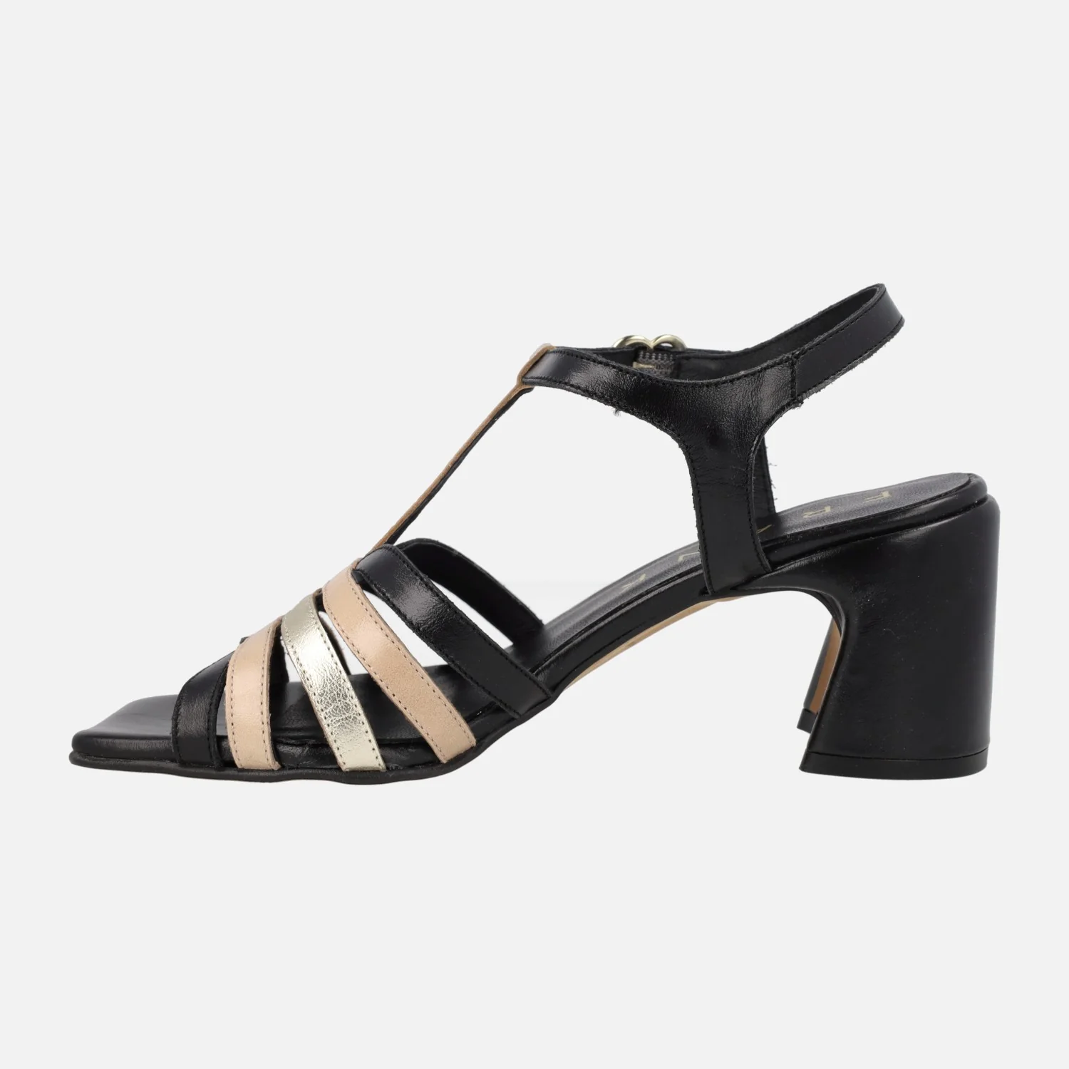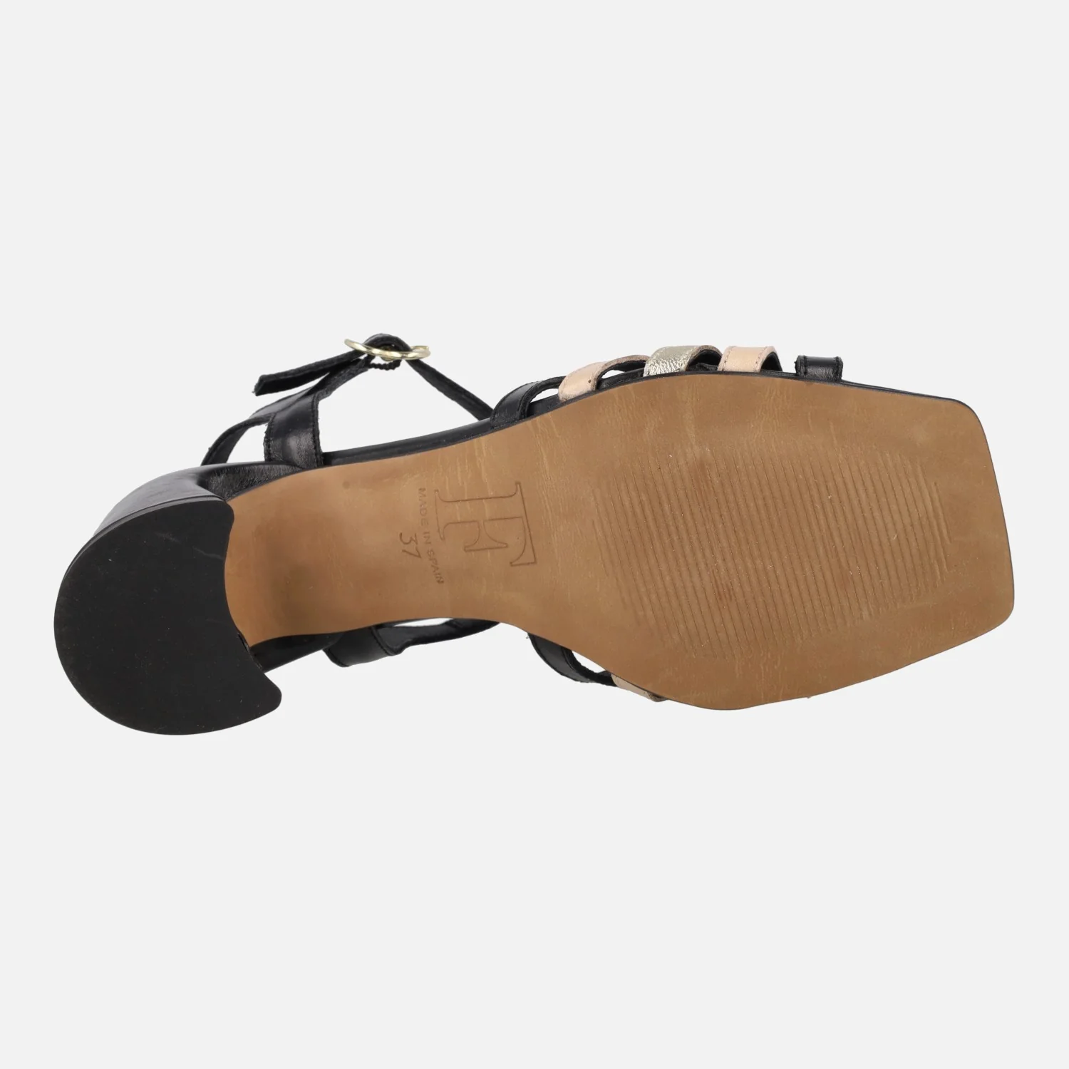 Sandalias negras de piel de la marca Design Frank modelo 04789. Sandalias con fondo negro, que combinan en la parte delantera con distintas tiras en nude y en dorado. Cierre de hebilla. Forro y planta de piel. Tacones de 7 cms de altura. Made in Spain.