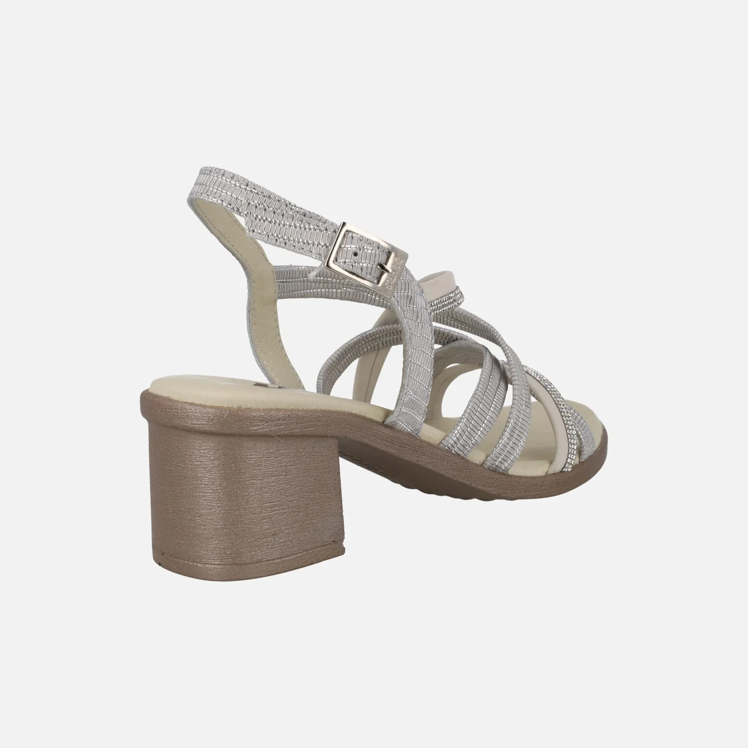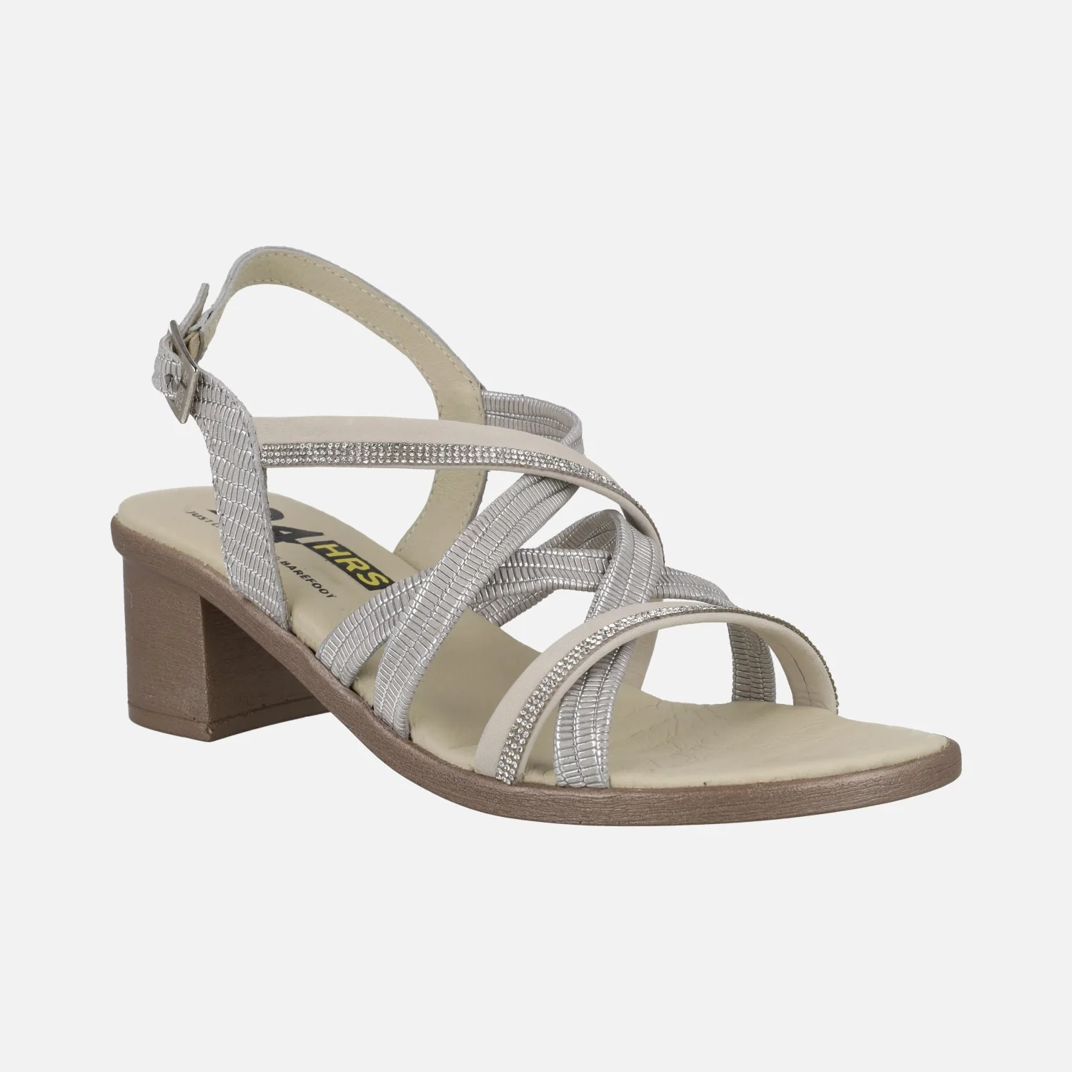 Sandalias para mujer de la marca 24 Horas modelo 26047 crema/panna. Sandalias formadas por tiras de piel que se van cruzando en el empeine, tiras con distintos materiales y acabados: nobuck beige, strass y tiras grabadas en tonos grises/plata. Planta acolchada y forro de piel. Tacones anchos, de 5,5 cms de altura. Made in Spain.