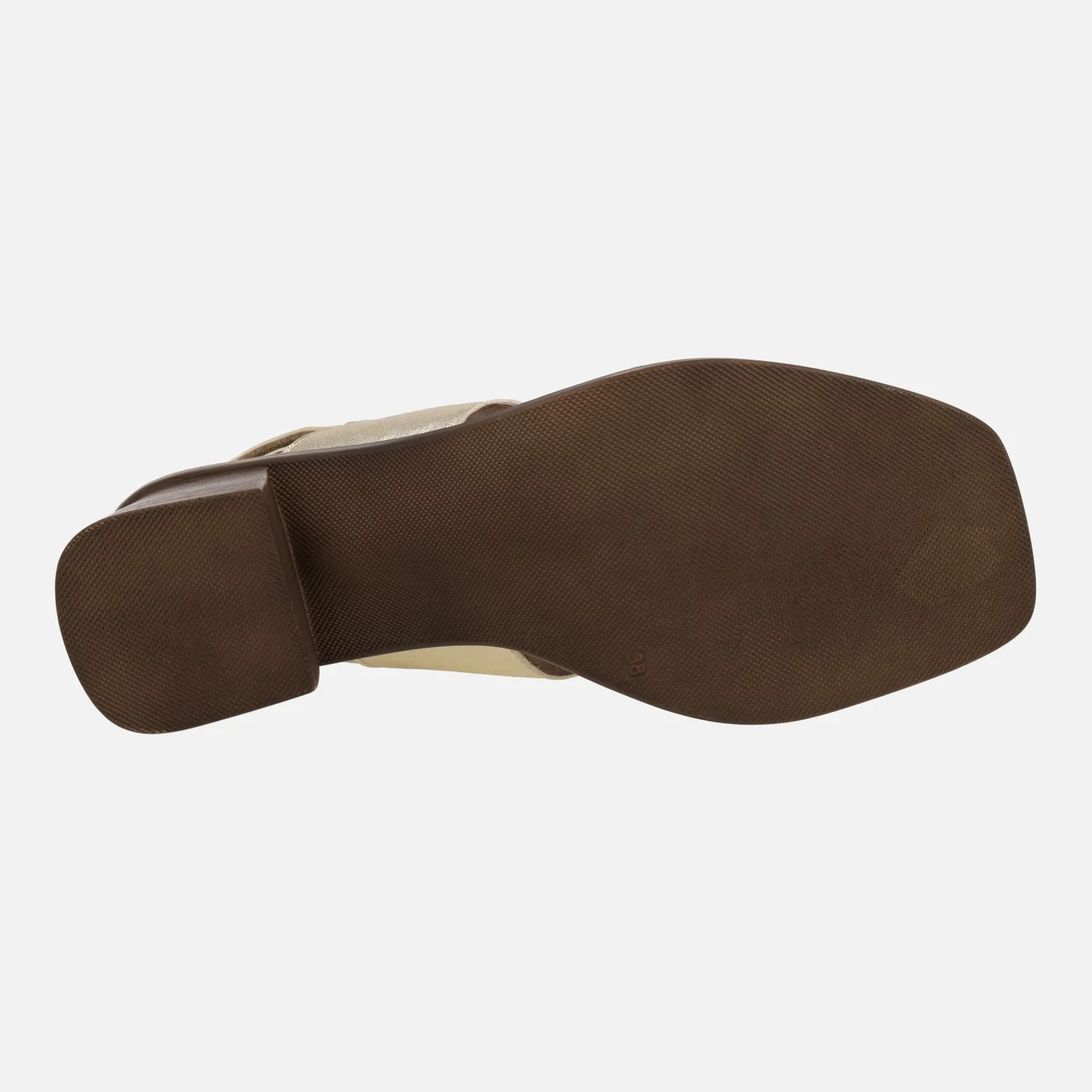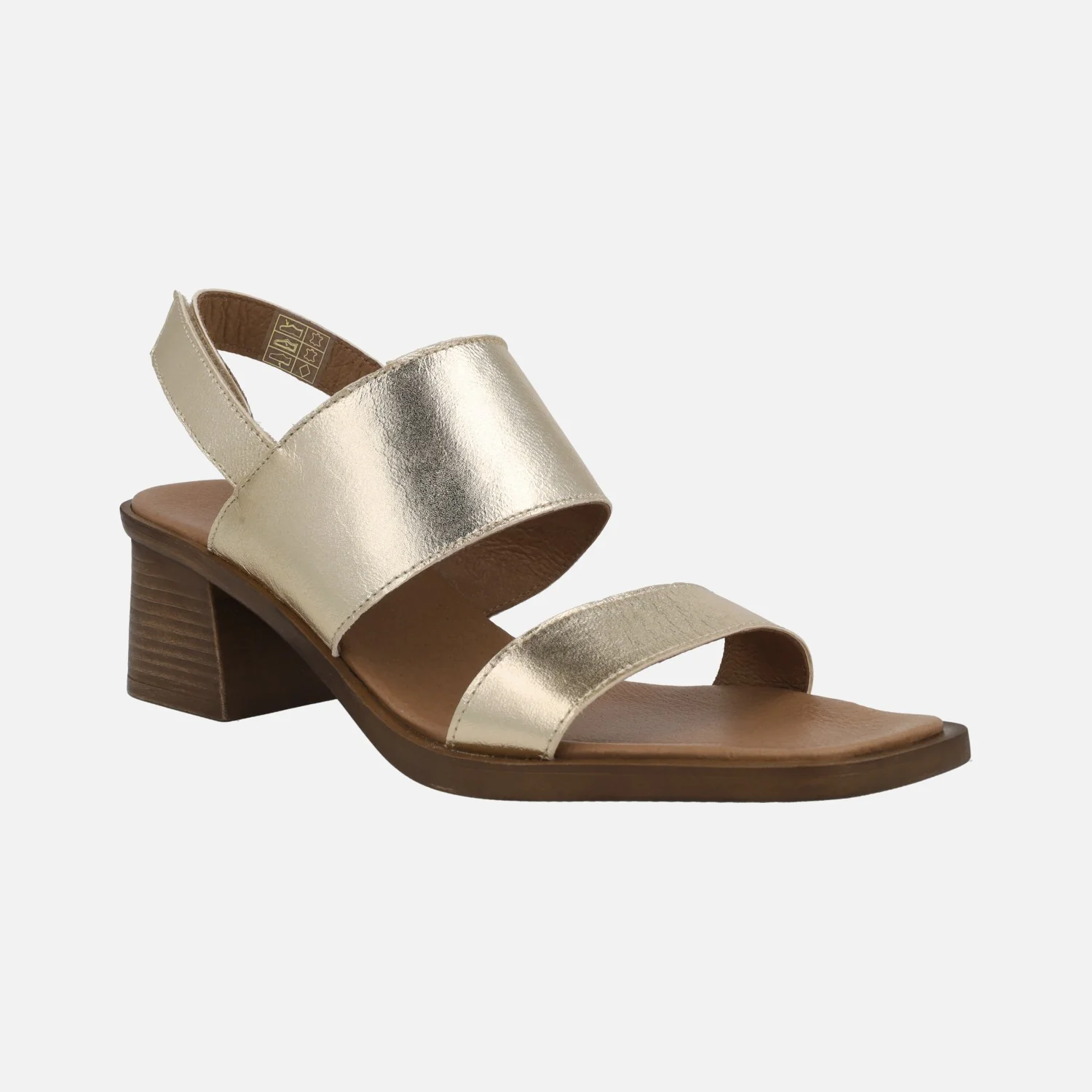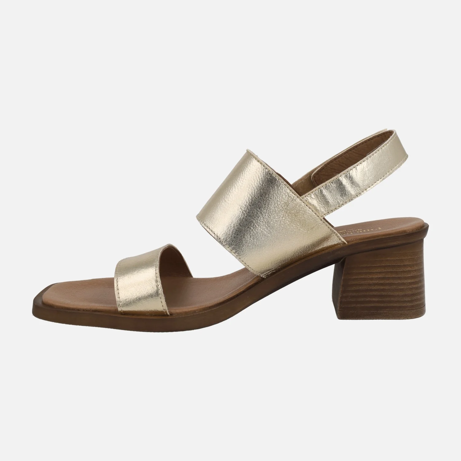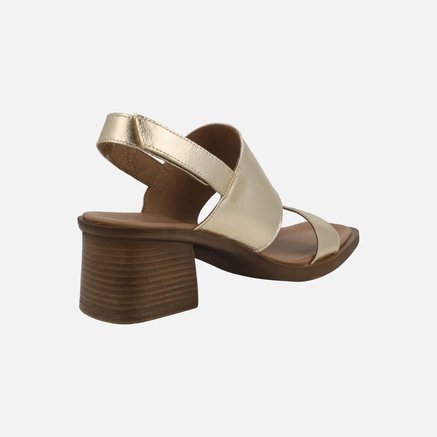 Sandalias de piel para mujer de la marca Funchal lady, modelo 42562 Desert, disponible en piel metalizada dorada. Sandalias de piel con tira al talón con cierre de velcro. Forro y planta de piel. Muy ligeras, con tacones de 6 cms de altura. Made in Spain.