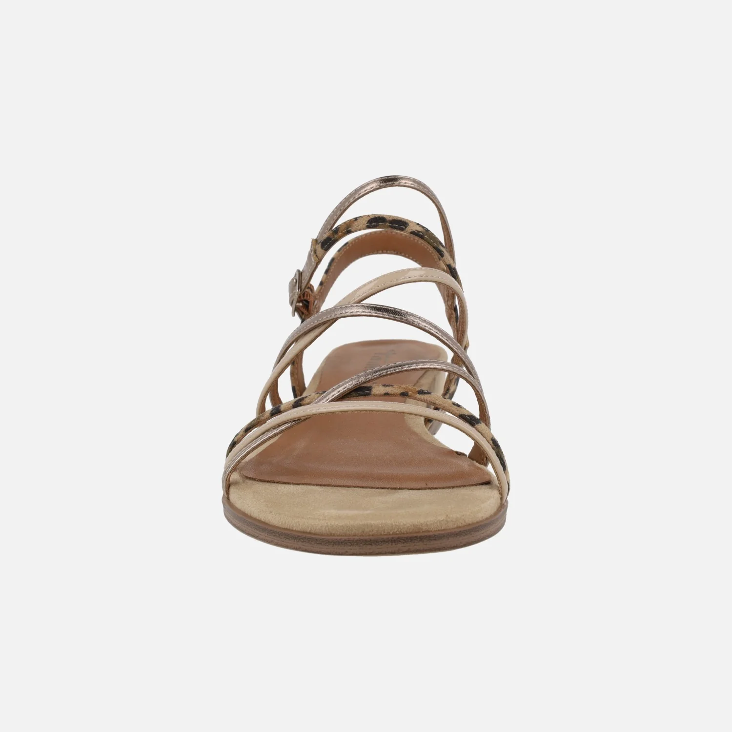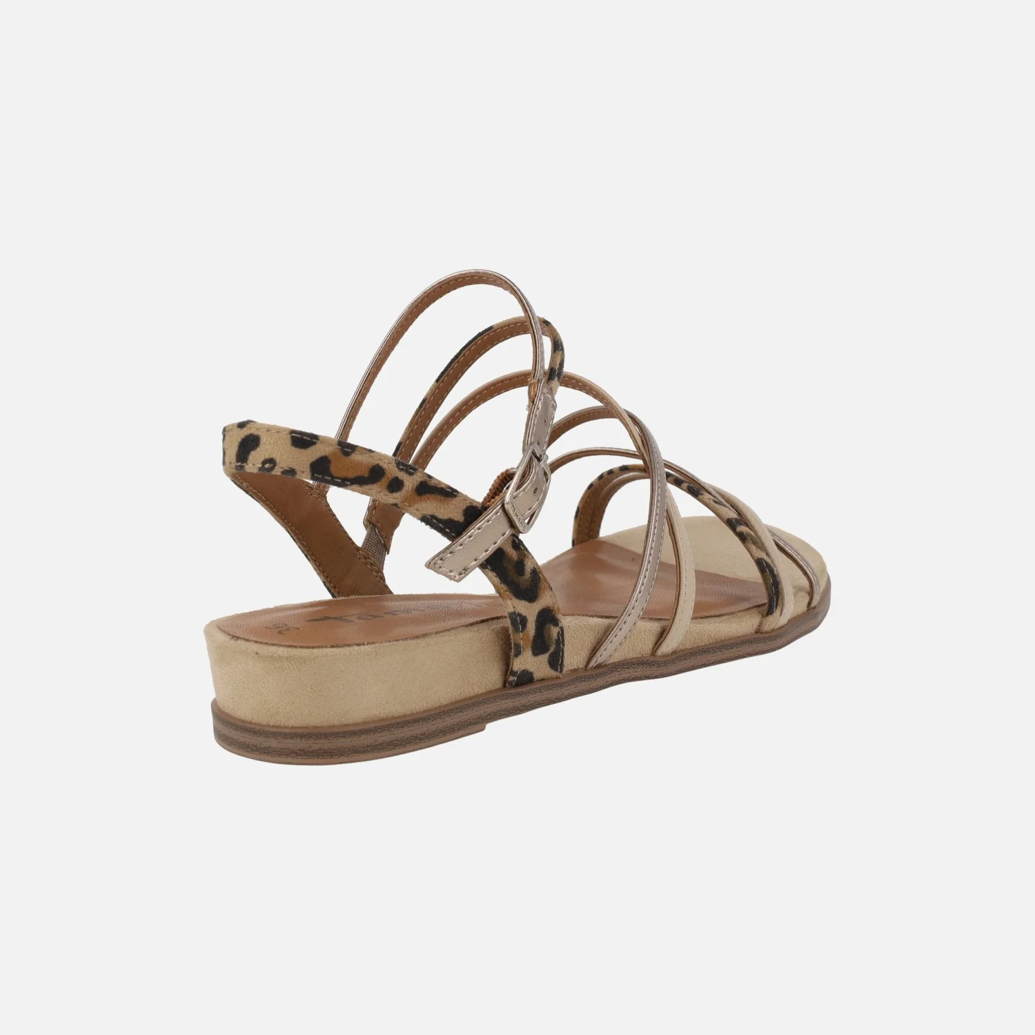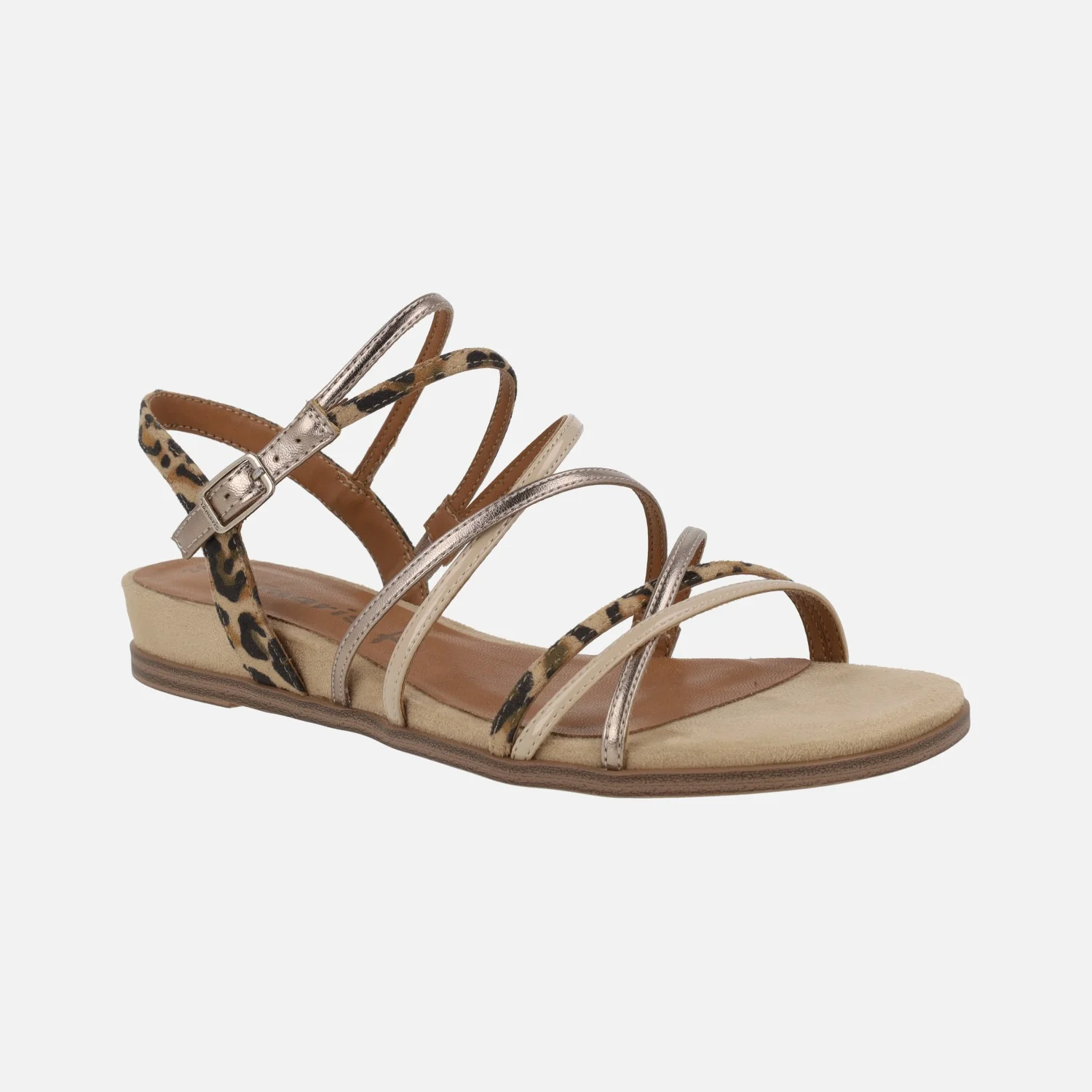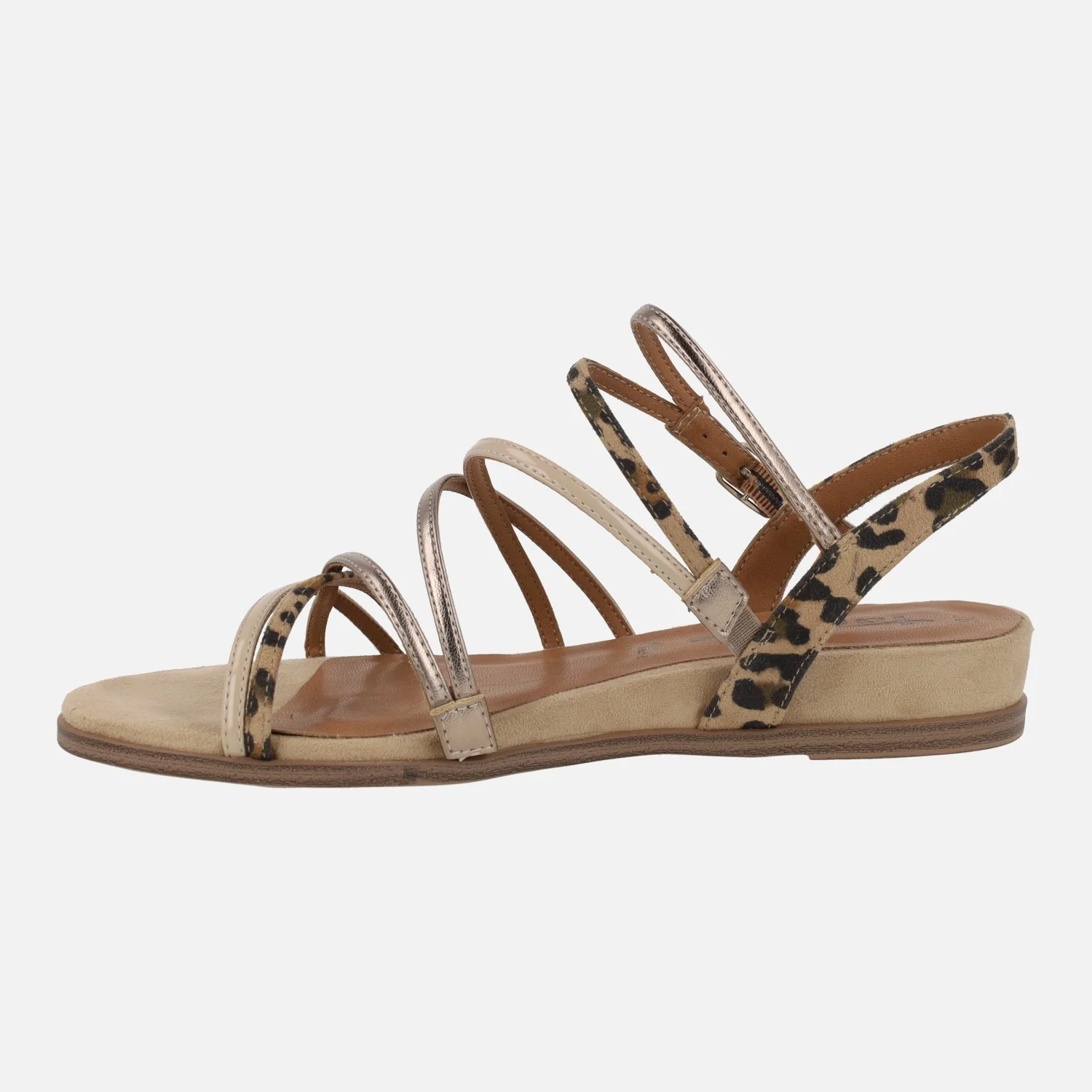Sandalias de tiras marca Tamaris modelo 1-28103 Tan. Sandalias de tiras sintéticas y textiles, con distintos acabados: charol beige, metalizados y animal print leopardo. Cierre de hebilla ajustable. Interiores en sintéticos. Piso de goma, cuña baja de 2,5 cms de altura trasera.
