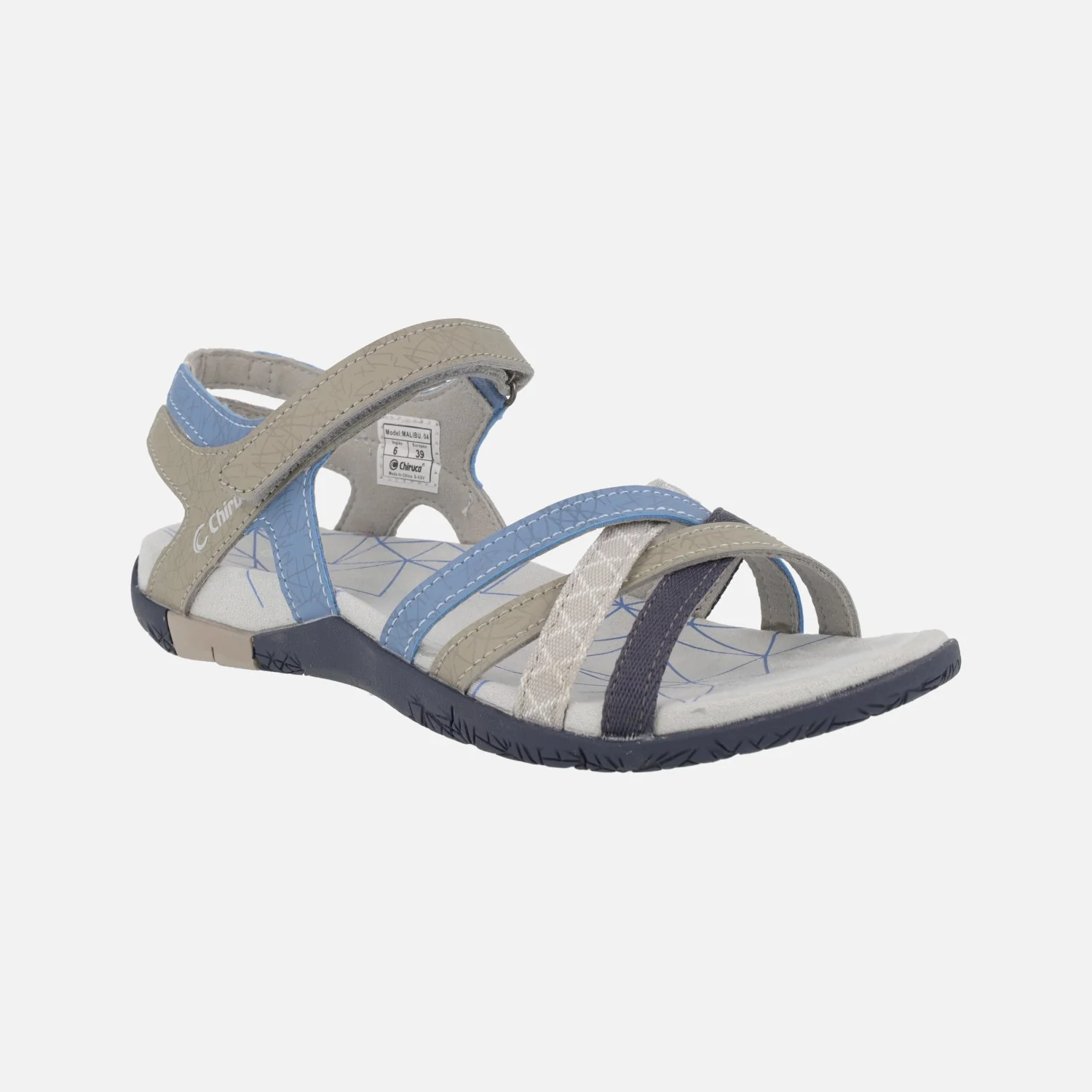 Sandalias de tiras entrelazadas modelo Malibu 04 de la marca Chiruca. Sandalias elaboradas en sintéticos y tejido, con cierre de velcro. Interior textil. Entresuela de EVA, suela de caucho. Muy ligeras, ideales para tus viajes y tus rutas de senderismo de baja intensidad. Altura trasera 3 cms.