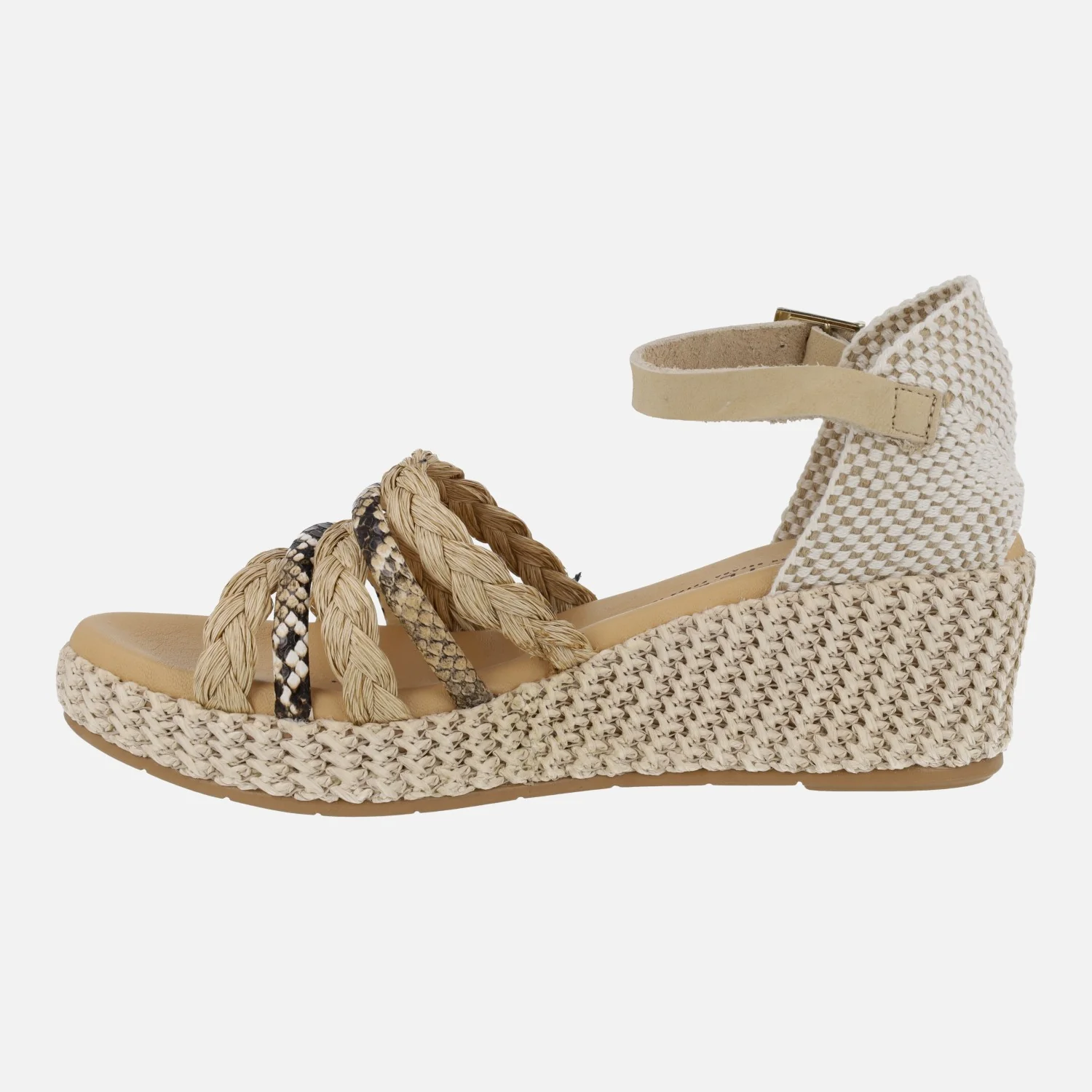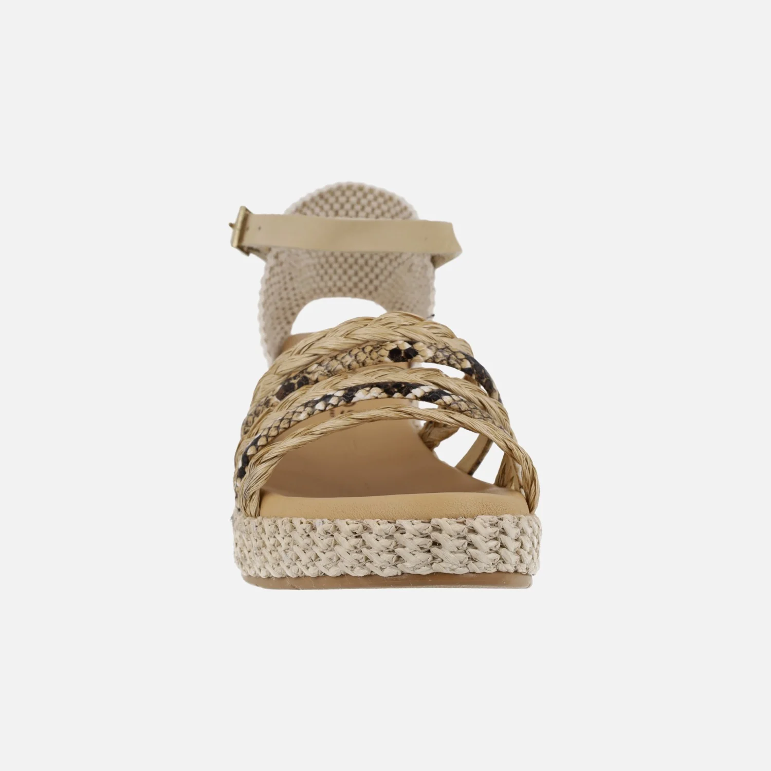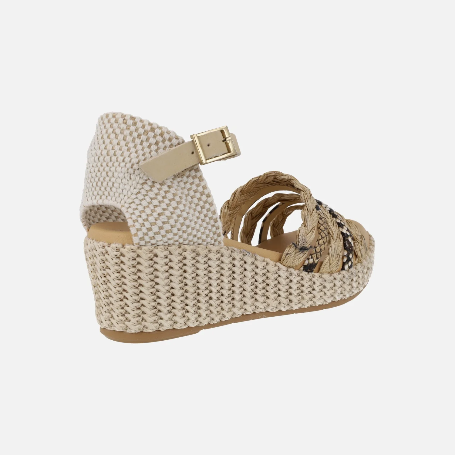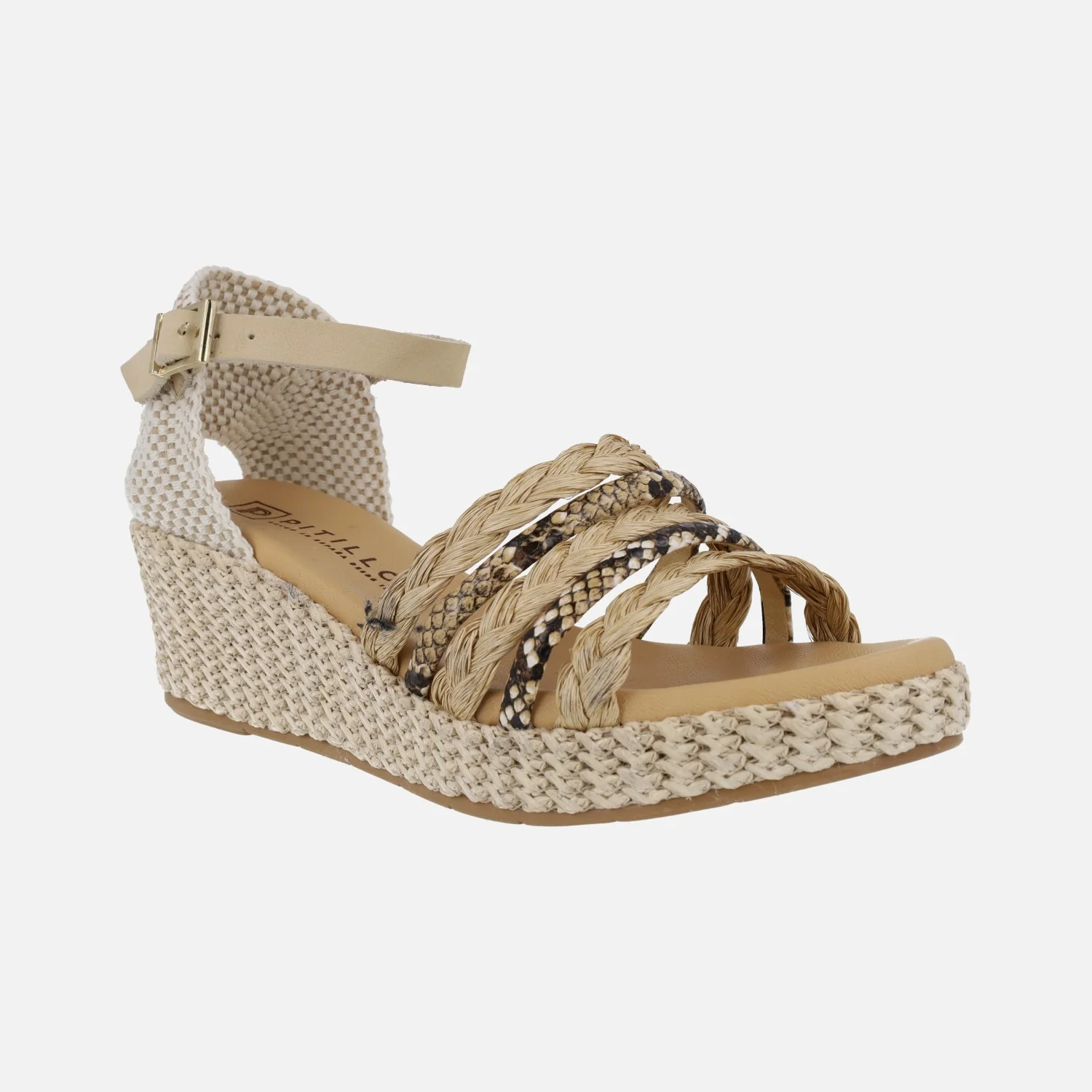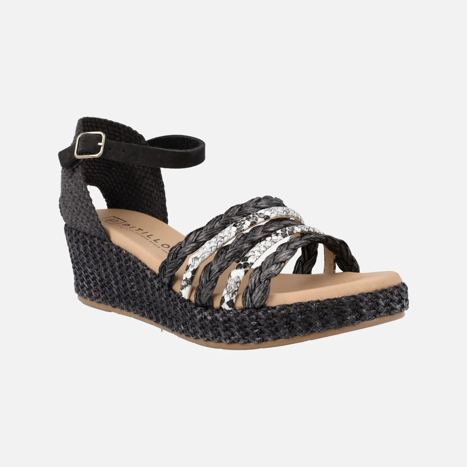 Preciosas sandalias Pitillos modelo 10564, disponibles en combinado negro o natural. Sandalias con tiras combinadas en la parte delantera, en rafia y piel con print animal, talonera textil y pulsera de piel al tobillo ajustable con hebilla. Interiores forrados de piel. Cuña de rafia, de 6 cms de altura trasera (2,5 cms parte delantera).