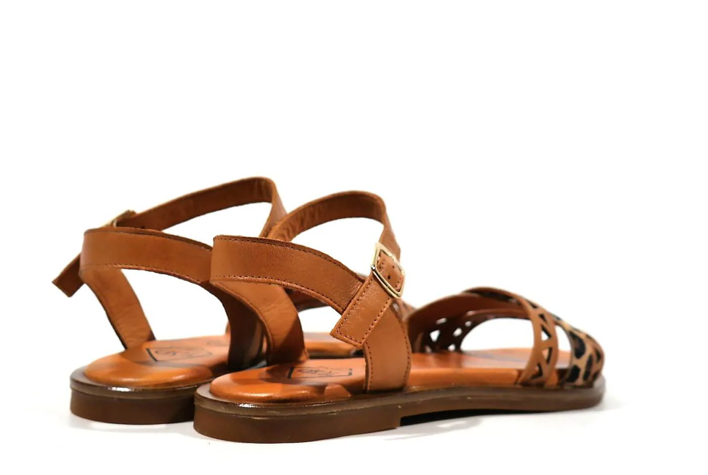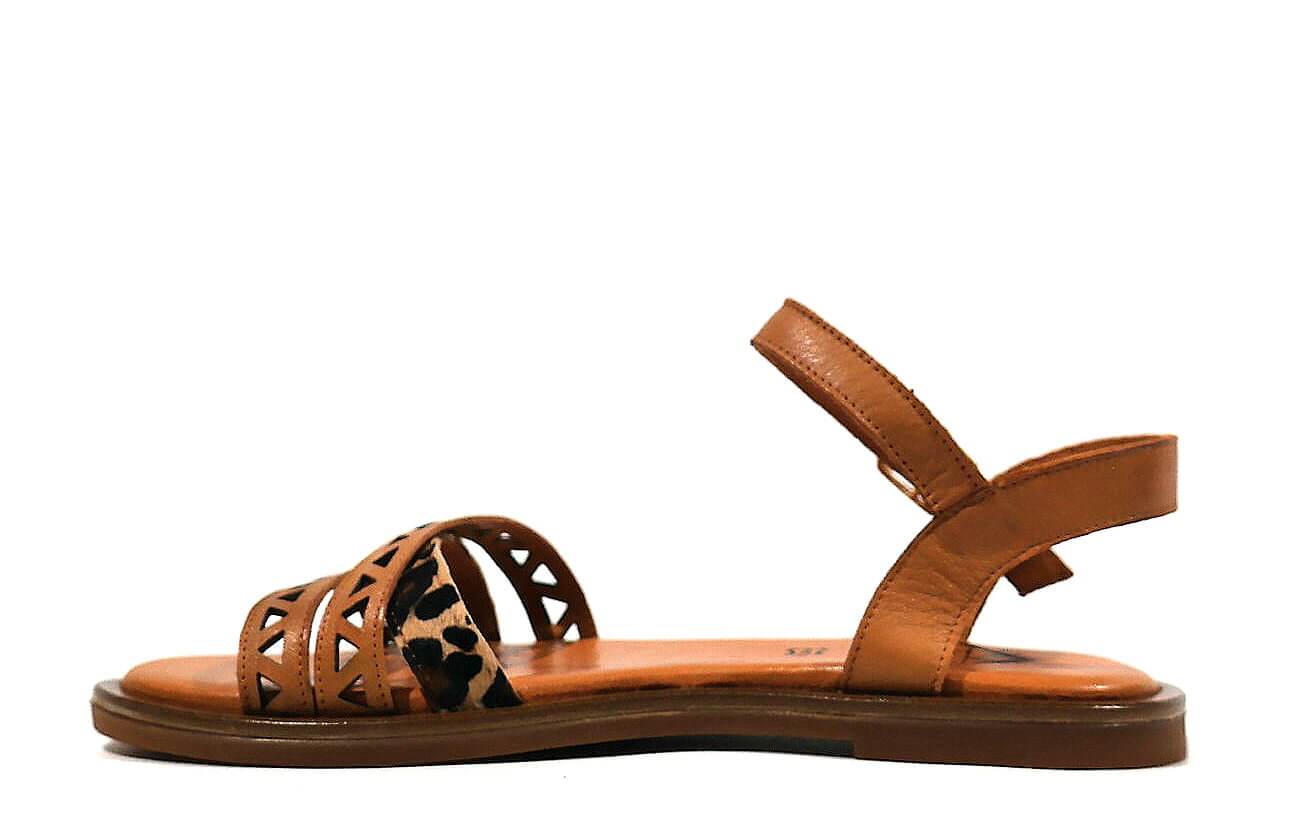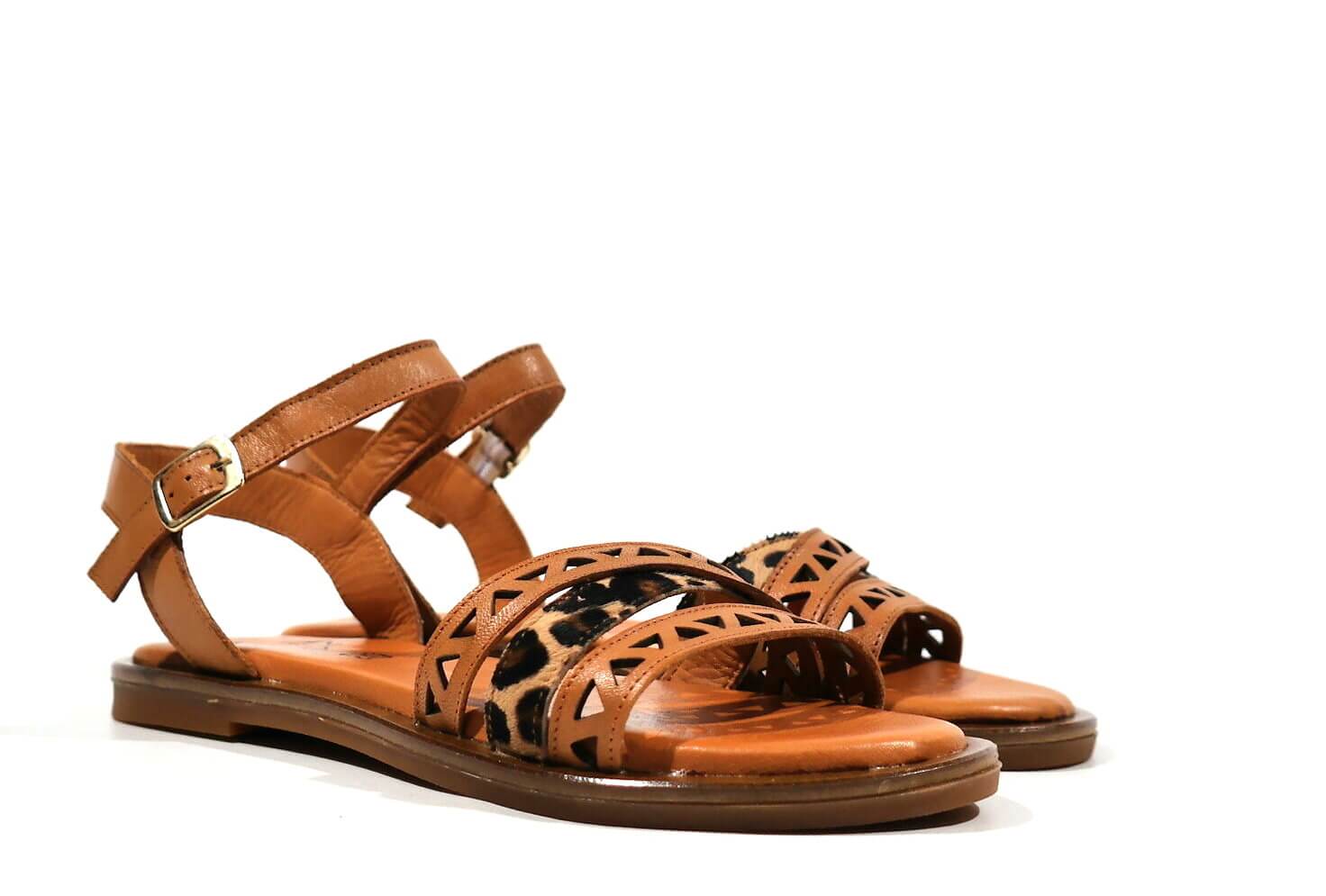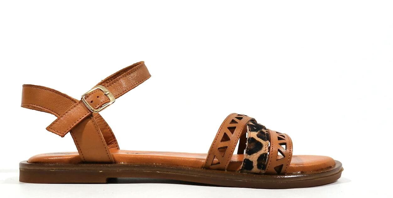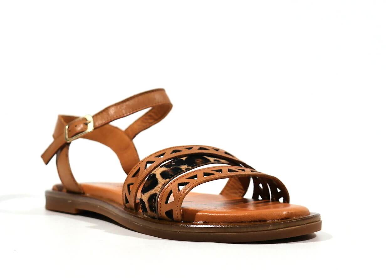 Sandalias para mujer TOP3 modelo 22683. Sandalias de tiras realizadas en piel cuero combinado con pieza en animal print leopardo. Pulsera con cierre de hebilla al tobillo. Forro y plantillas de piel. Piso fino de goma, de 1,5 cms de altura.