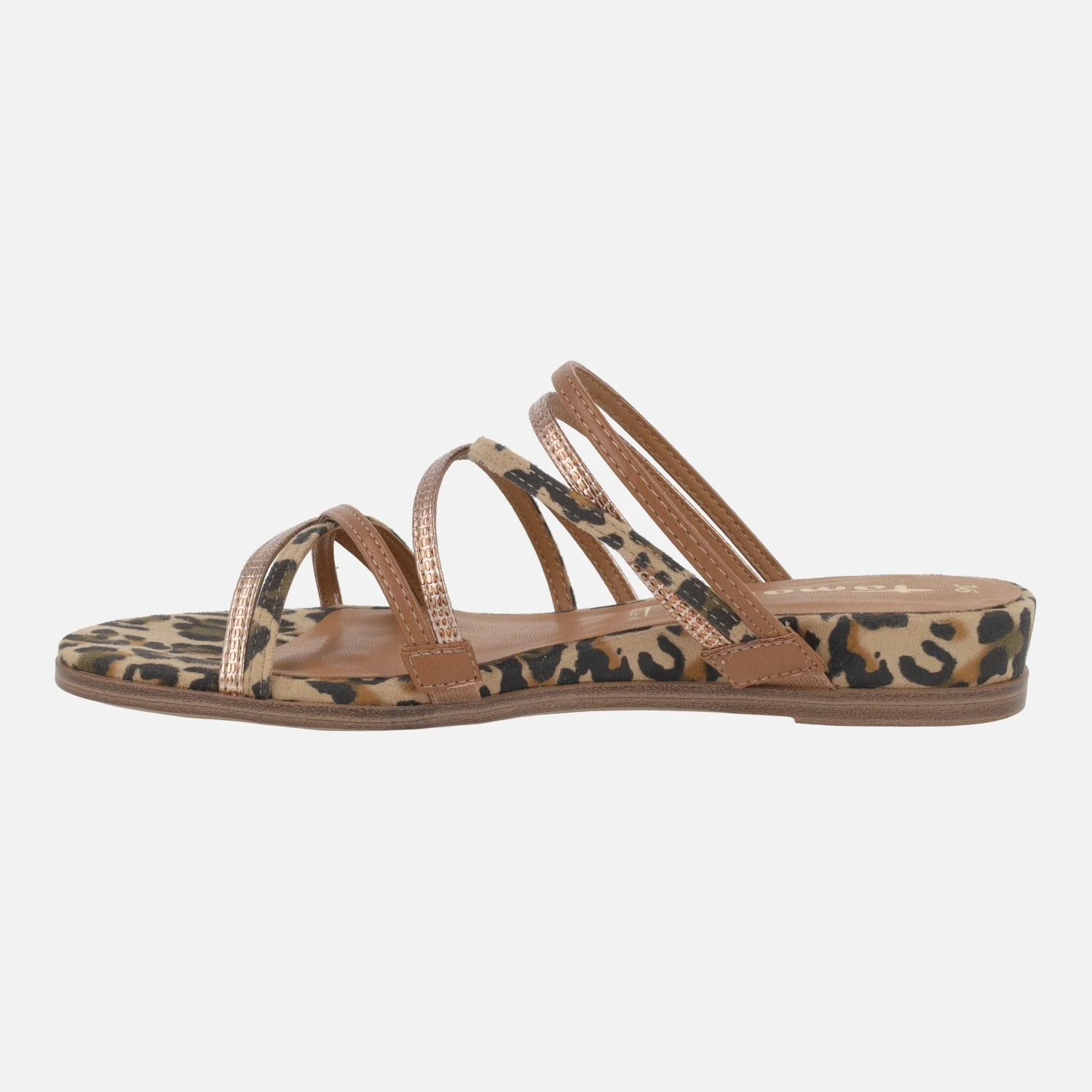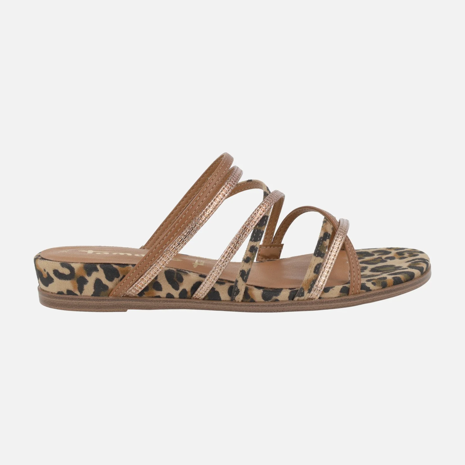 Sandalias de tiras combinadas de la marca Tamaris, modelo 1-27122 Combi leopardo. Sandalias de tiras que combinan animal print leopardo, metalizados y marrón. Abiertas de talón. Exterior en tejido y sintéticos, igual que el interior. Cuña baja, forrada en animal print leopardo, de 2,5 cms de altura trasera (1,5 parte delantera).