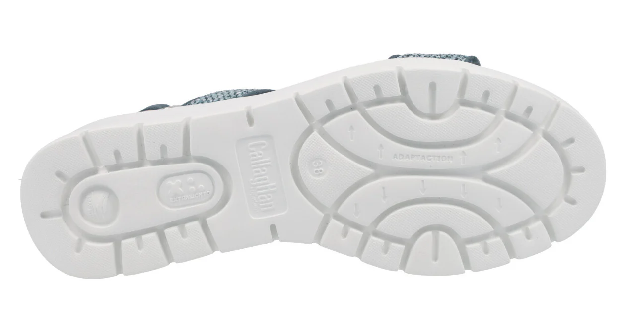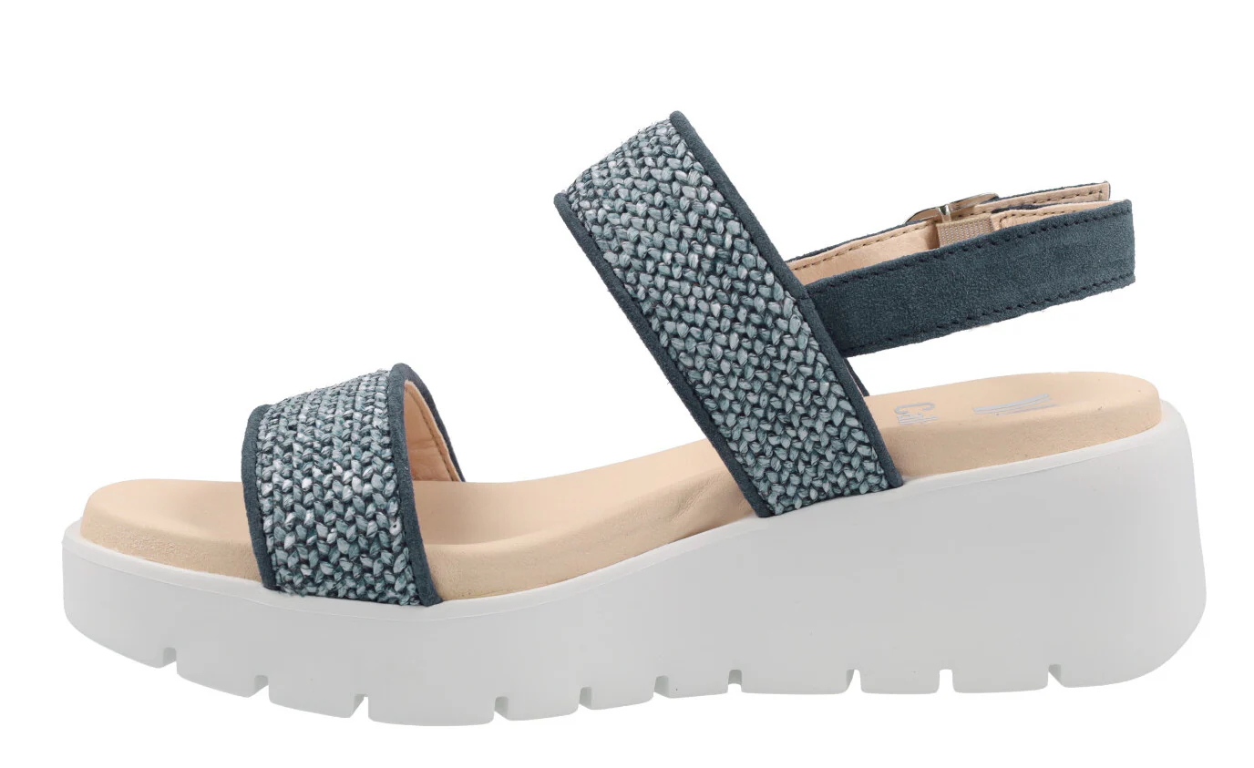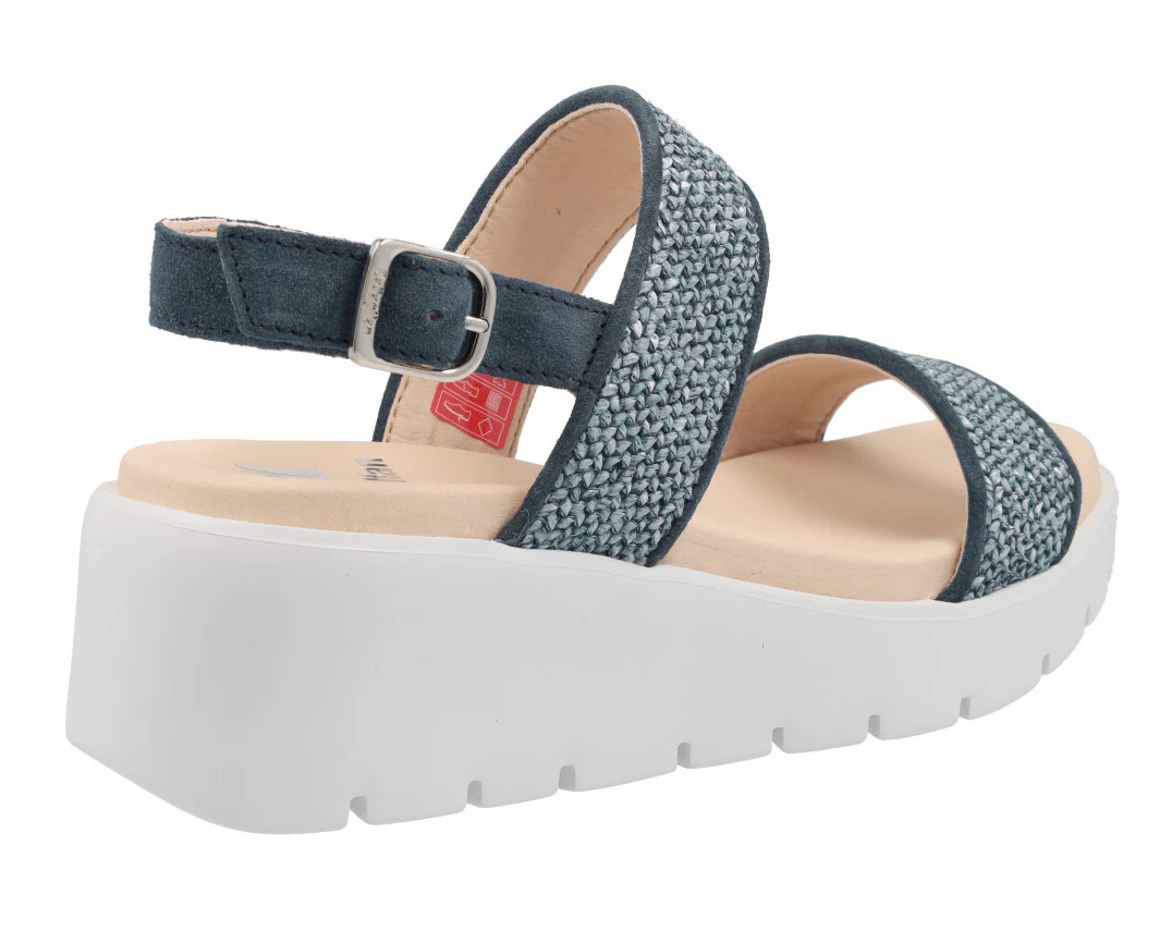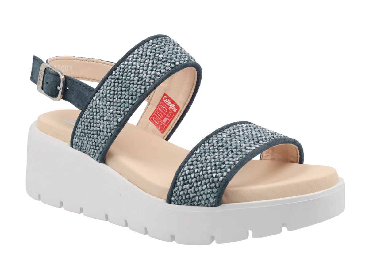 Sandalias confort para mujer de la marca Callaghan modelo 32001 Marino. Sandalias elaboradas en serraje azul marino y rafia trenzada azul. Con dos tiras anchas en la parte delantera y una tira con hebilla al talón. Interior y planta en microfibra. Piso blanco de goma muy ligero (Extralight) de 6 cms de altura en la parte trasera (3 cms parte delantera).