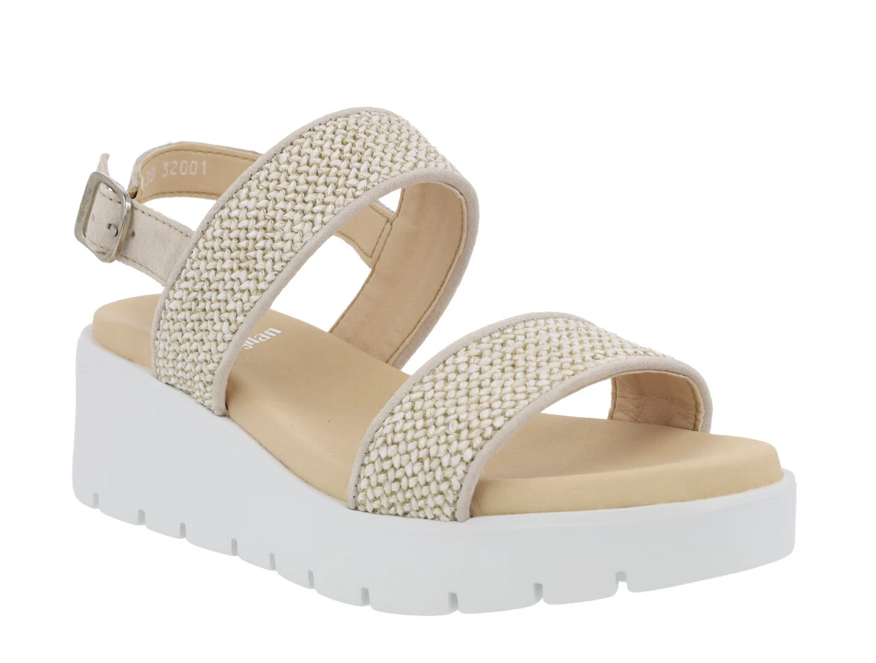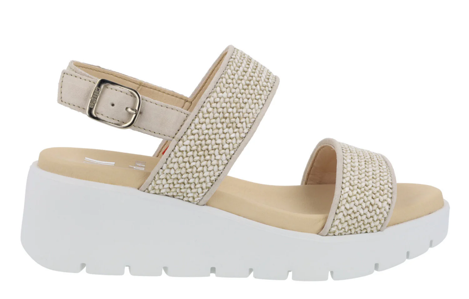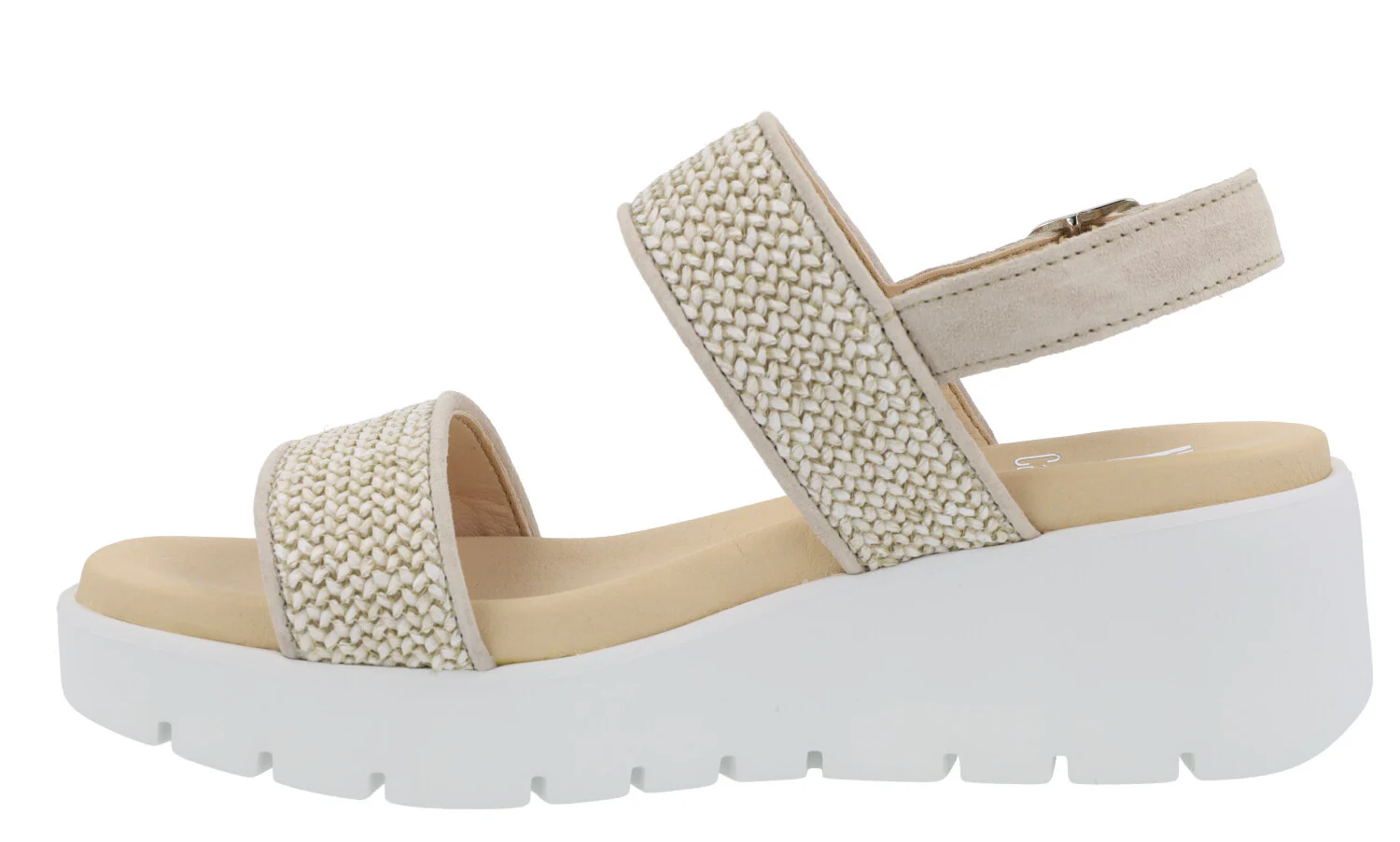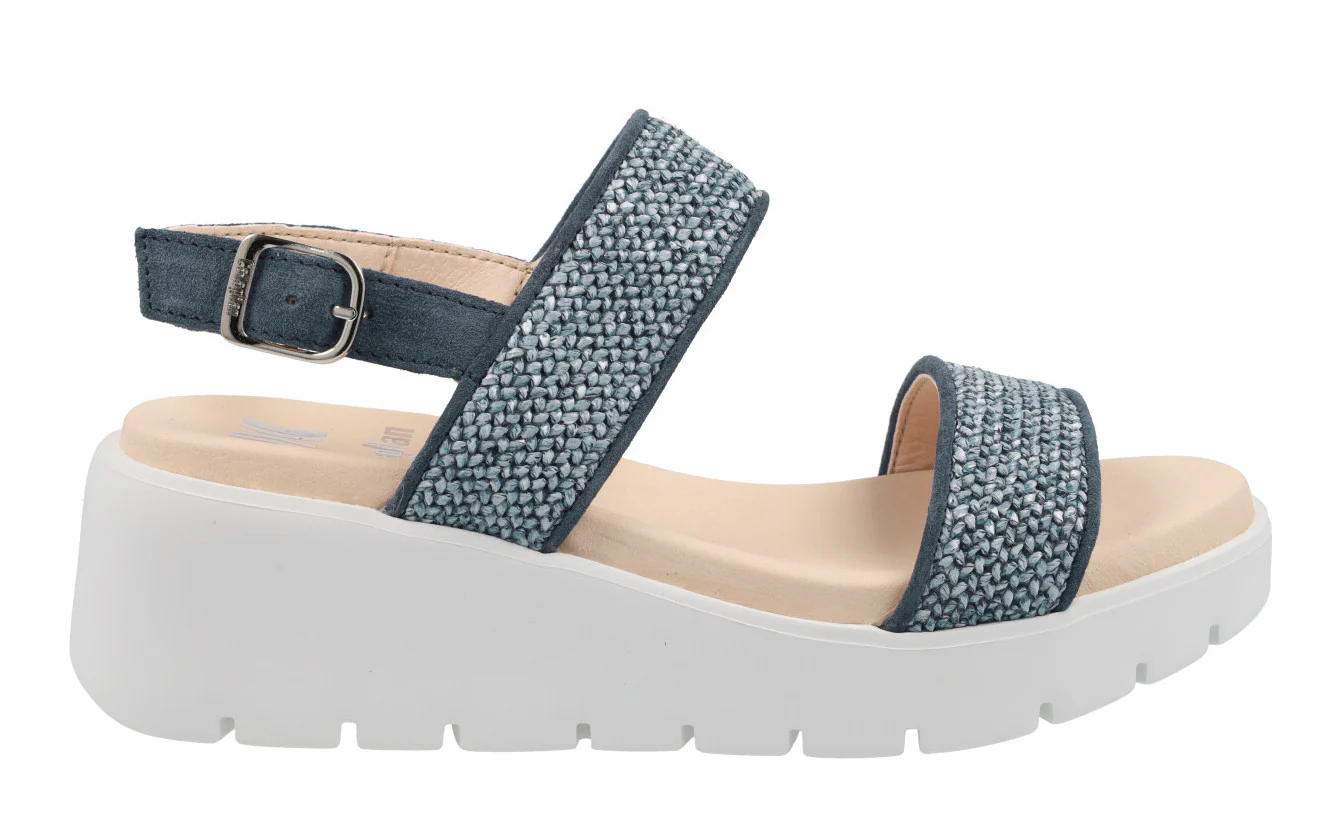 Sandalias confort para mujer de la marca Callaghan modelo 32001 Marino. Sandalias elaboradas en serraje azul marino y rafia trenzada azul. Con dos tiras anchas en la parte delantera y una tira con hebilla al talón. Interior y planta en microfibra. Piso blanco de goma muy ligero (Extralight) de 6 cms de altura en la parte trasera (3 cms parte delantera).