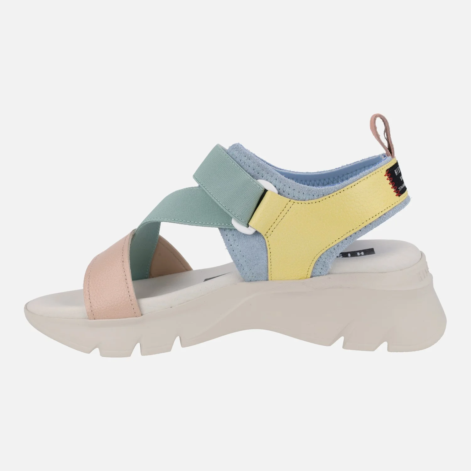 Sandalias multicolor de la marca Hispanitas modelo Dakar HV254007 nude – celeste – eucalipto. Sandalias elaboradas en piel y tejido, en tonos multicolor. Cierre de velcro. Interiores en tejido microfibra. Plataforma de goma EVA, muy ligera, de 6 cms de altura trasera (3,5 cms en la parte delantera). Sistema TRIFLOW de triple almohadillado para un gran confort al caminar.