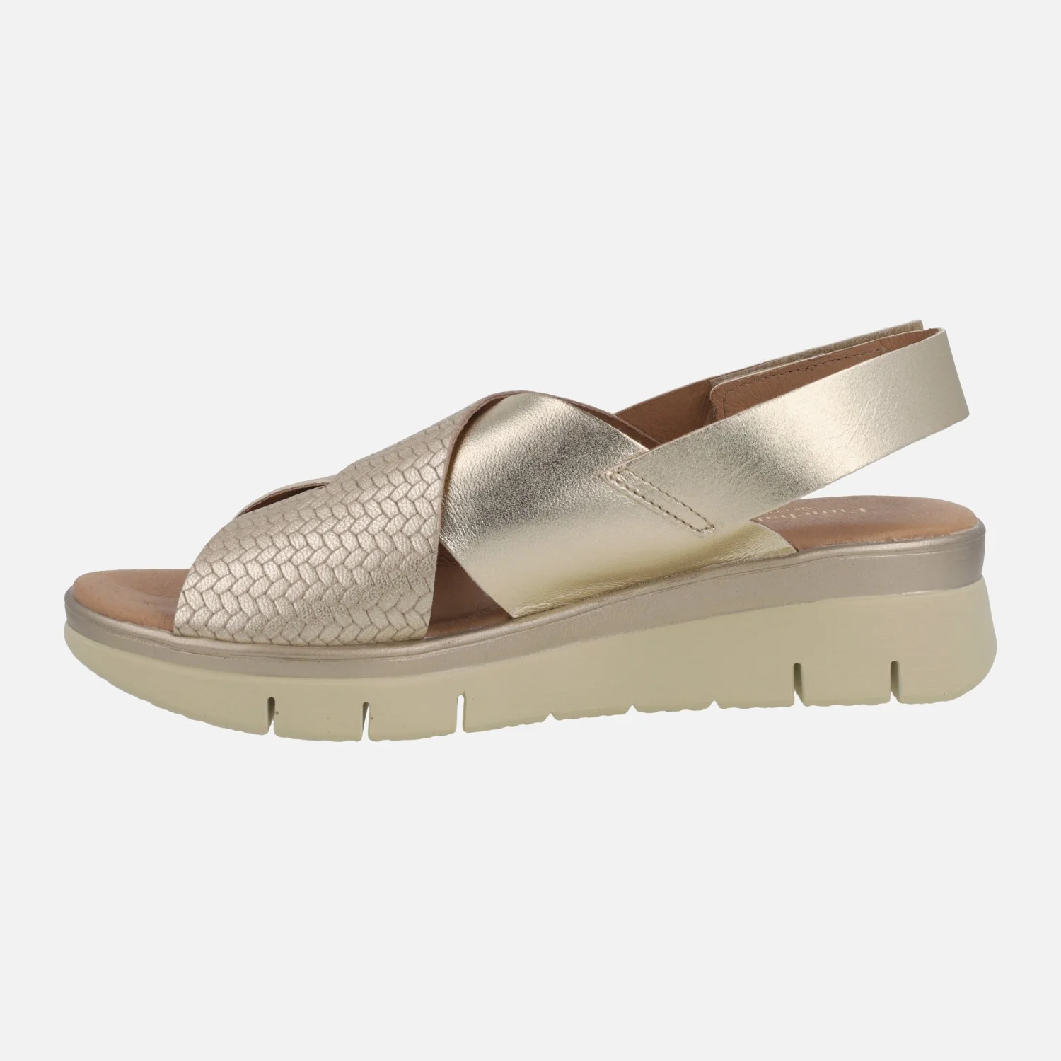 Sandalias de piel para mujer de la marca Funchal lady modelo 35012 Oro. Sandalias de piel con distintos acabados, lisa y efecto trenzado, en color oro. Tira al talón con cierre de velcro. Forro y planta de piel. Piso de goma, con cuñas de 4,5 cms de altura trasera (2 cms parte delantera). Made in Spain.
