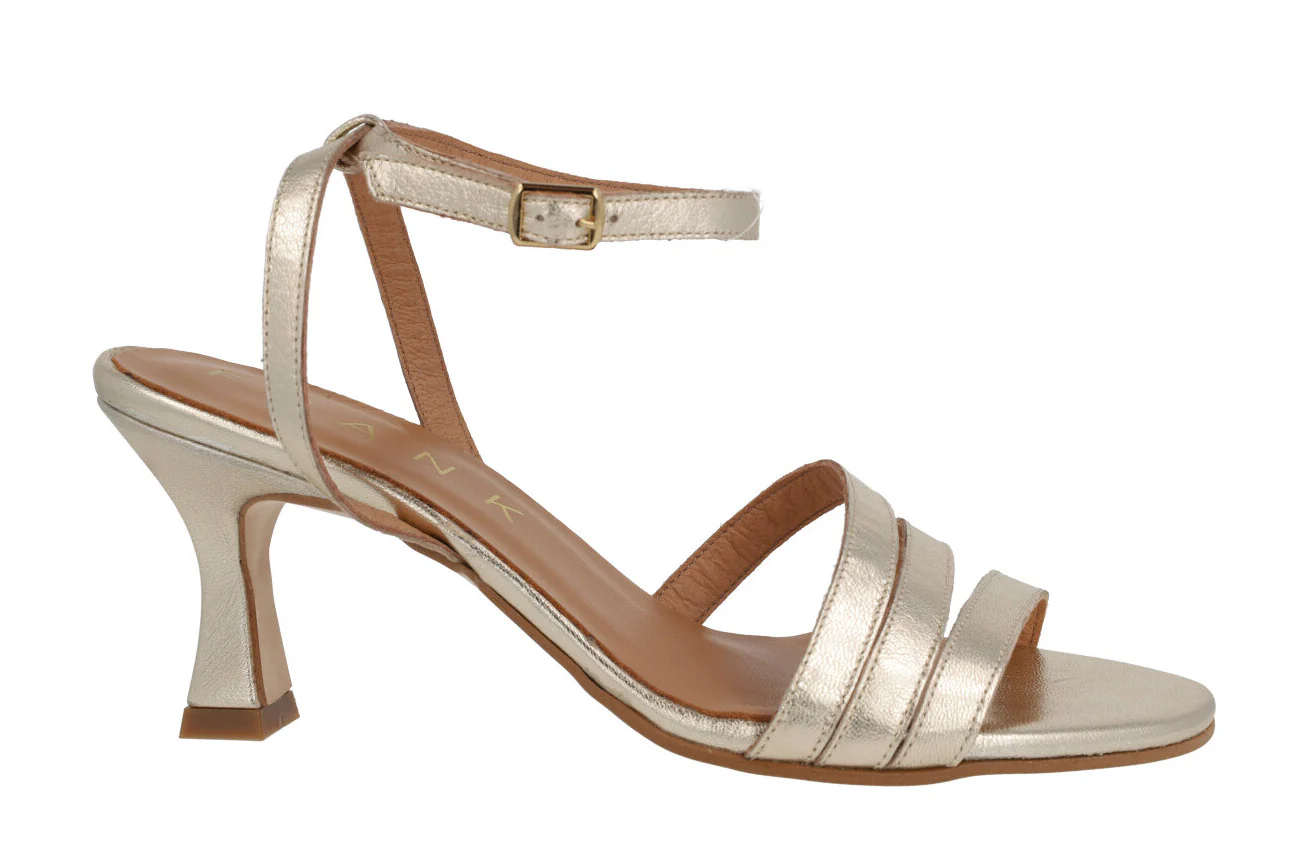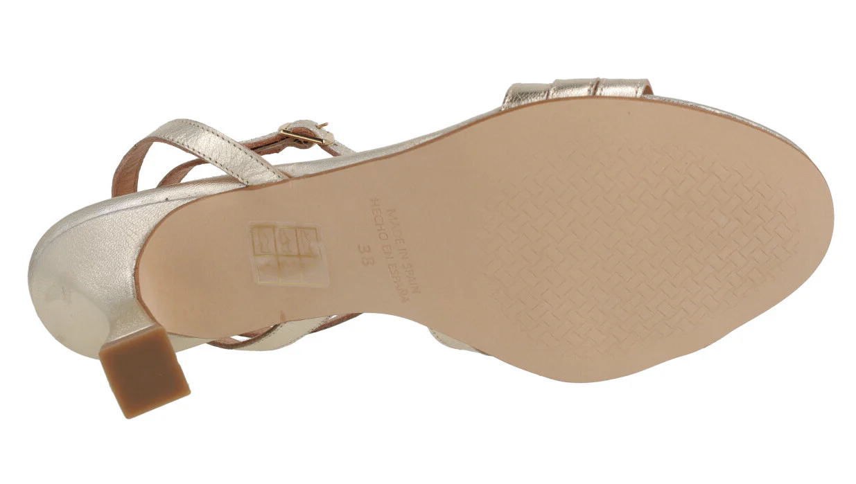 Elegantes sandalias para mujer de la marca española Design Frank, modelo 42438 Platino. Sandalias elaboradas en piel platino (oro clarito) con tres tiras delanteras y otra trasera que termina en una pulsera con cierre de hebilla que va al tobillo. Planta y forro de piel. Tacones forrados de 8 cms de altura. Made in Spain.
