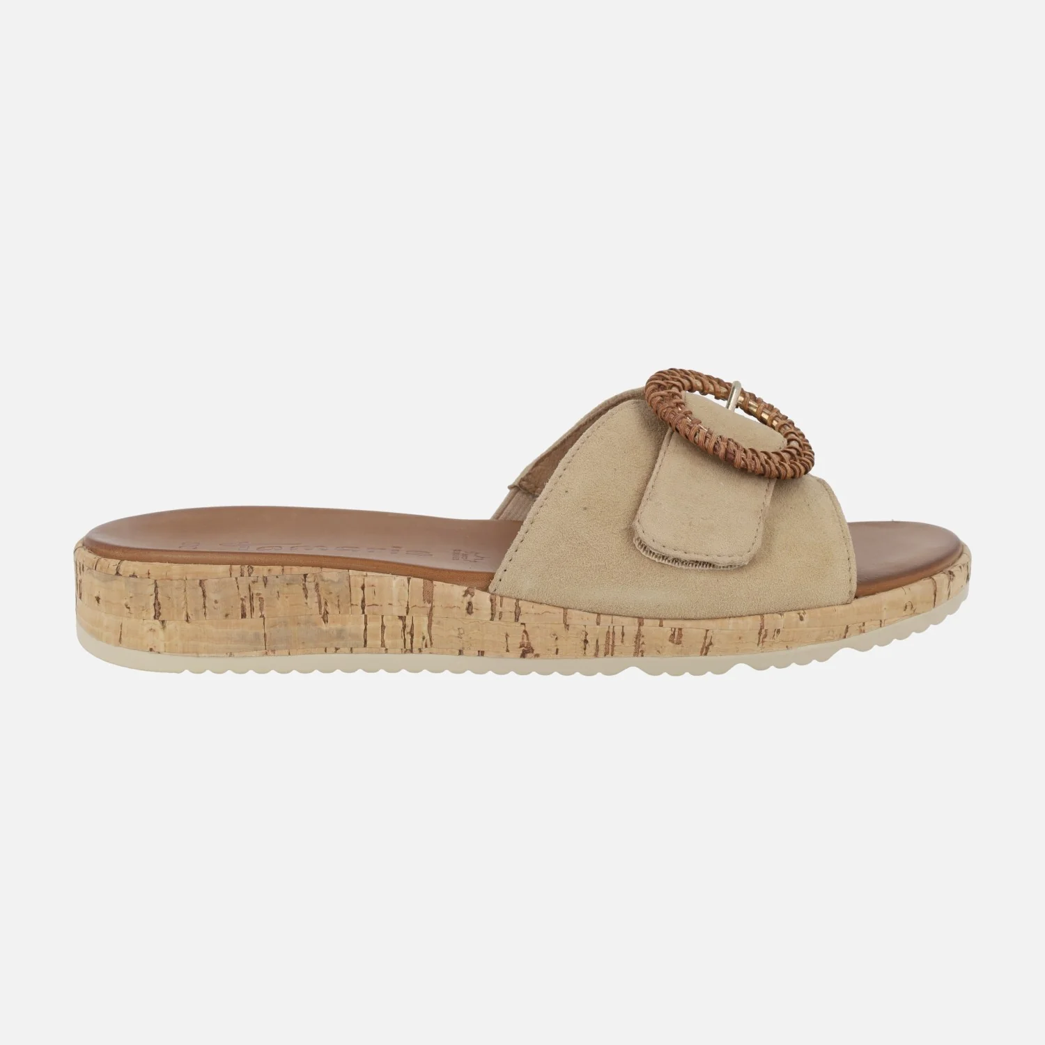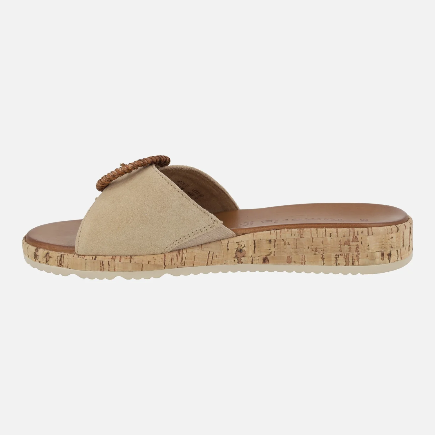 Sandalias estilo palas de la marca Tamaris, modelo 1-27123 Tan. Sandalias formadas por una tira ancha en piel serraje beige, con cierre de velcro y adorno de hebilla circular efecto rafia. Interiores forrados en tejido, con planta de piel. Pequeño elástico en la parte interior para un mayor ajuste. Entresuela efecto corcho, suela de goma. Altura de piso 3 cms en la parte trasera, 1,5 cms en la parte delantera.