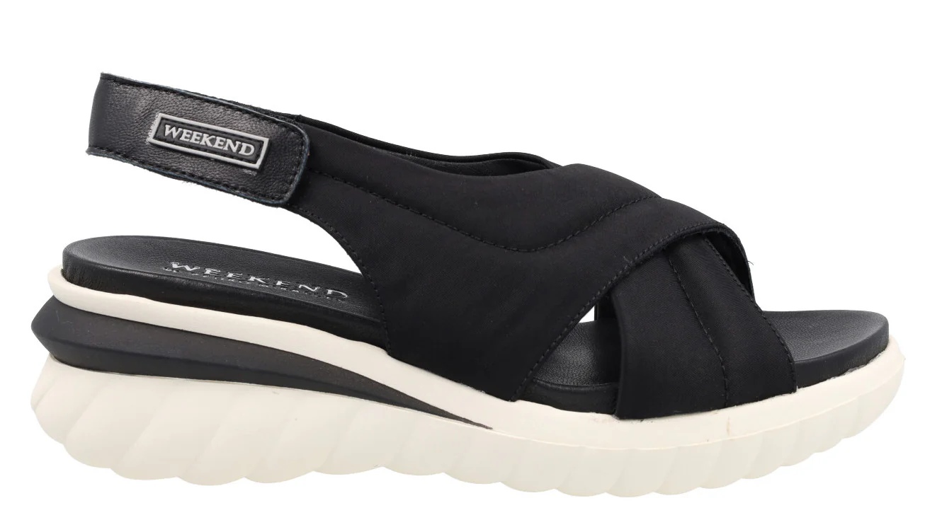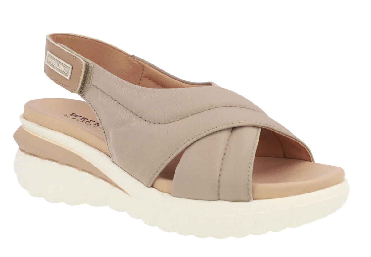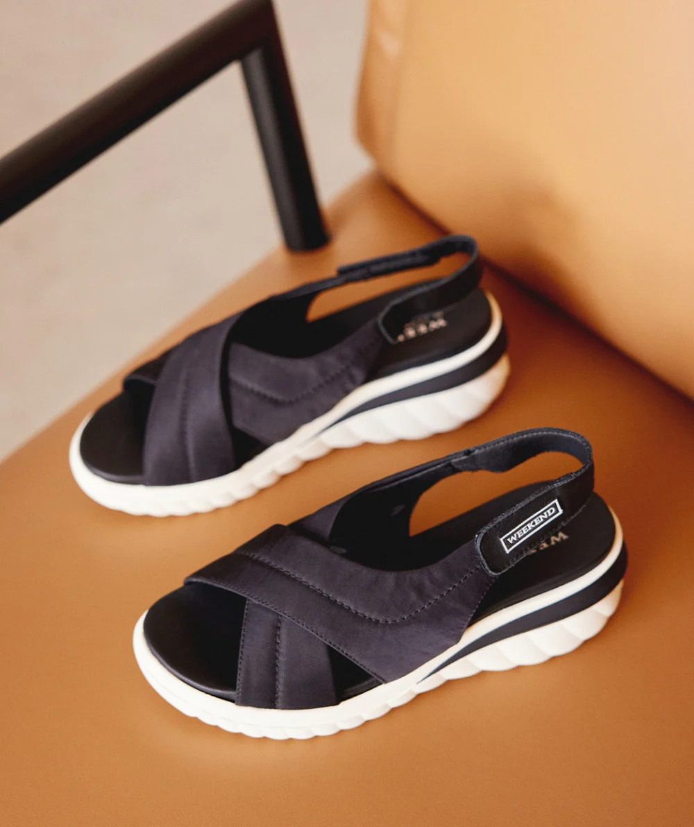 Sandalias para mujer de la marca Pedro Miralles Weekend, modelo 11177 Jena. Sandalias de tiras cruzadas elaboradas en tejido acolchado. Tira al talón de piel, con cierre de velcro. Interiores en combinado de piel y otros materiales. Piso de caucho, hace una ligera cuña de 6 cms de altura en la parte trasera (2 cms parte delantera). Disponibles en negro y en camel/beige. Made in Spain.