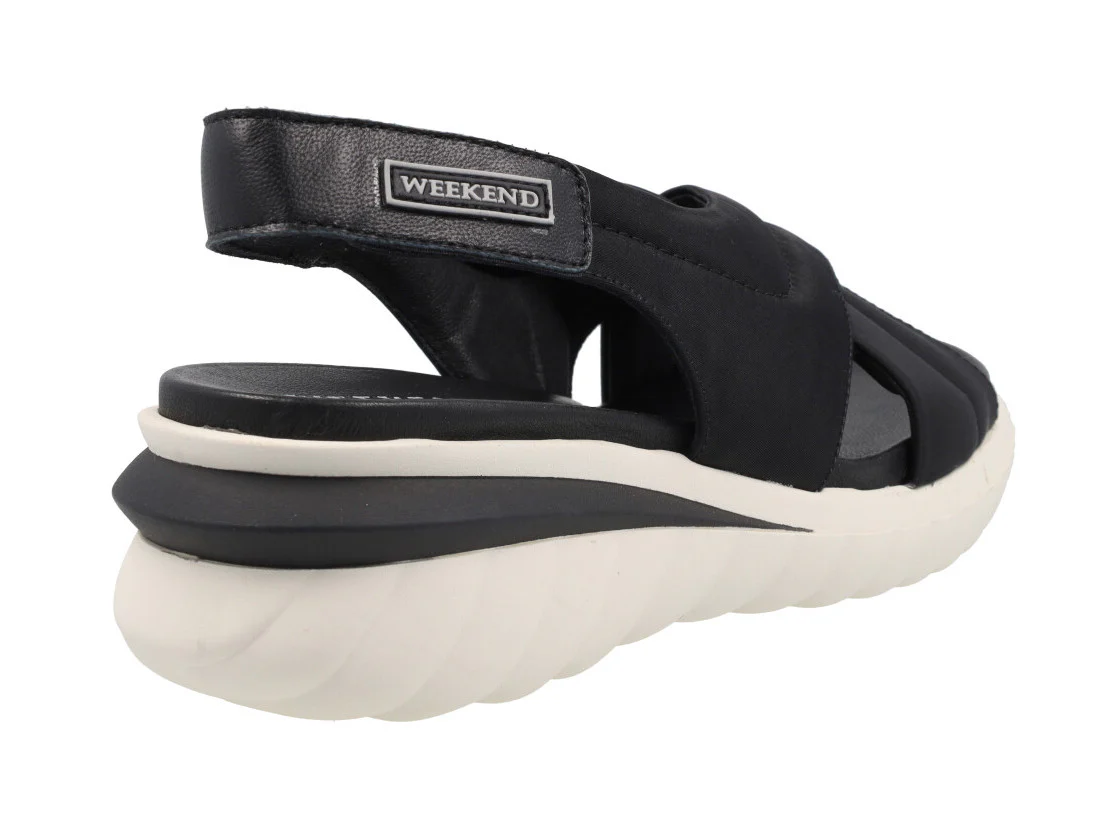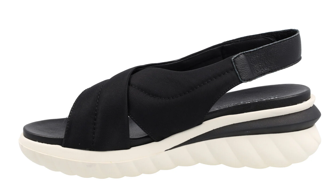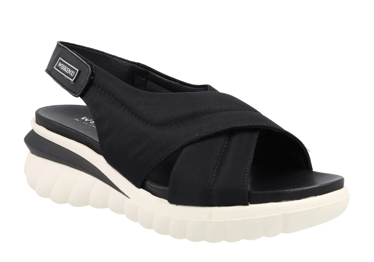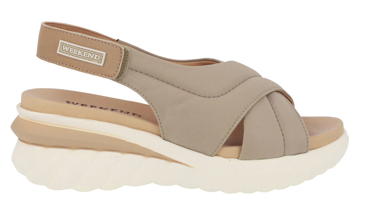 Sandalias para mujer de la marca Pedro Miralles Weekend, modelo 11177 Jena. Sandalias de tiras cruzadas elaboradas en tejido acolchado. Tira al talón de piel, con cierre de velcro. Interiores en combinado de piel y otros materiales. Piso de caucho, hace una ligera cuña de 6 cms de altura en la parte trasera (2 cms parte delantera). Disponibles en negro y en camel/beige. Made in Spain.