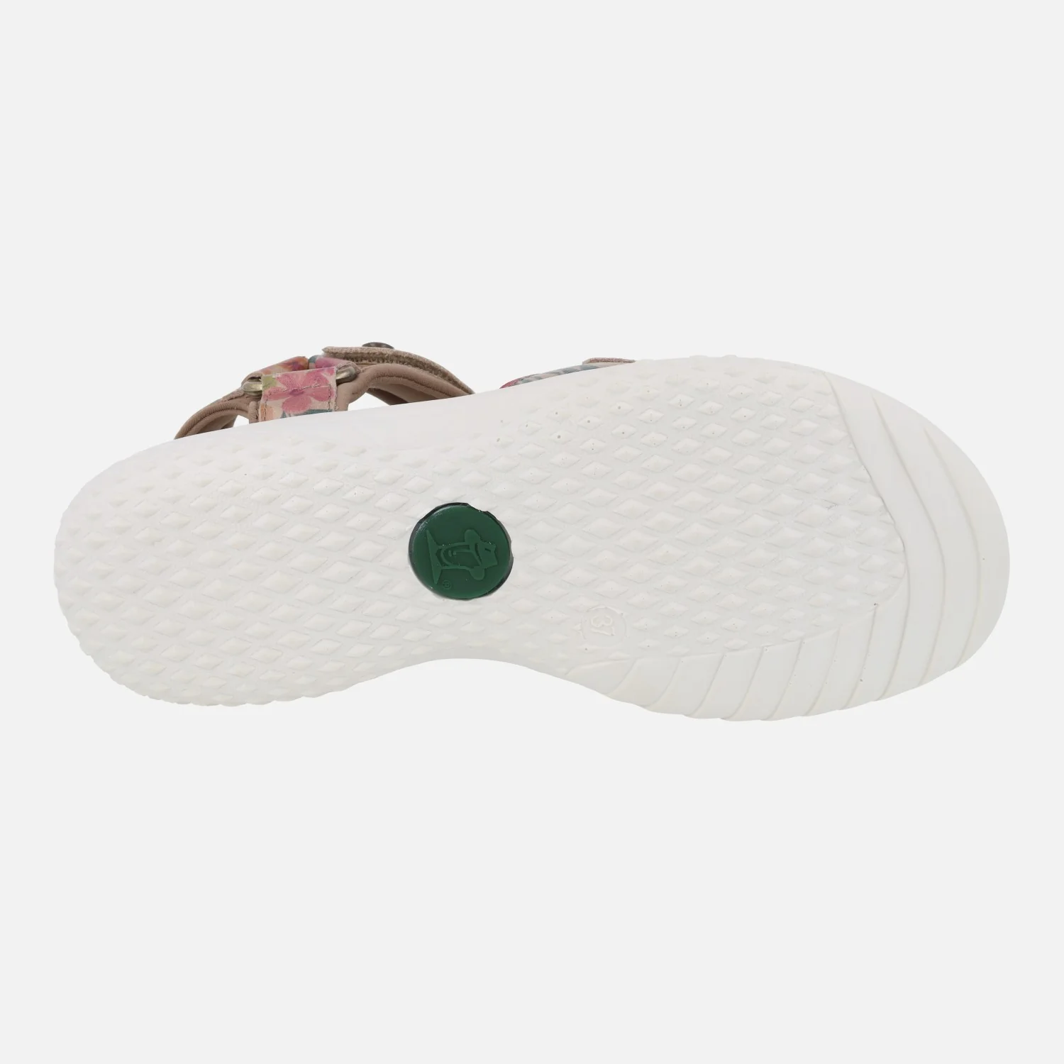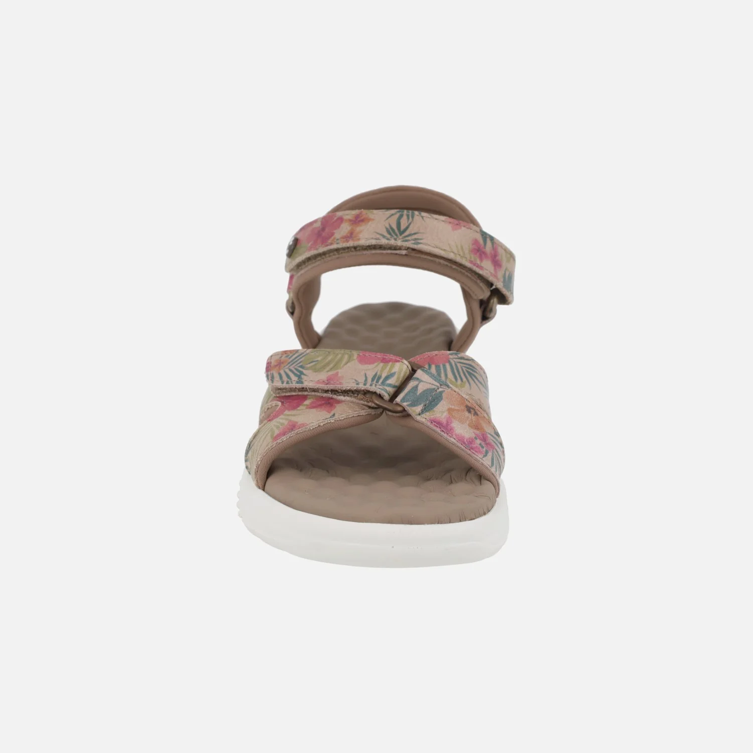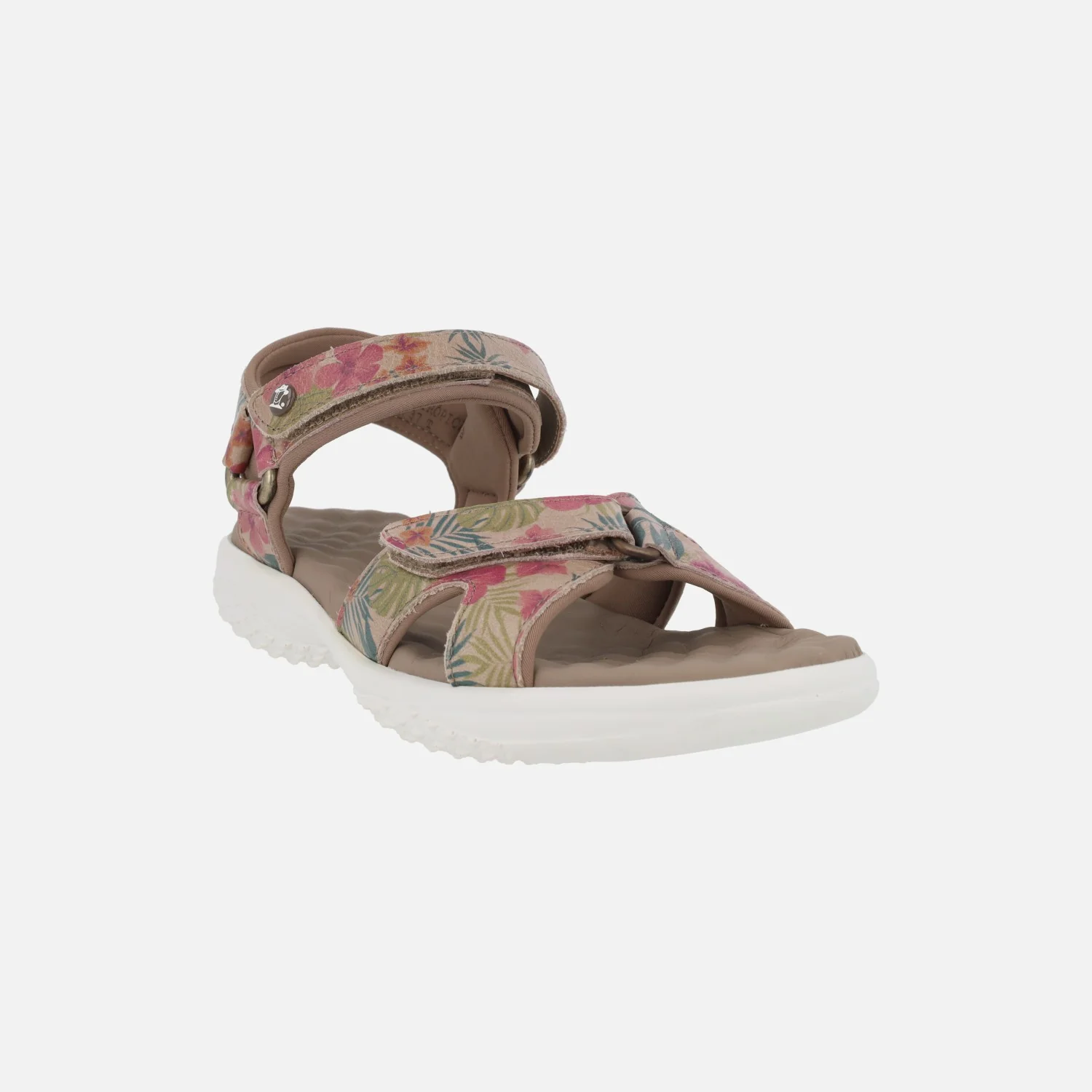 Sandalias para mujer de la marca española Panama jack, modelo Noja tropical B2 Cuerda. Sandalias de piel con fondo de color taupe y estampado de flores multicolor. Cierre de velcro ajustable, tanto en la parte delantera como al tobillo. Interiores forrados en tejido lycra, con planta forrada de piel y con sistema Softsystem, para una gran amortiguación al caminar. Suela de poliuretano, de aproximadamente 4 cm de altura trasera (2 cm parte delantera). Made in Spain.