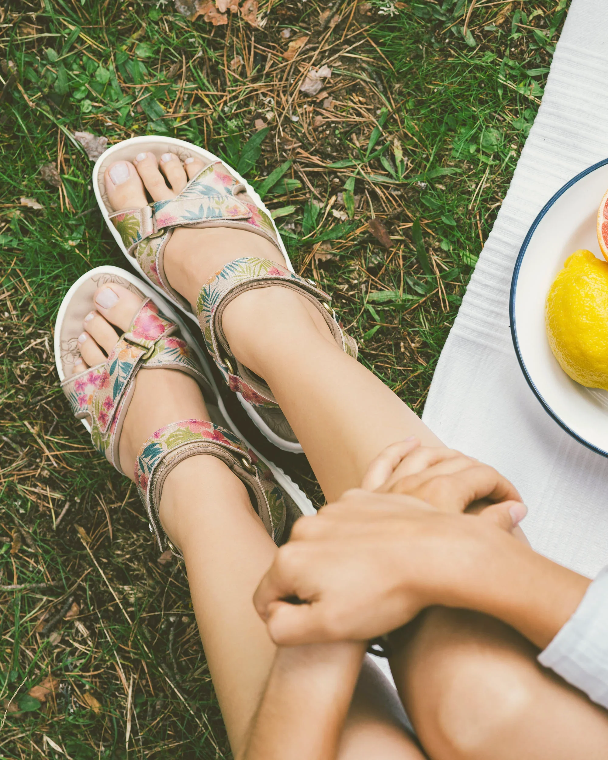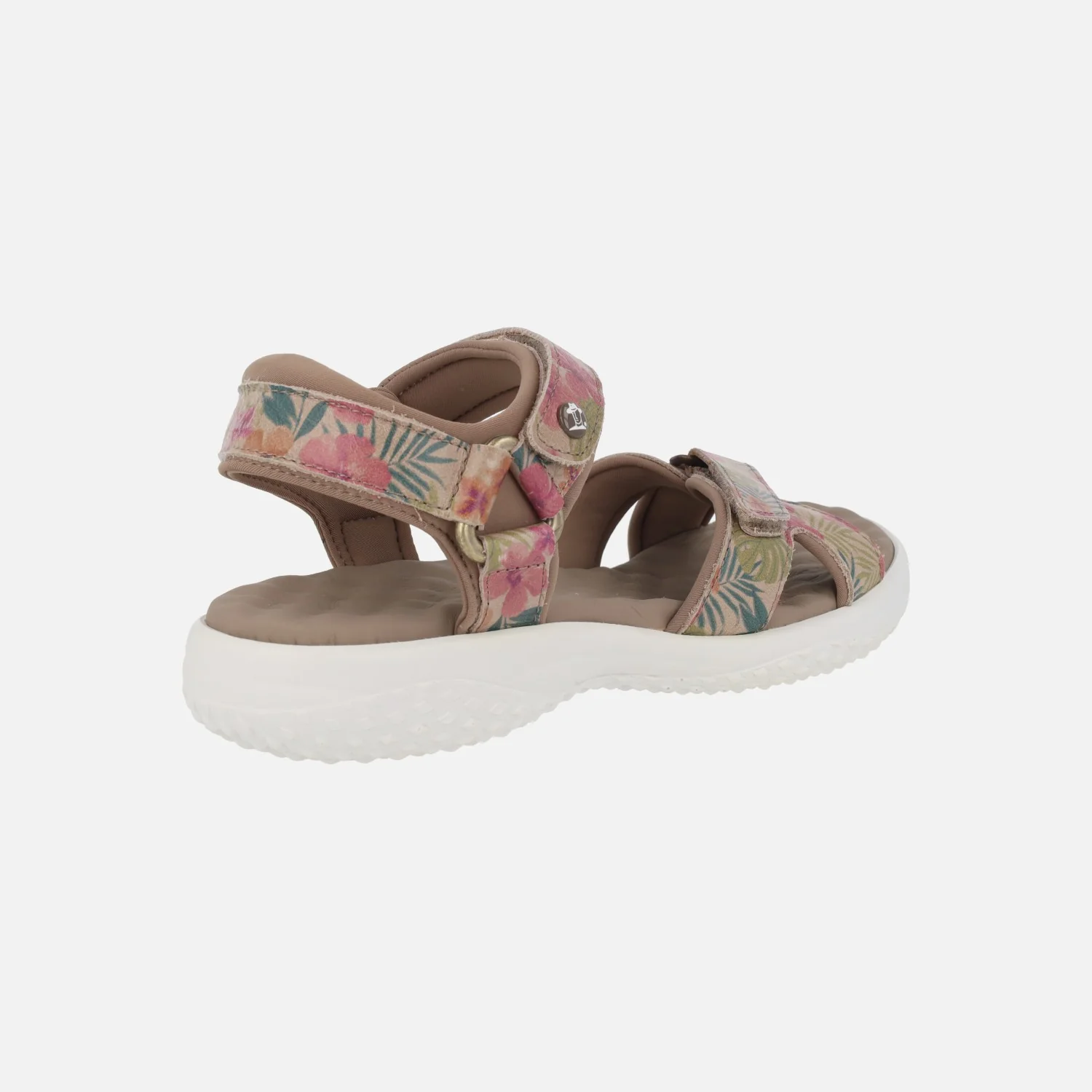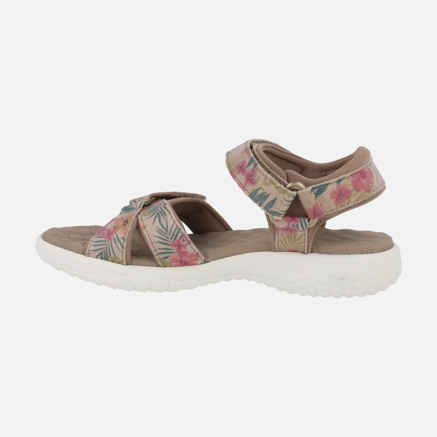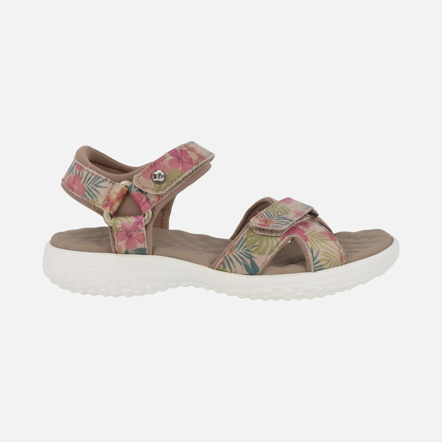 Sandalias para mujer de la marca española Panama jack, modelo Noja tropical B2 Cuerda. Sandalias de piel con fondo de color taupe y estampado de flores multicolor. Cierre de velcro ajustable, tanto en la parte delantera como al tobillo. Interiores forrados en tejido lycra, con planta forrada de piel y con sistema Softsystem, para una gran amortiguación al caminar. Suela de poliuretano, de aproximadamente 4 cm de altura trasera (2 cm parte delantera). Made in Spain.