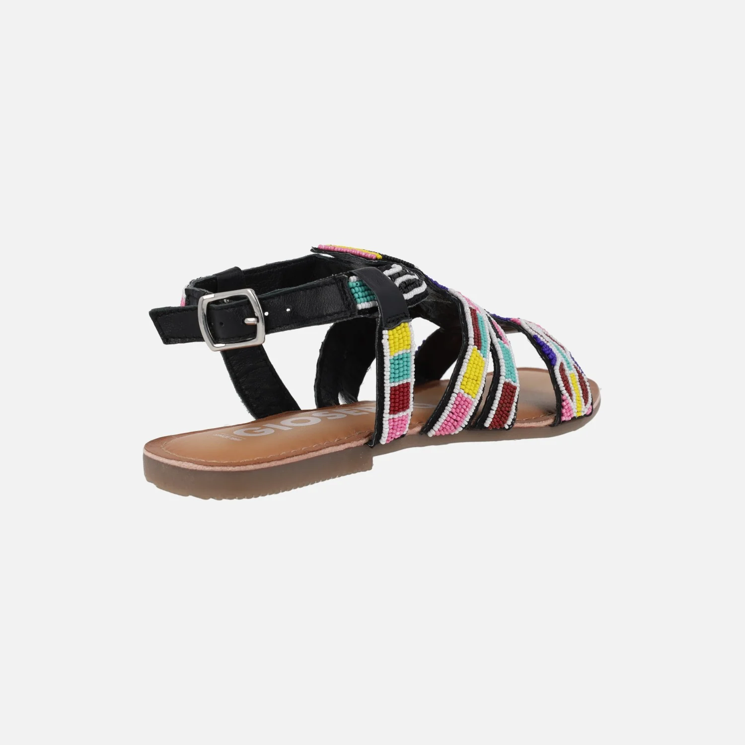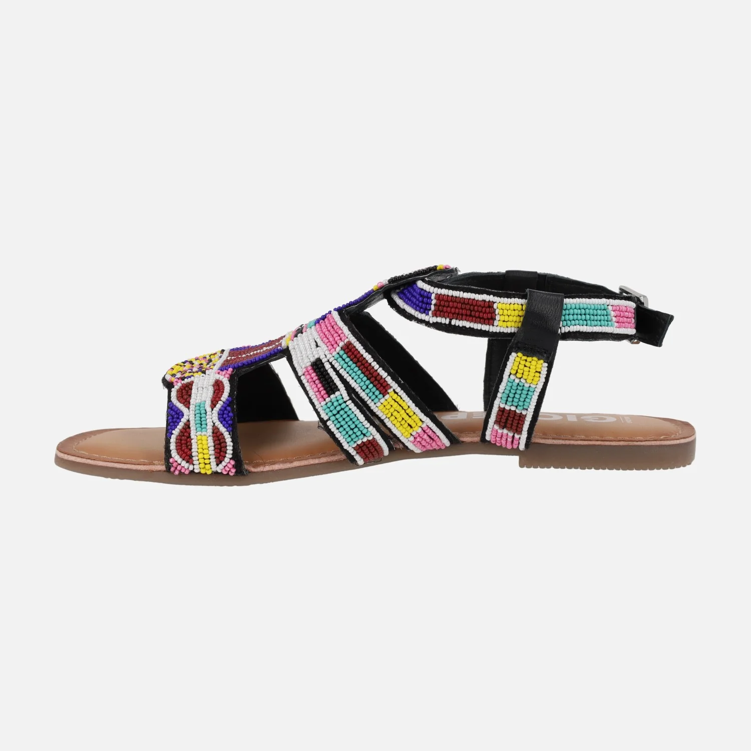Preciosas sandalias de estilo étnico modelo Raccuja 71773 multicolor, de la marca Gioseppo. Sandalias de piel con abalorios de colores y cierre de hebilla al tobillo. Forro y planta de piel. Piso plano sintético.