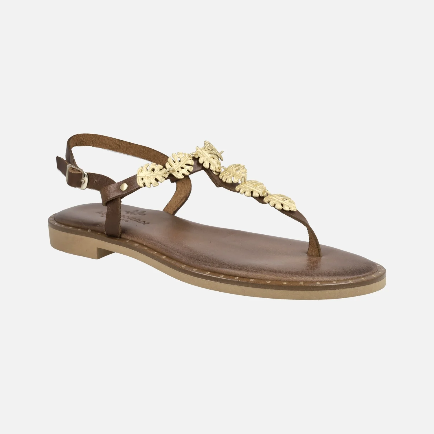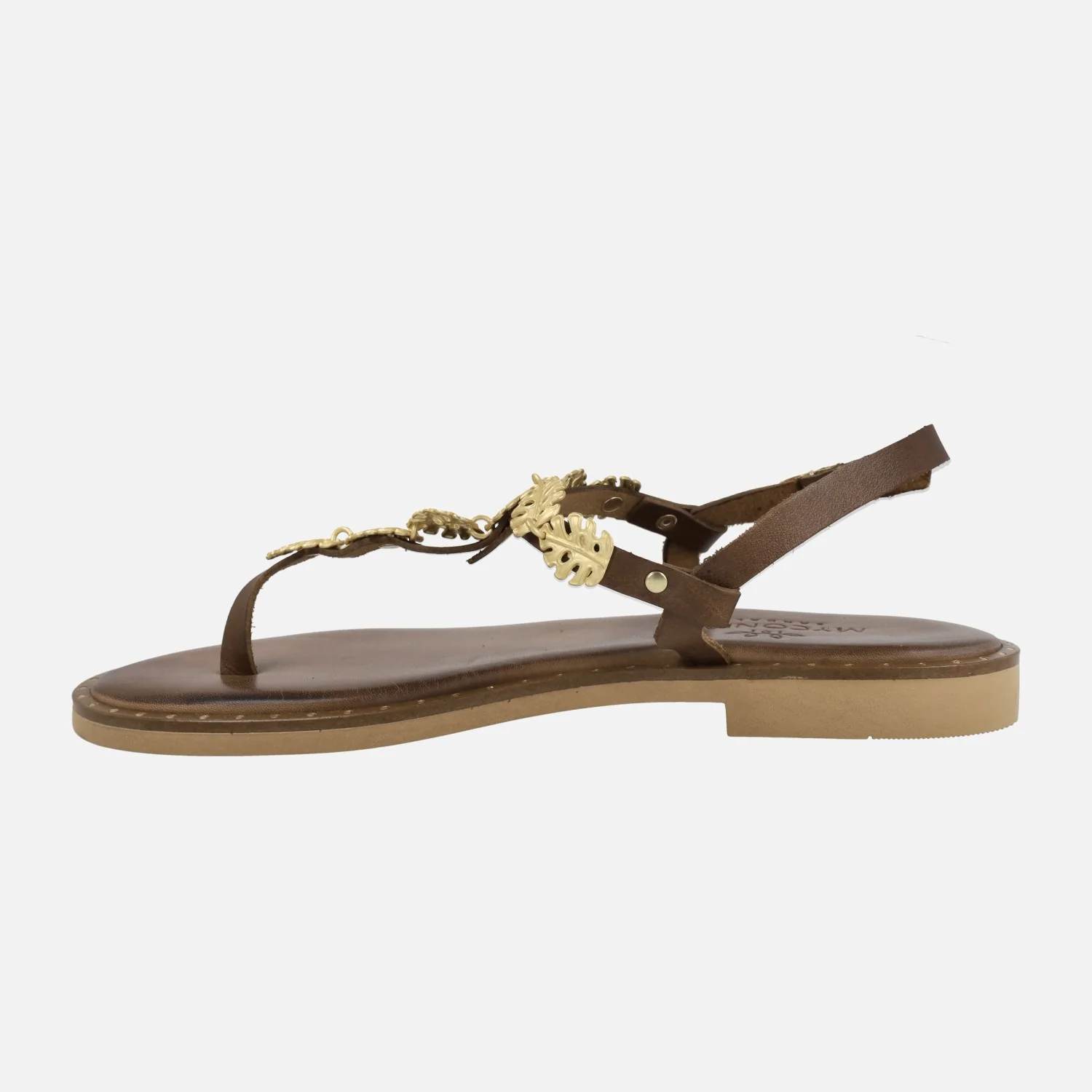 Sandalias griegas planas tipo esclavas de la marca Myconian, modelo 221587 en Piel Marrón. Es muy vistoso el detalle de hojas entrelazadas metálicas a lo largo de la pala. Lleva una tira al talón que cierra con una hebilla dorada. El interior y la plantilla son de piel, con piso de goma delgado que la hace mas flexible. Lleva unas tachas adornando el cerco.