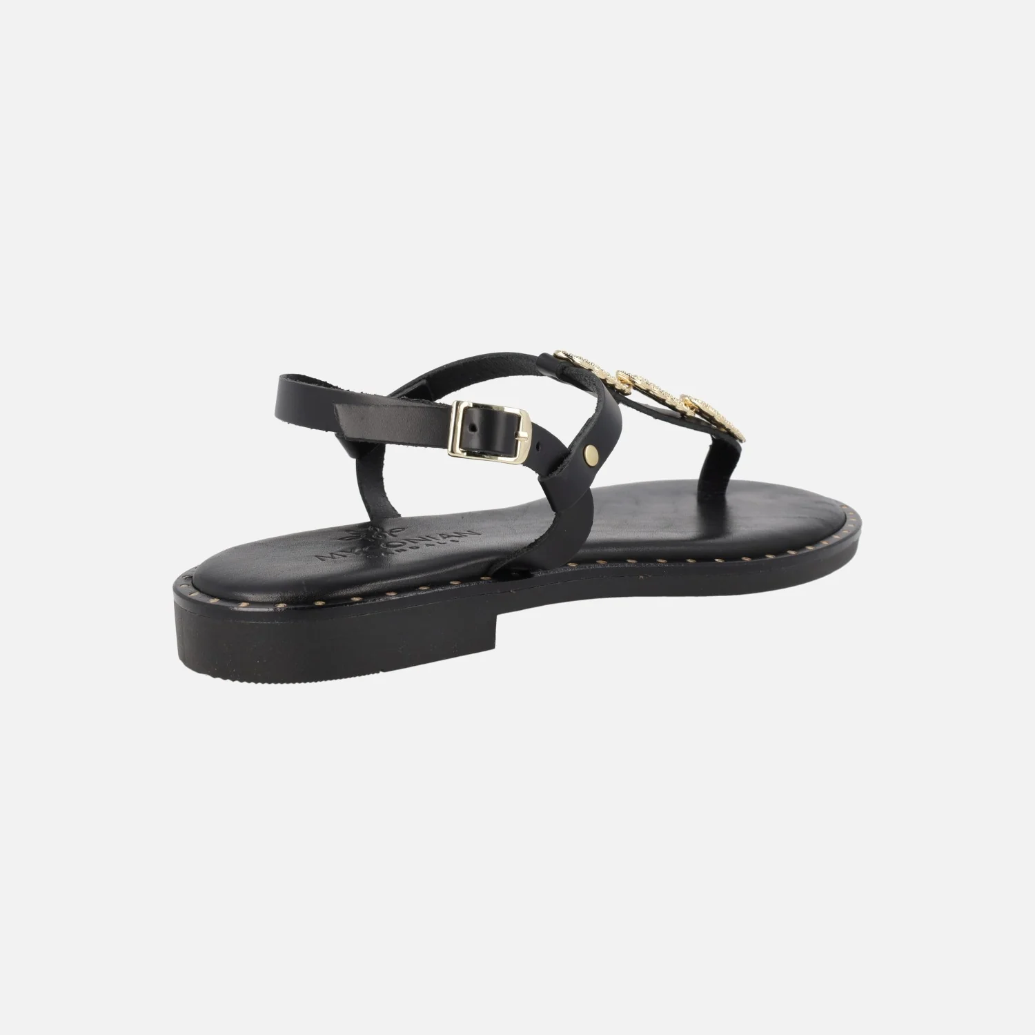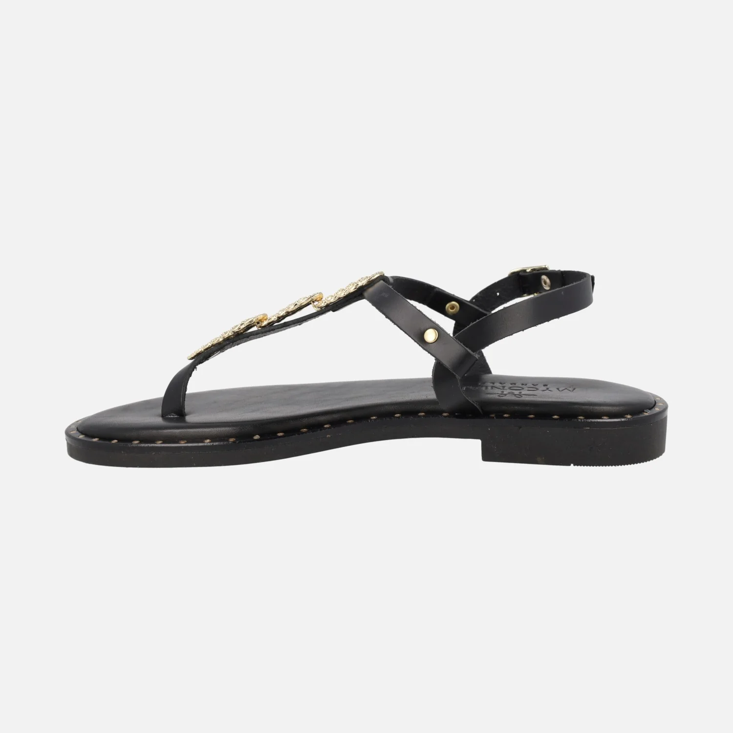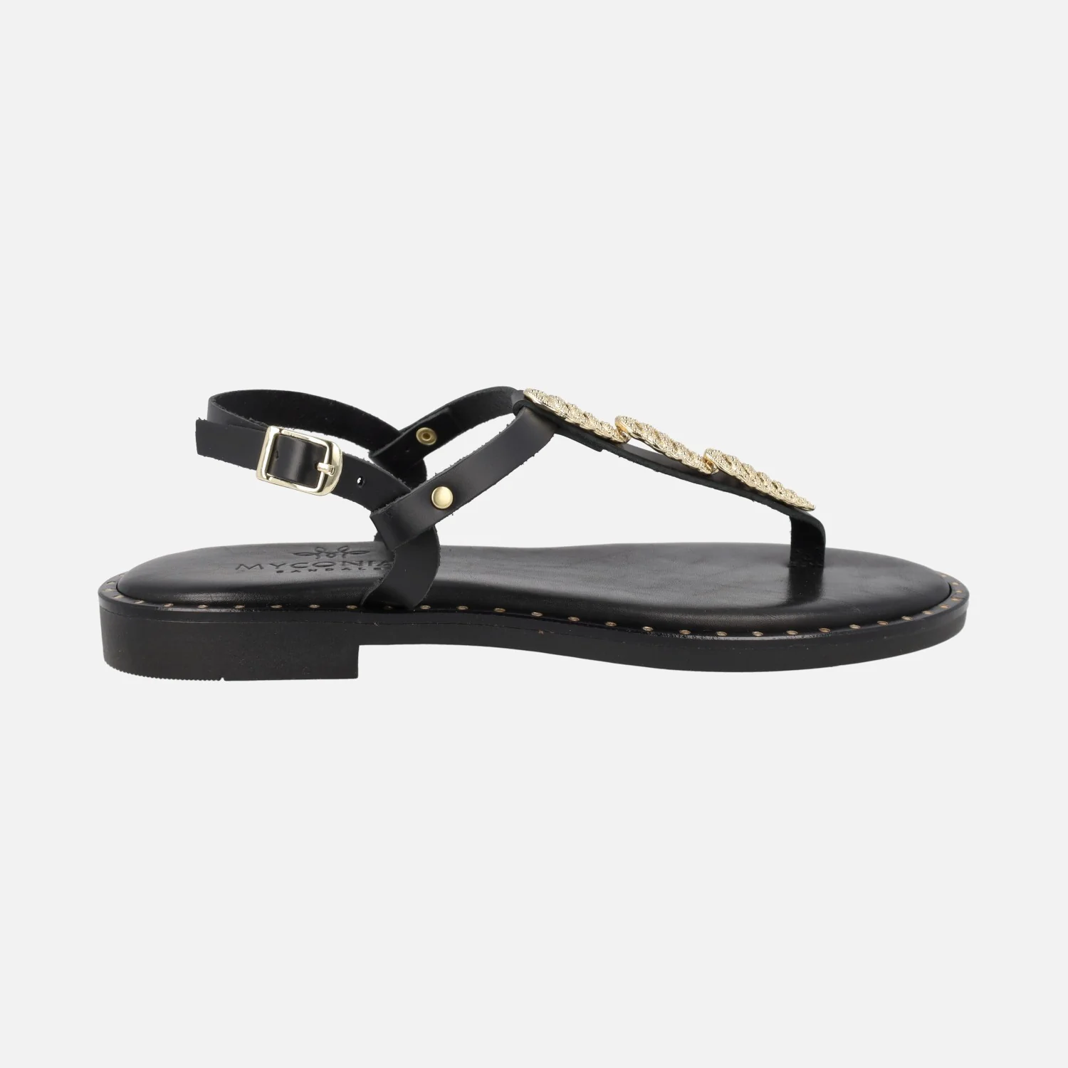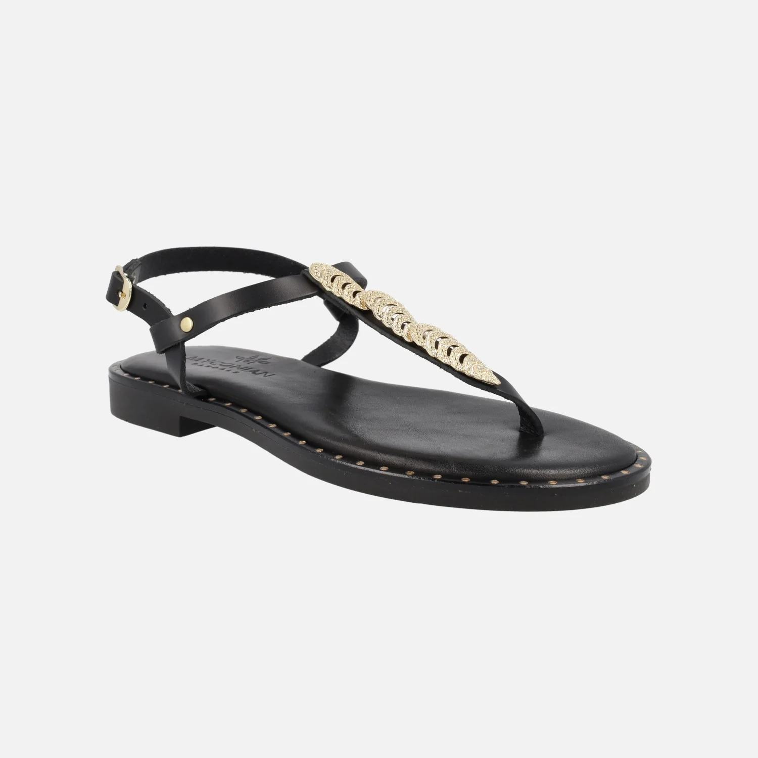 Sandalias griegas planas de la marca Myconian, modelo 221580. Tienen un adorno metálico engarzado en la tira del empeine en color dorado. Este modelo es tipo esclava y lleva una tira al empeine para cerrar con hebilla también dorada. Interior y plantillas son de piel y tiene un piso delgado de goma, con tacón de 2 cms. de altura