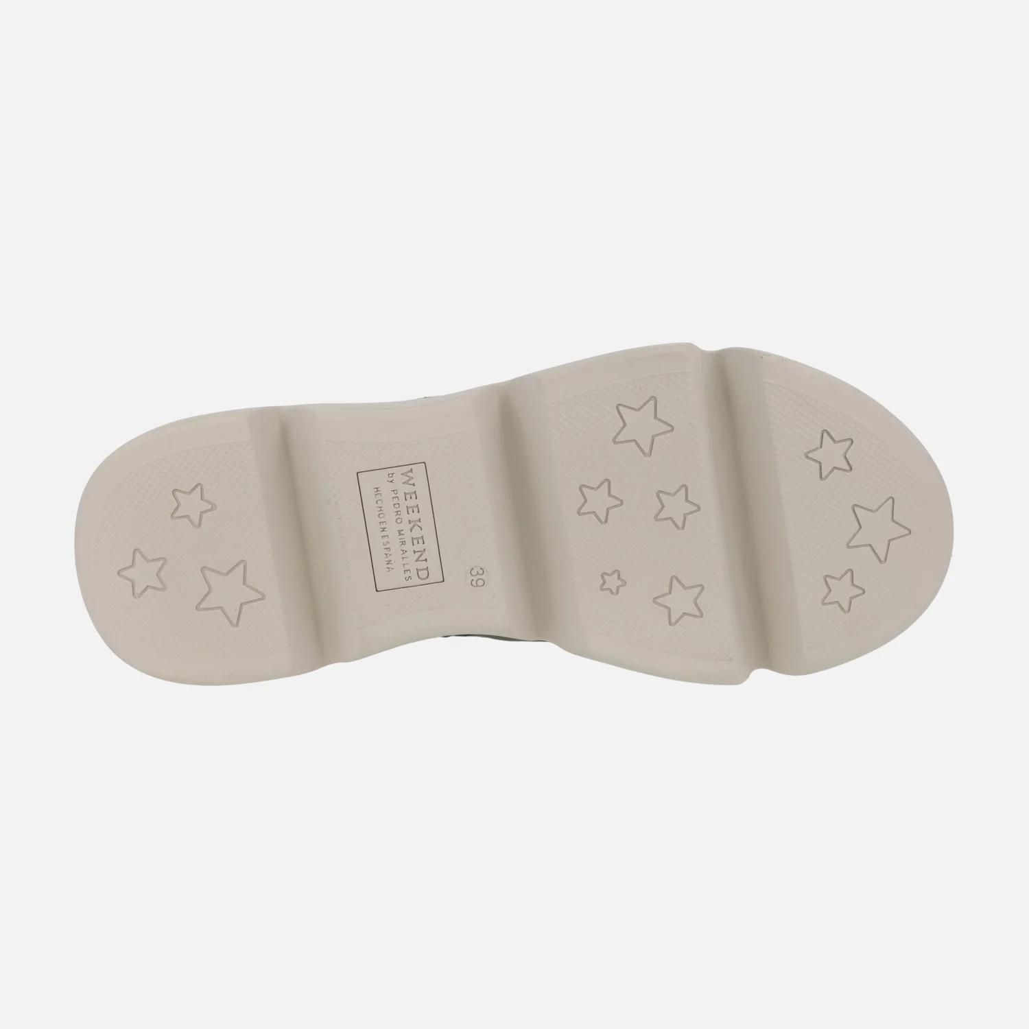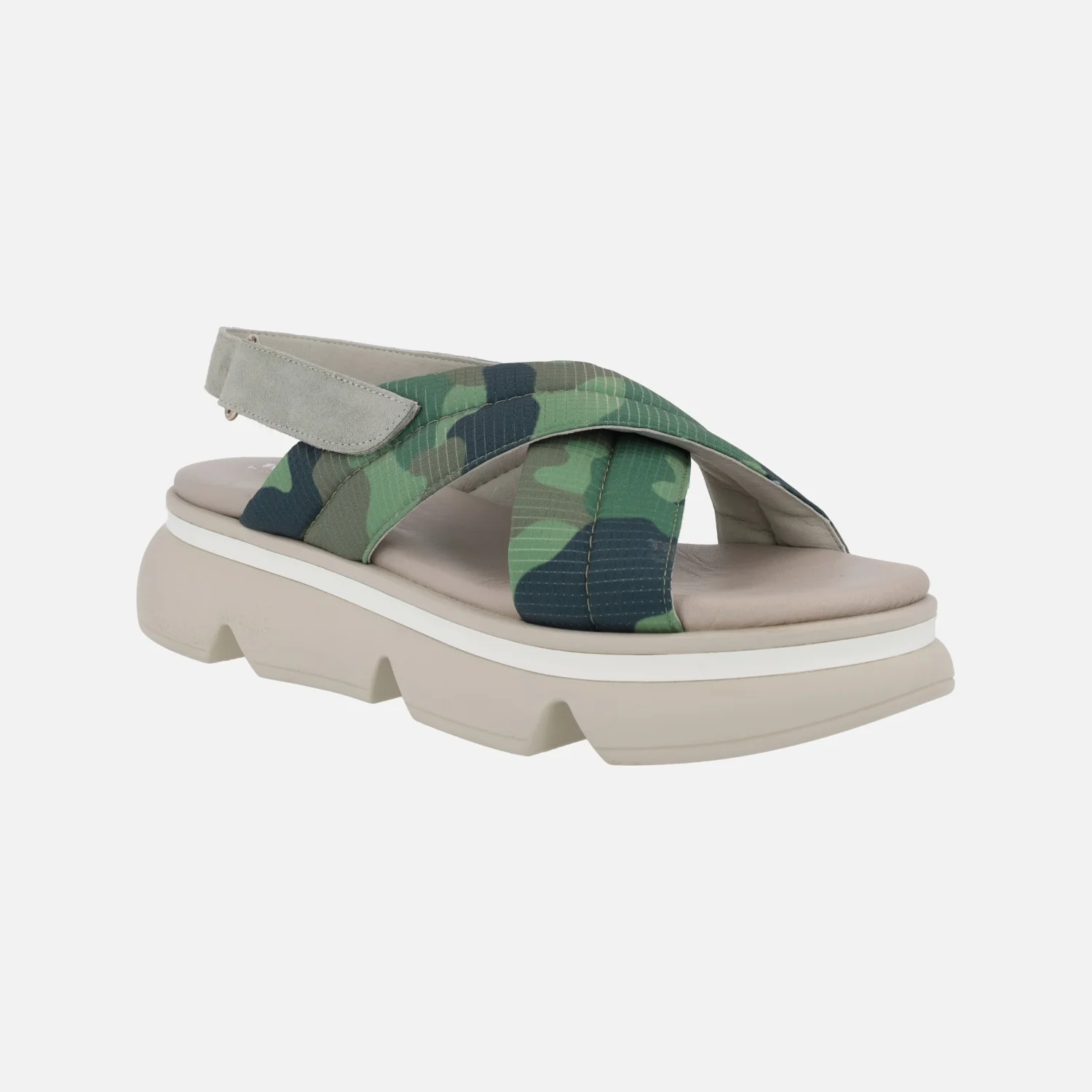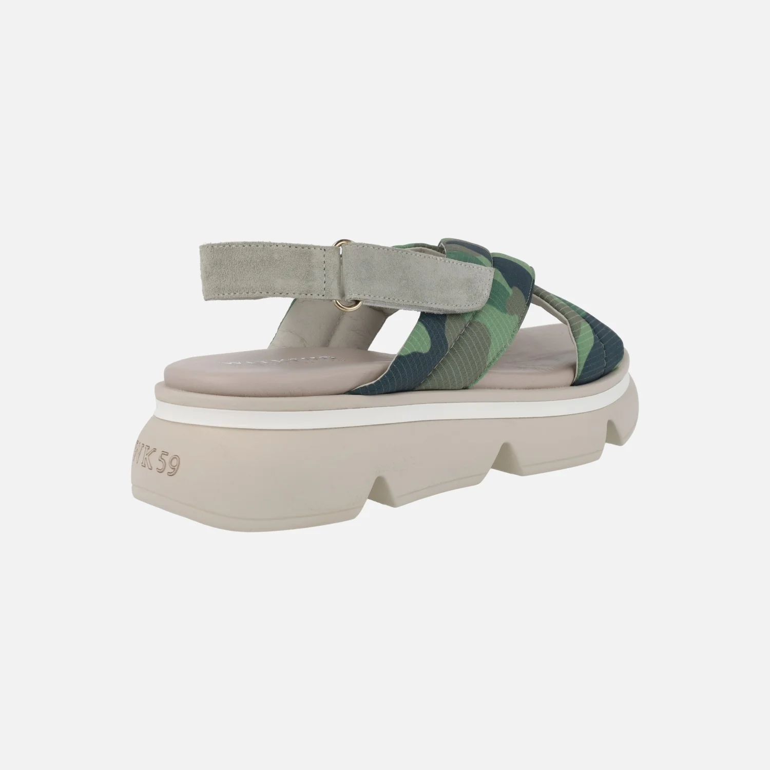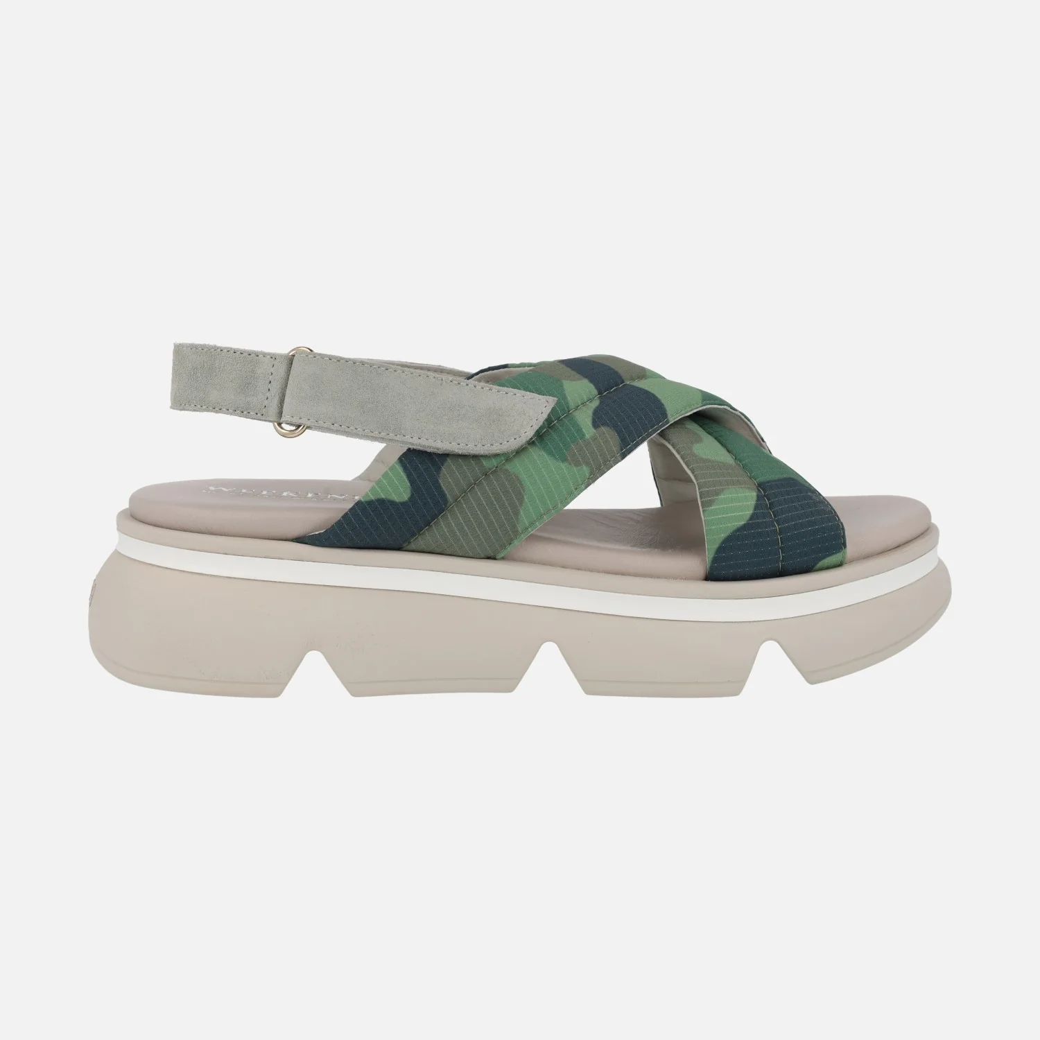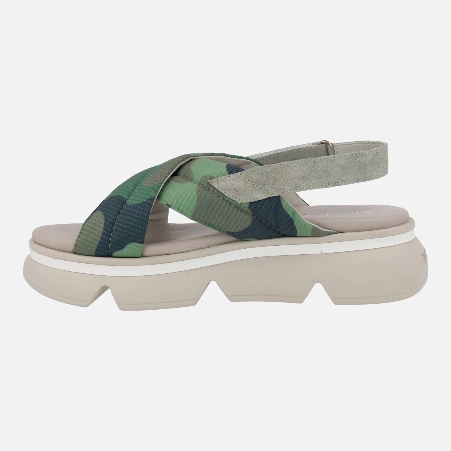 Sandalias deportivas para mujer de la marca Pedro Miralles línea Weekend modelo 12027 Mimetico kakis. Sandalias elaboradas en tejido acolchado con print de camuflaje en tonos verdes. Tira al talón en serraje con cierre de velcro. Interior mixto en piel y otros materiales. Plataforma de goma, con 6 cms de altura trasera (4 cms en la parte delantera). Made in Spain.