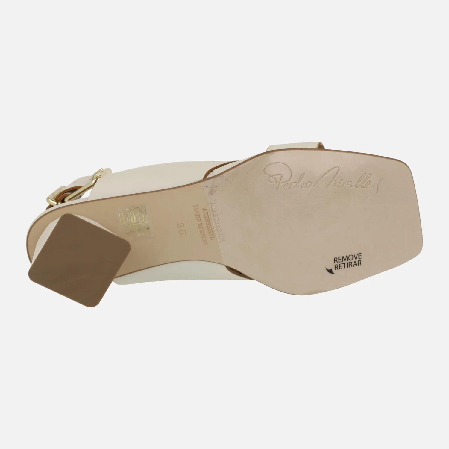 Sandalias de piel modelo Manarola 14108 Off de la marca española Pedro Miralles. Sandalias elaboradas en piel hielo (blanco roto) con detalle de tira ancha delantera troquelada haciendo dibujo. Tira al talón con cierre de hebilla dorada. Interiores de piel. Tacones bajos y anchos, geométricos, de 7 cms de altura. Made in Spain.