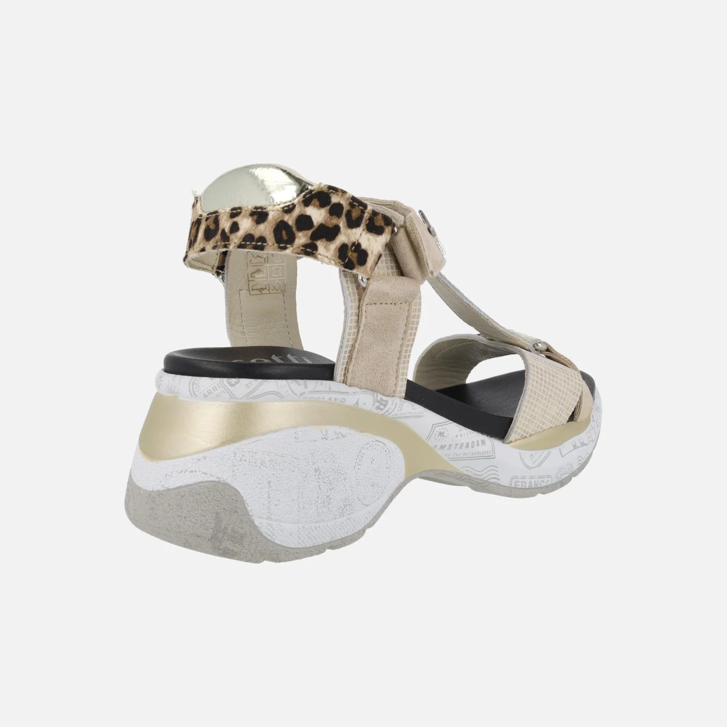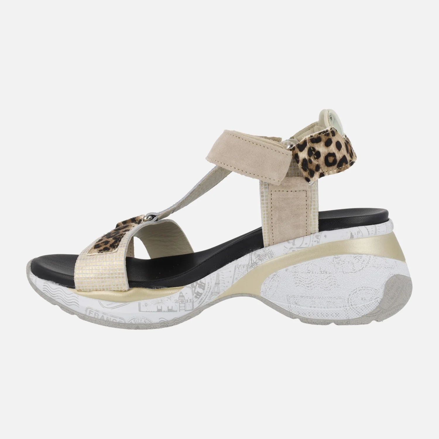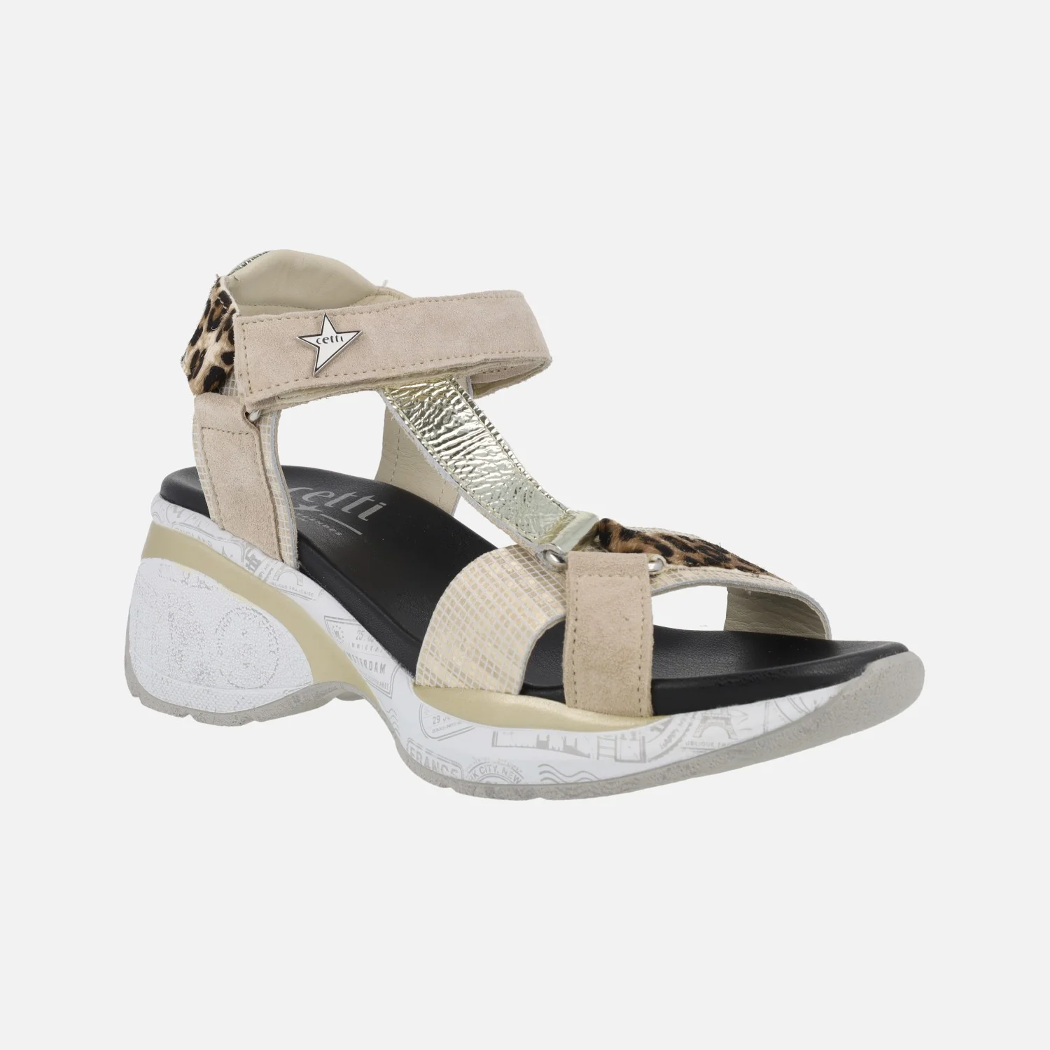 Sandalias de estilo deportivo para mujer de la marca Cetti modelo 1317 Ante-Leo Sable. Sandalias elaboradas en piel con distintos acabados: print leopardo, piel serraje, piel grabada… en combinado beige y animal print. Cierre de velcro. Interiores forrados de piel. Piso sintético, con una altura trasera de 7 cms (3 cms parte delantera).